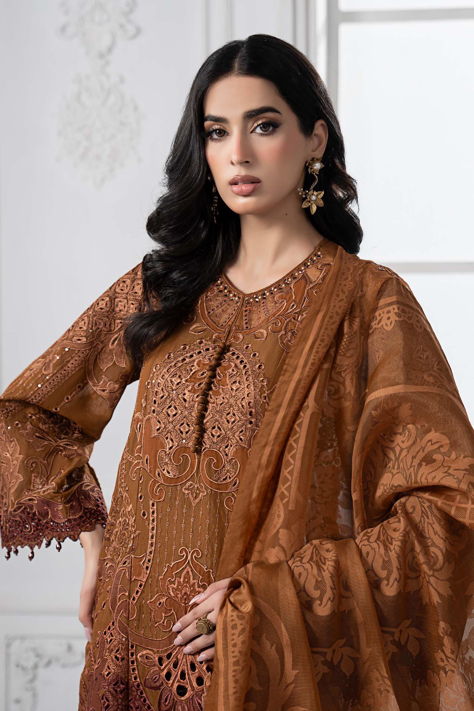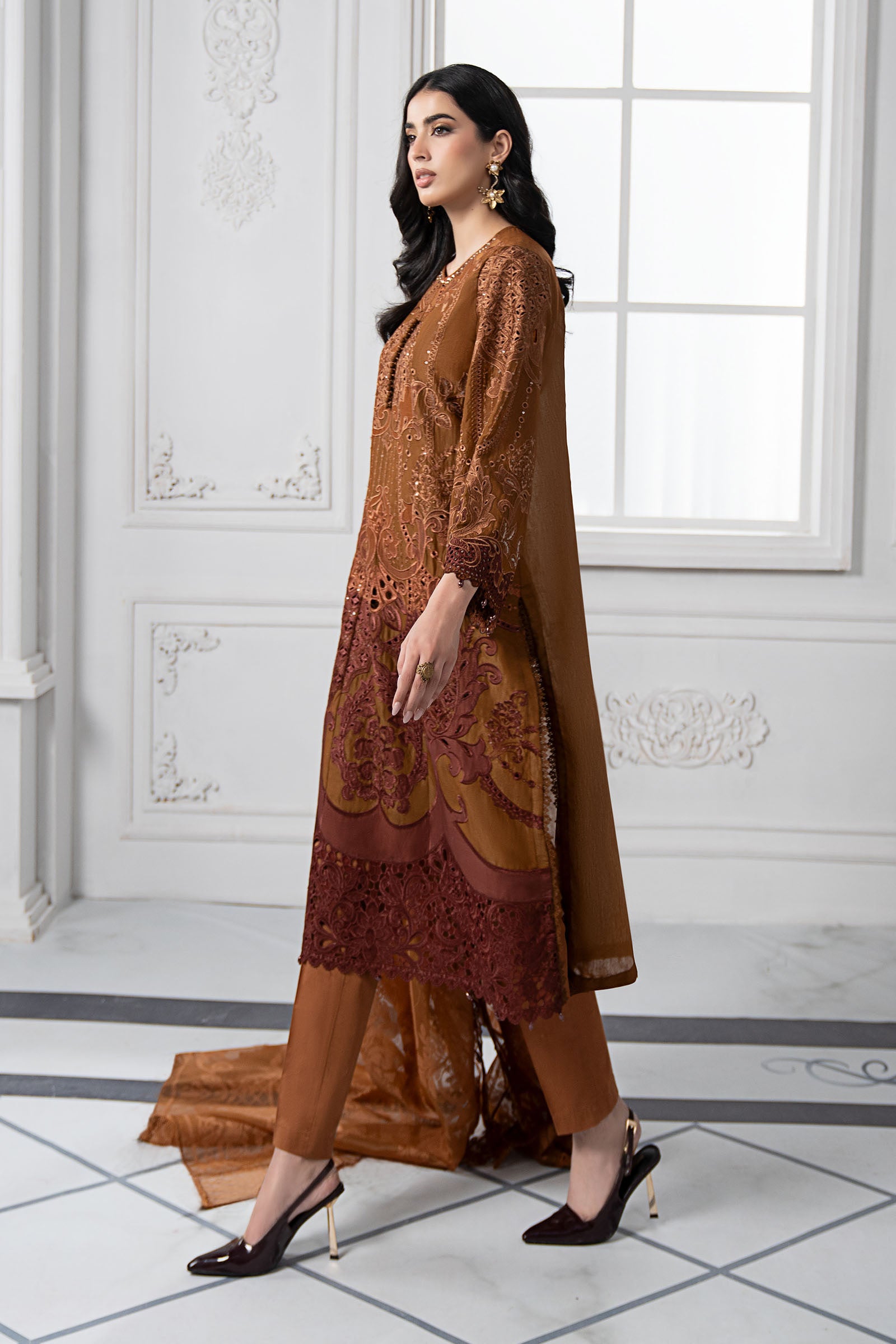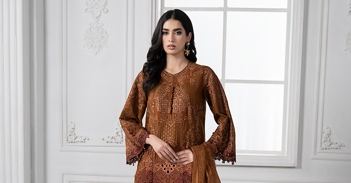 ShirtStraight-Cut ShirtEmbroidered Organza Neckline With Loop Buttons & Stickon Pearls DetailingEmbroidered Front Center Panel With Printed Lawn Applique DetailingEmbroidered Front Side Panels With Printed Lawn Applique DetailingEmbroidered Organza BorderFull-Length Embroidered Sleeves With Embroidered Organza BorderPearl Drop Detailing On Sleeves & BorderDyed BackFabric: Paper CottonColor: RustTrousersDyed Straight TrousersElasticated WaistbandFabric: CambricColor: RustDupattaDyed Burnout DupattaTwo-Side Embroidered Organza BorderTwo-Side Lace BorderFabric: NetColor: RustModel is wearing xs size Note: Dry Clean Only