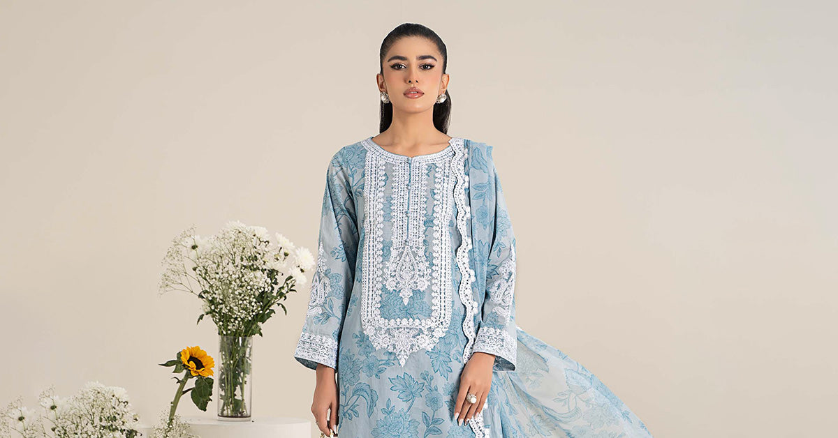 ShirtPrinted Straight Cut ShirtRound Embroidered Neckline With Buttons DetailingFull Printed Sleeves With Embroidered BorderFit: RegularColor: BlueFabric: LawnTrousersPrinted ShalwarElasticated WaistbandEmbroidered HemFit: RegularColor: BlueFabric: CambricDupatta Printed DupattaFour-Side Embroidered DupattaColor: BlueFabric: ChiffonWork Details: Sequins & Thread EmbroideryModel is wearing xs sizeNote: Dry Clean Only