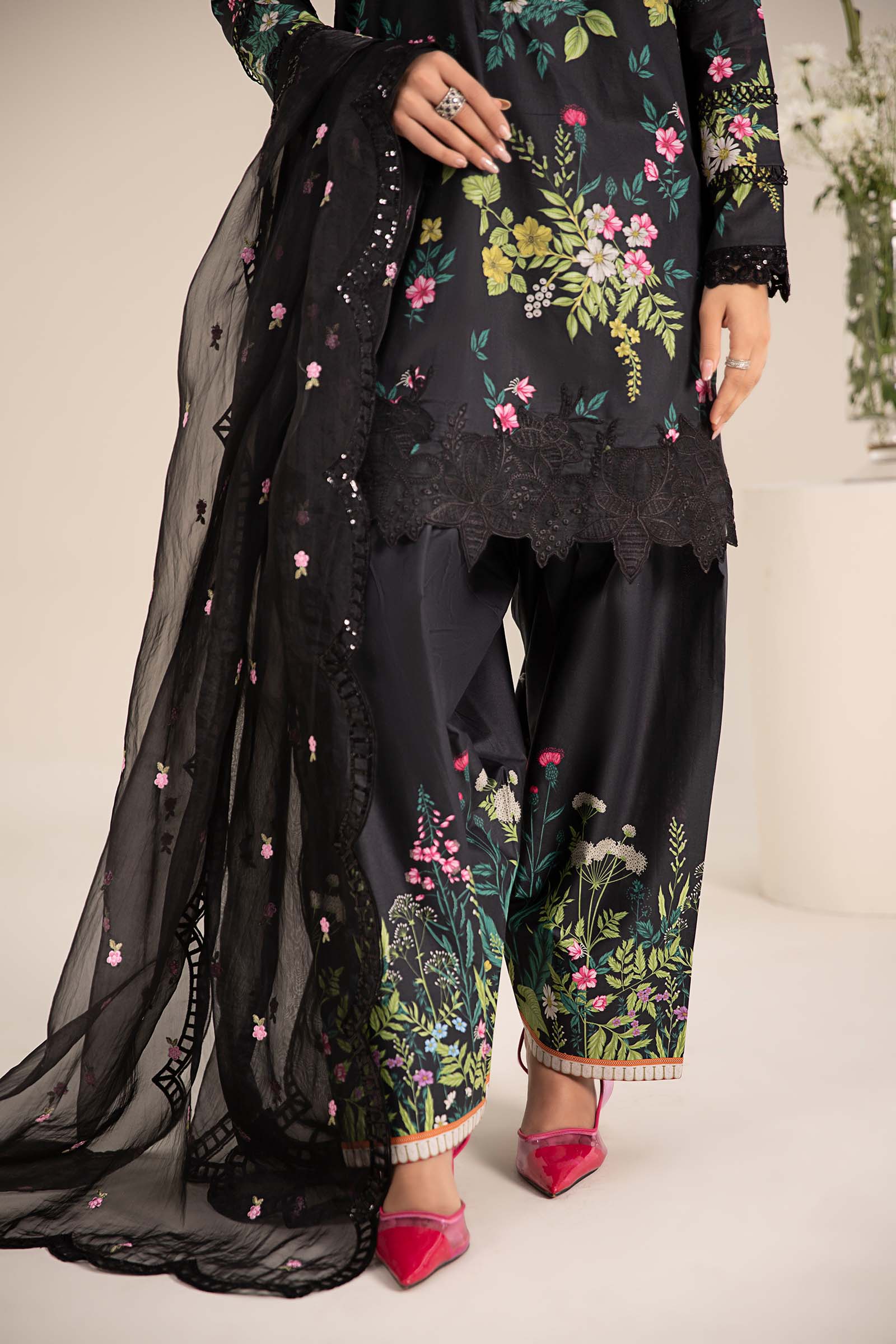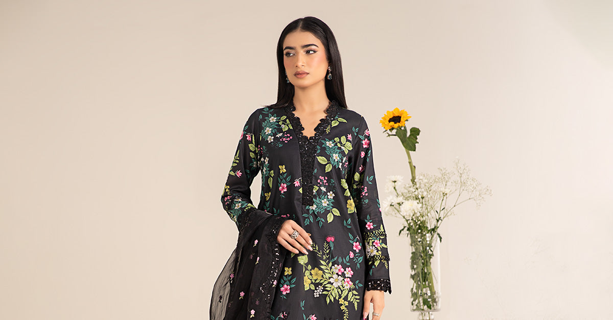 ShirtPrinted Short ShirtEmbroidered Overlap NecklineEmbroidered Organza Front BorderFull Sleeves With Lace Embroidered BorderFit: RegularColor: BlackFabric: LawnShalwarPrinted ShalwarElasticated WaistbandFit: RegularColor: BlackFabric: CambricDupatta Dyed Embroidered DupattaFour-Side Embroidered Scalloped BorderColor: BlackFabric: OrganzaWork Details: Thread & Sequins EmbroideryModel is wearing xs sizeNote: Dry Clean Only