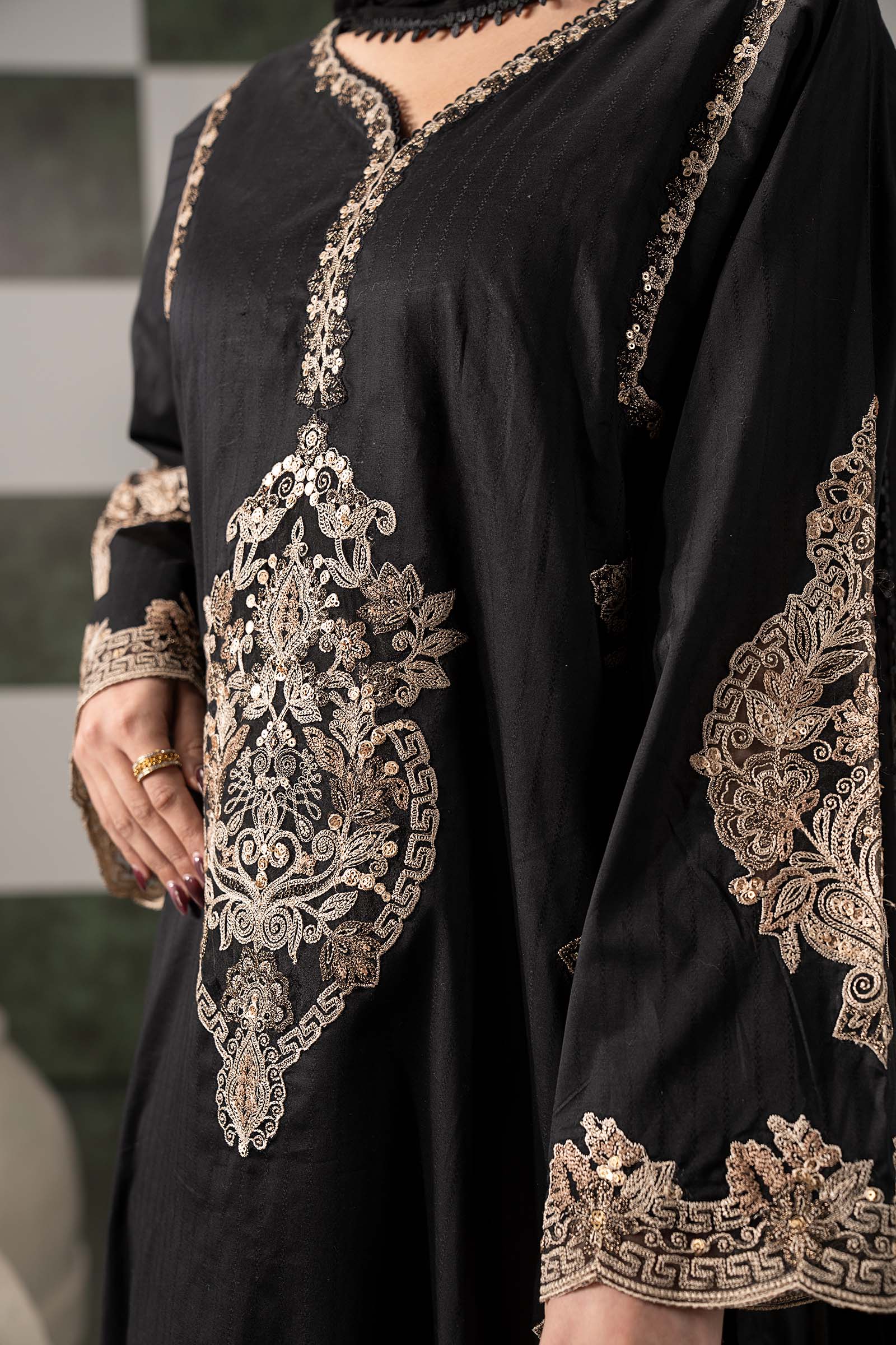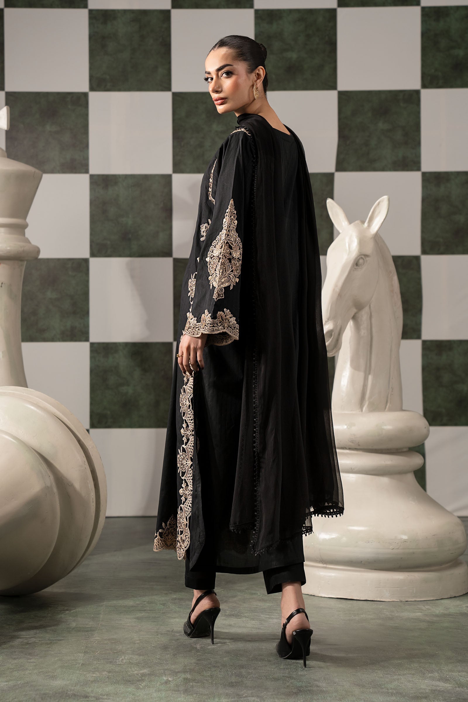 ShirtStraight-Cut Shirt Embroidered NecklineEmbroidered Scalloped Side SeamsEmbroidered Scalloped Round HemStraight Sleeves With Embroidered Armhole & Scalloped BorderColor: BlackFabric: Dobby LawnTrouserDyed Straight TrouserElasticated WaistbandColor: BlackFabric: CambricDupattaDyed DupattaFour-Side Lace BorderColor: BlackFabric: ChiffonModel is wearing xs sizeNote: Dry Clean Only