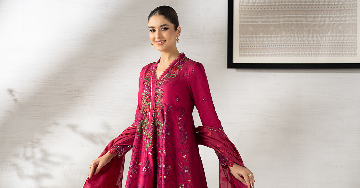 FrockEmbroidered FrockEmbroidered Overlap Neckline With Pleats & Lace DetailingEmbroidered Border With Lace DetailingEmbroidered SleevesFit: RegularColor: PinkFabric: Staple Raw SilkTrouserDyed Churidar PajamaElasticated WaistbandFit: RegularColor: PinkFabric: Staple Raw SilkDupattaDyed DupattaFour-Side Lace BorderColor: PinkFabric: Paper CottonModel is wearing xs sizeNote: Dry Clean Only