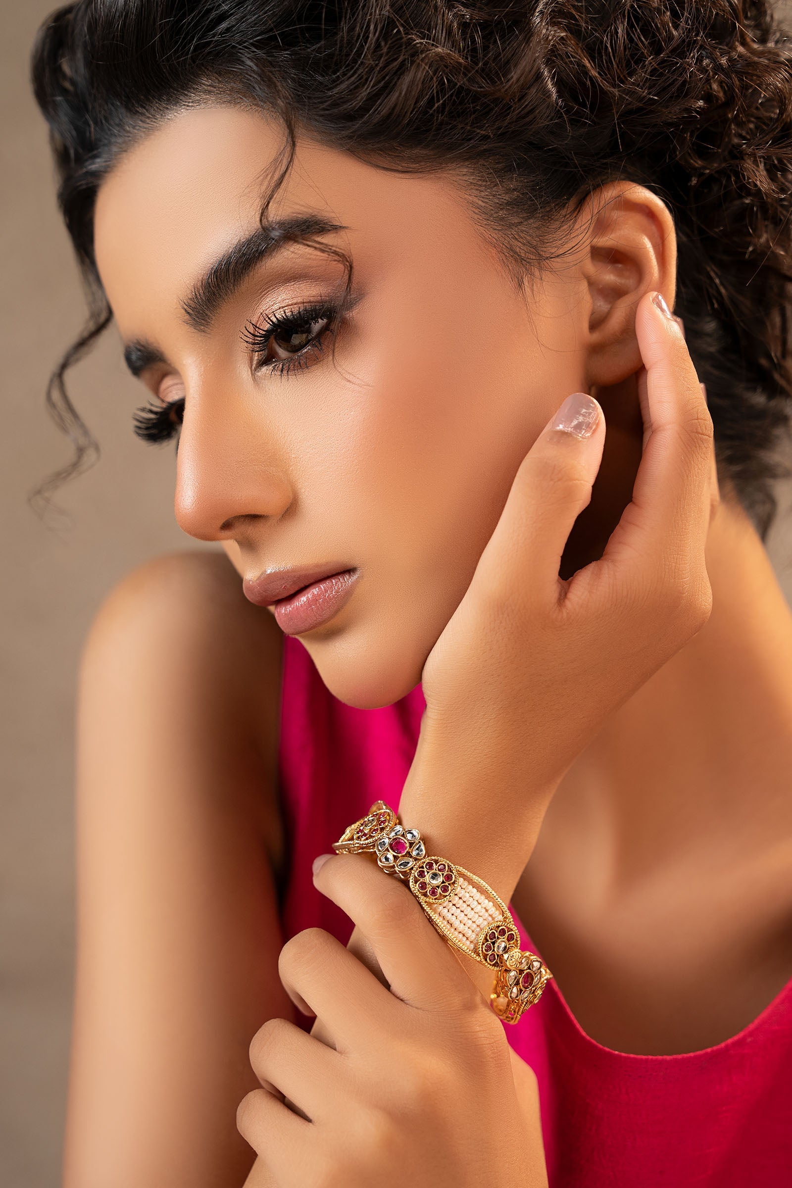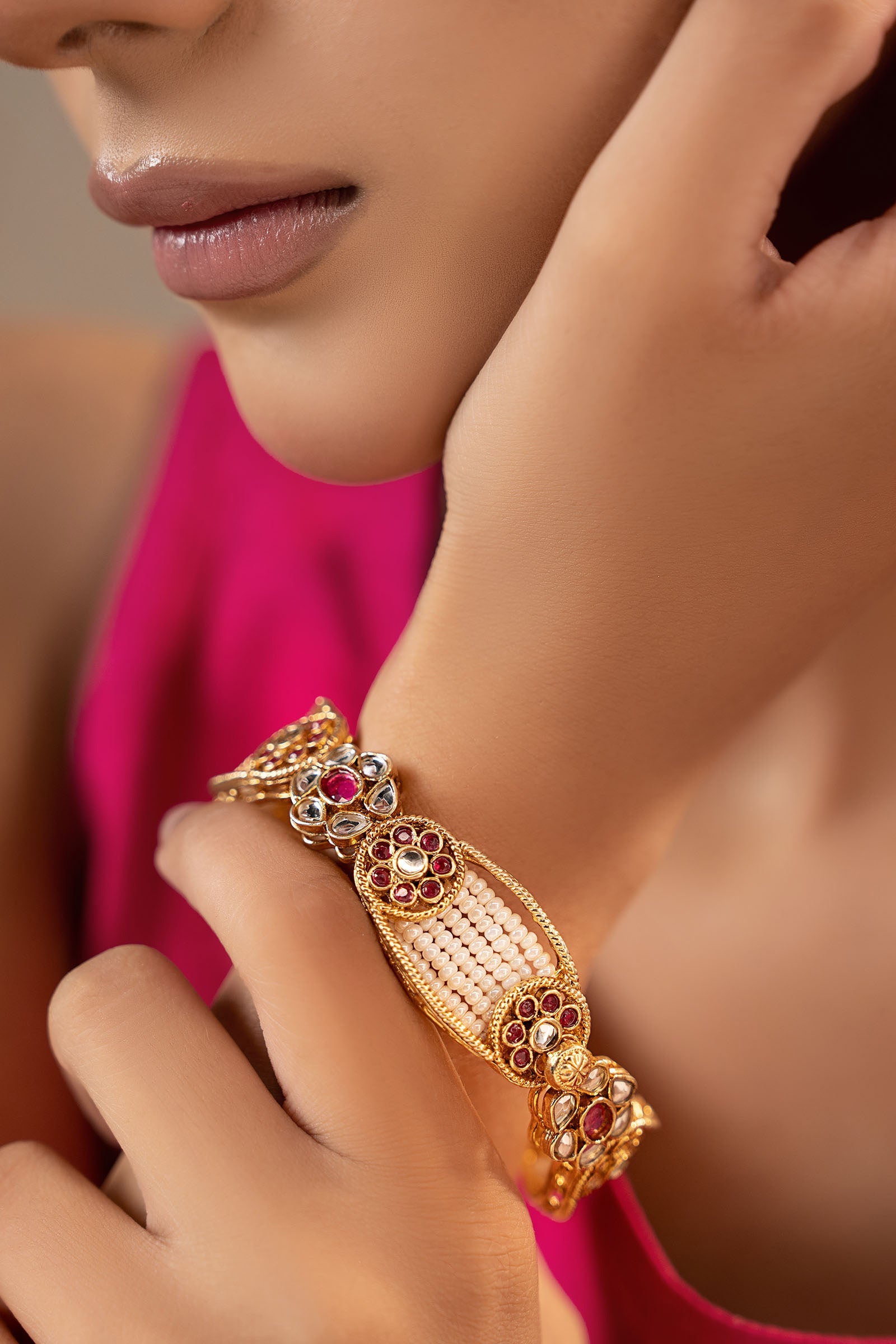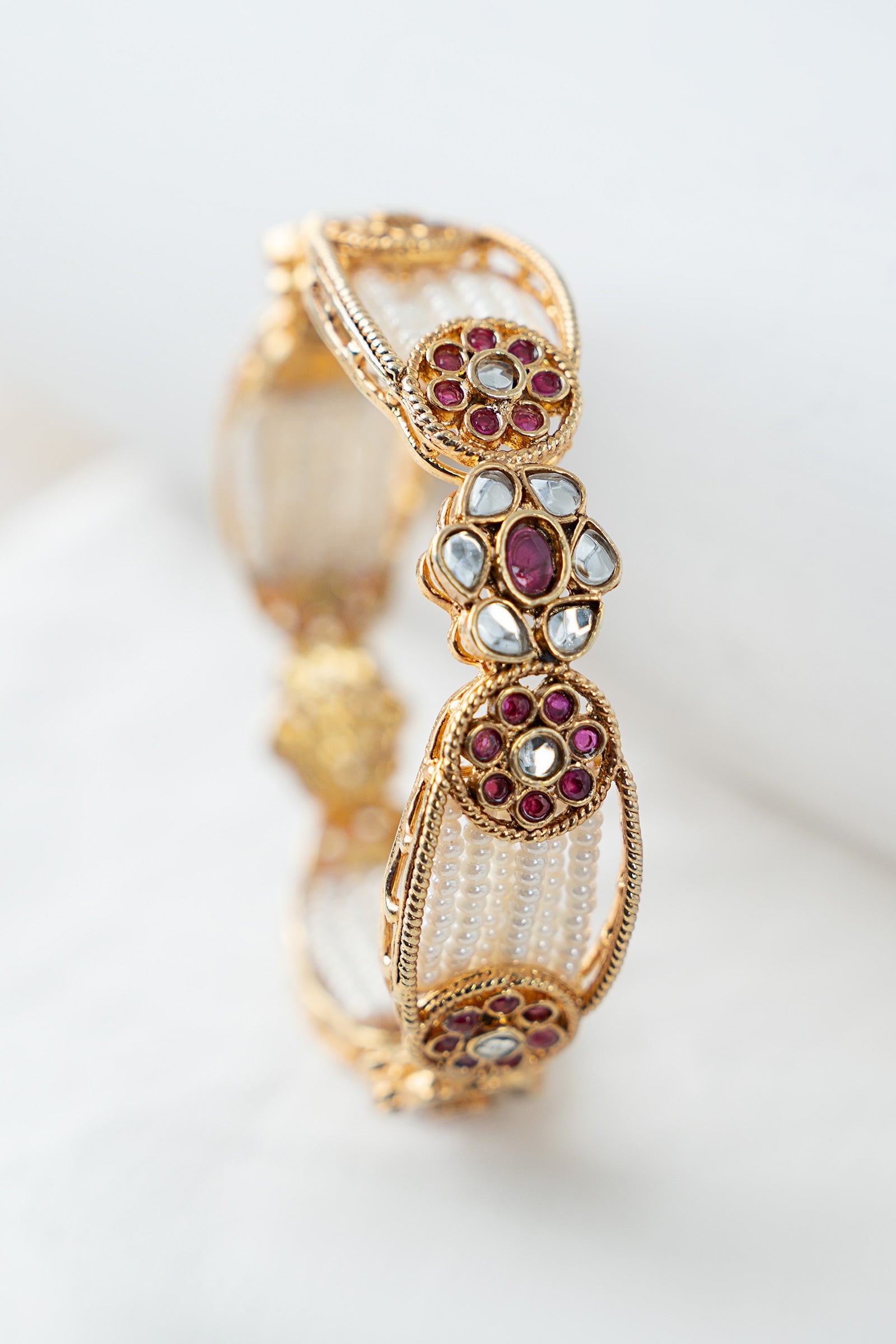Elevating the classic vibes with a twist - Our bangle showcases intricate florets crafted with delicate pink chatham and white handcut glass stones. Highlighting the beauty of this masterpiece it is finished with glistening indian poth pyroi making it an elegant yet classic choice for your desi festivities.