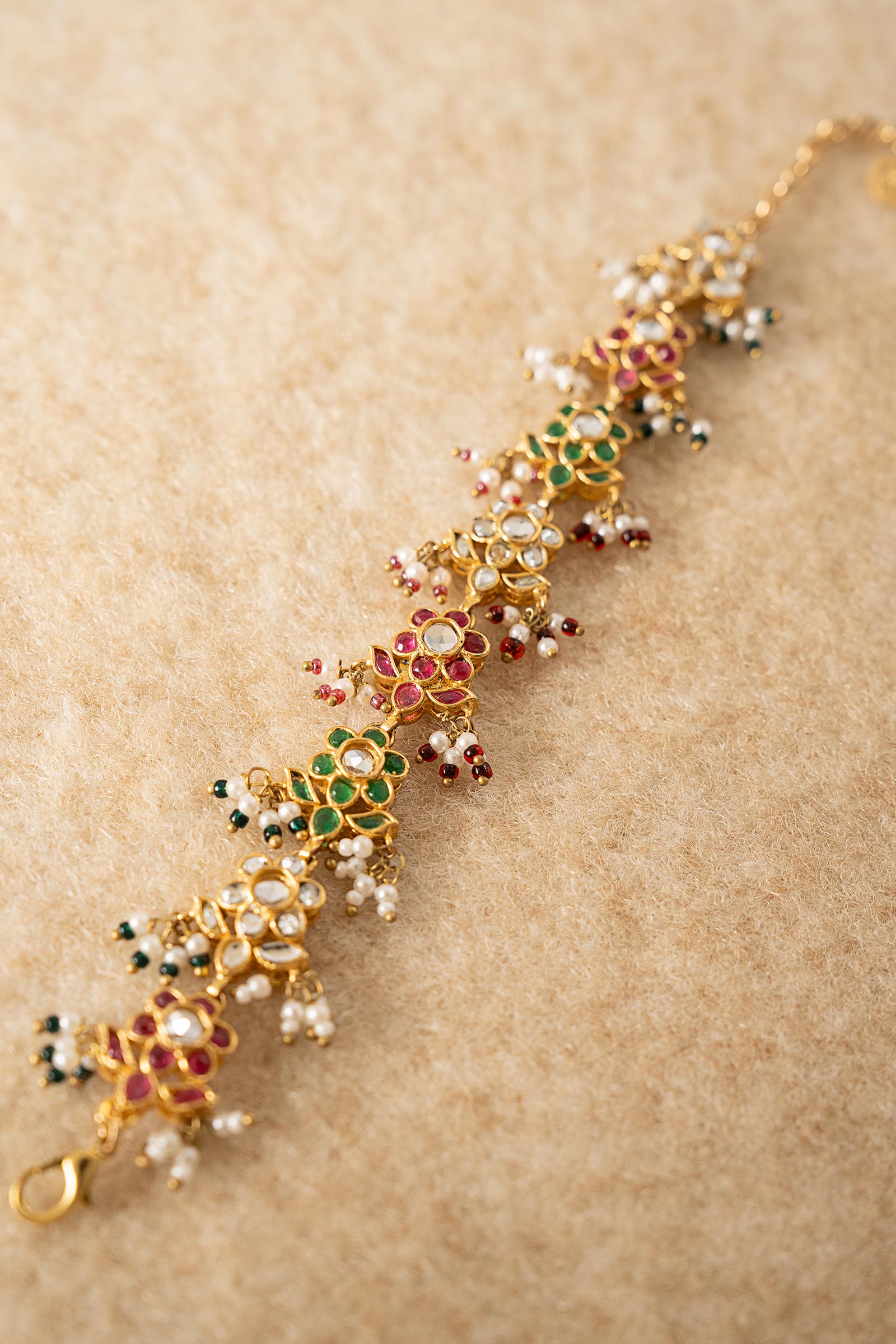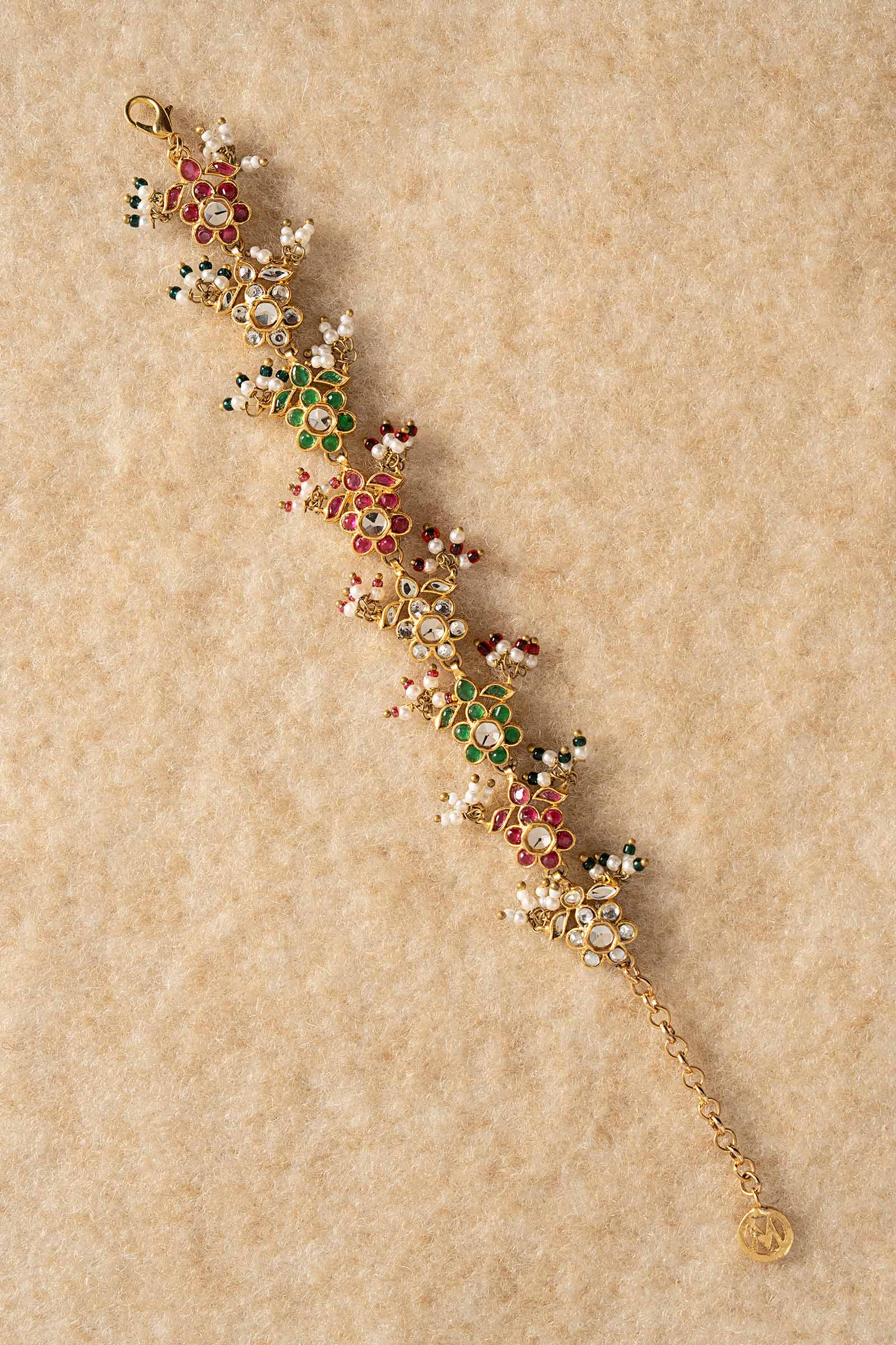 A radiant blend of tradition and elegance, this handcrafted bracelet dazzles with white hand-cut glass artistry suffused with pink chatham stone and green onyx stones. Highlighting the overall aesthetics it is accented with delicate pearl pyroi with vibrant red and green poth, it’s a festive masterpiece made to shine.