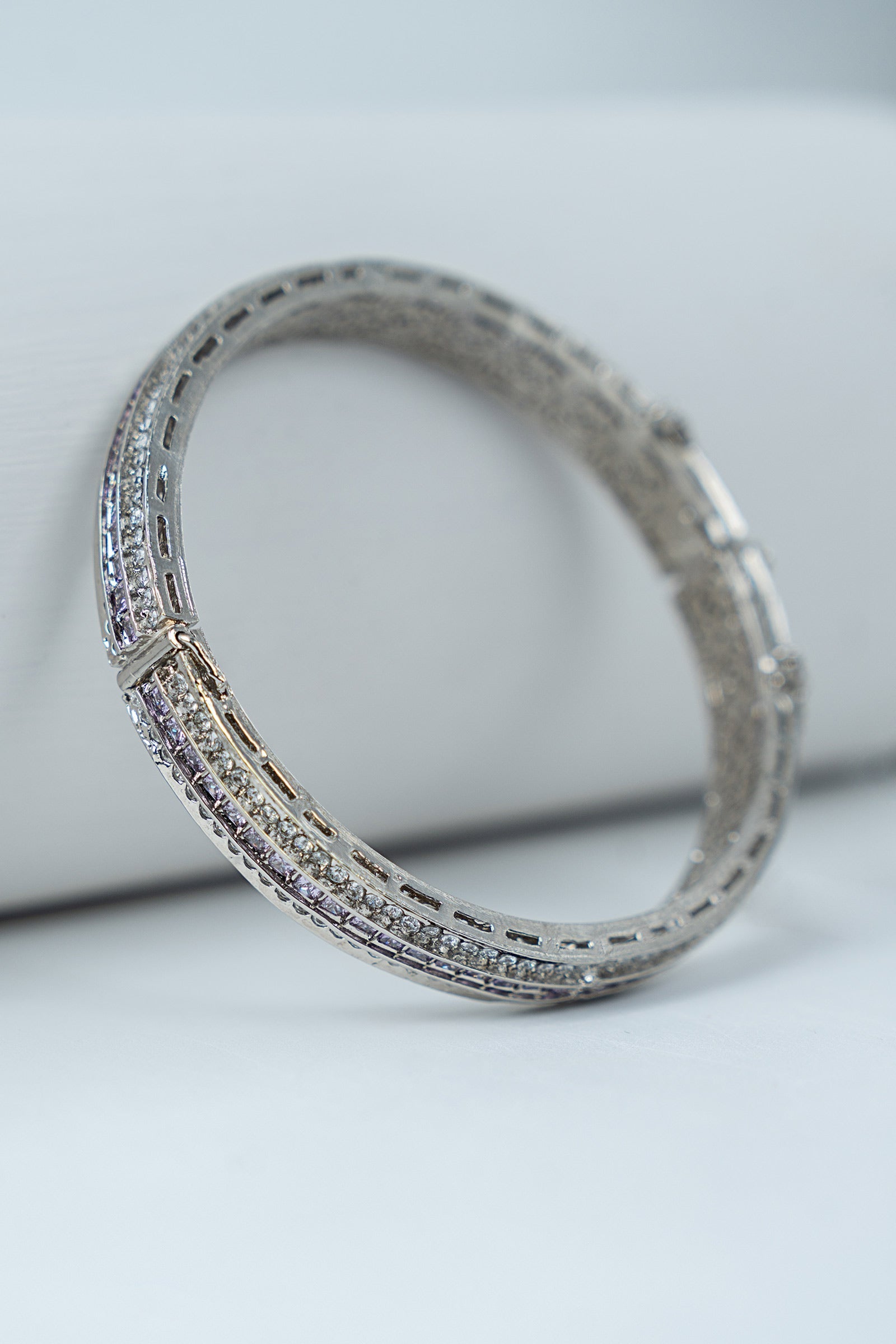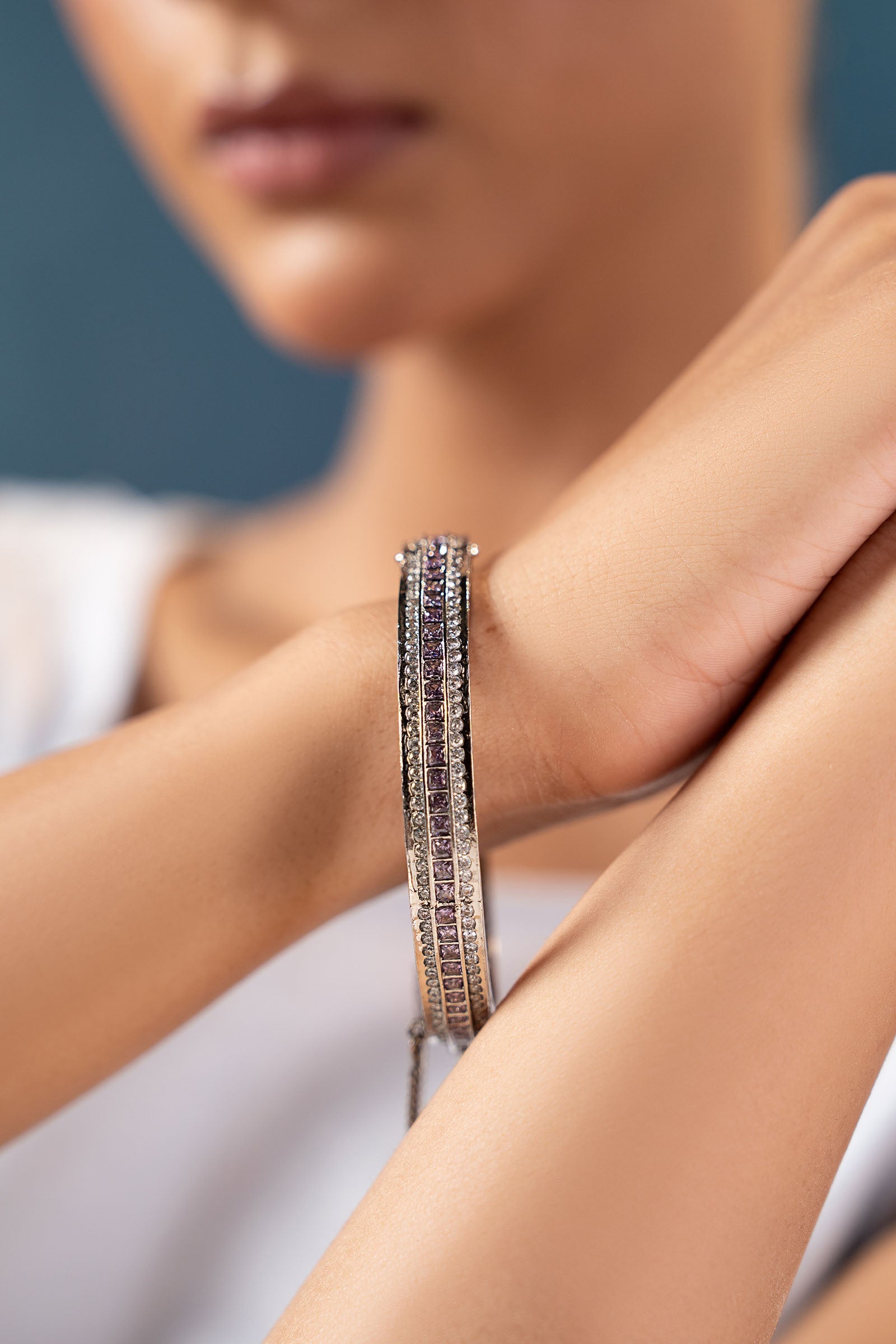 Bold meets beautiful in this statement churi, crafted with sparkling white and light purple zircons artistry. A contemporary twist on classic elegance, designed to turn heads at every celebration.