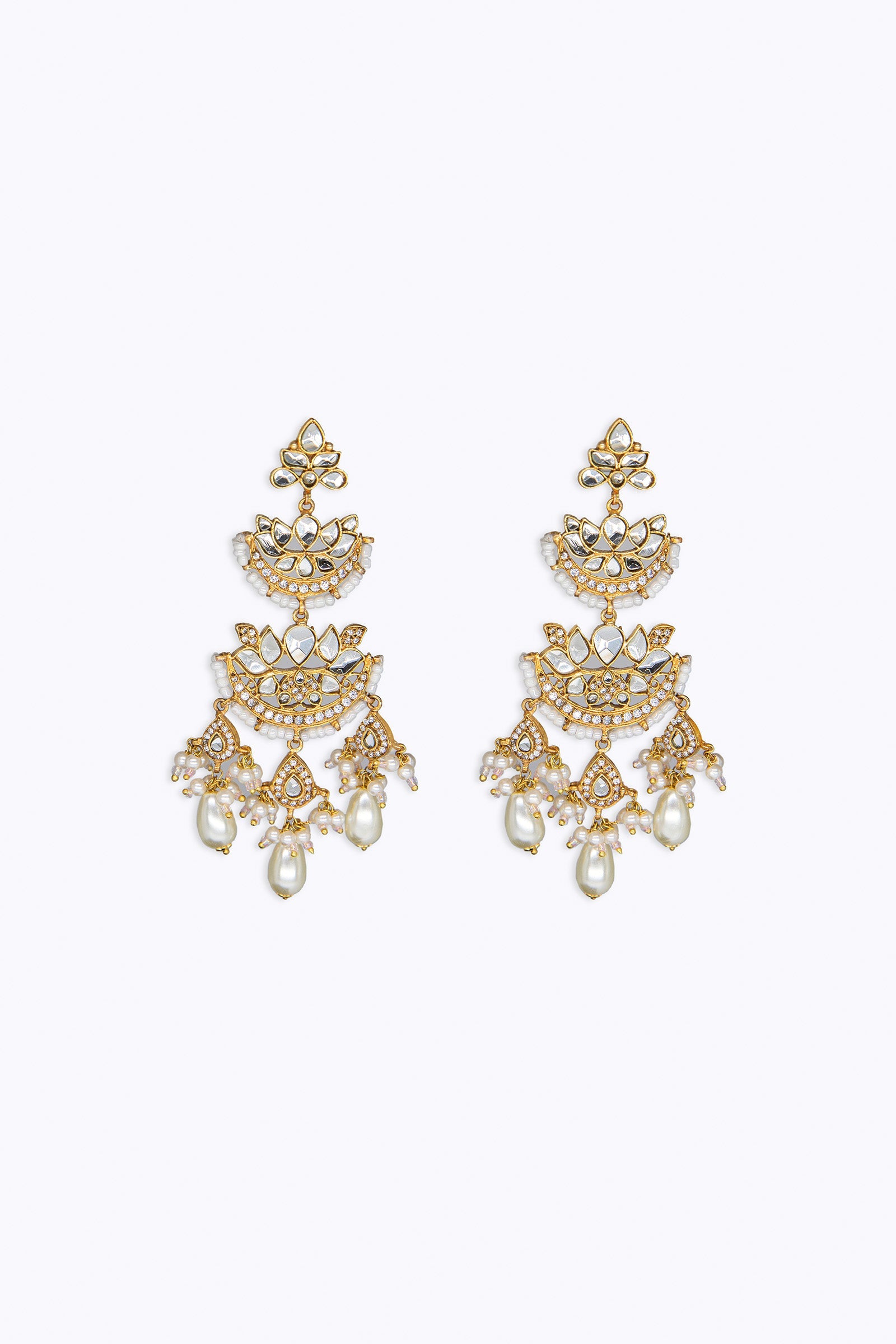 Beautiful statemental multi-colored danglers encased with layered chand motifs, pearl piroyi and handcut glass stones.