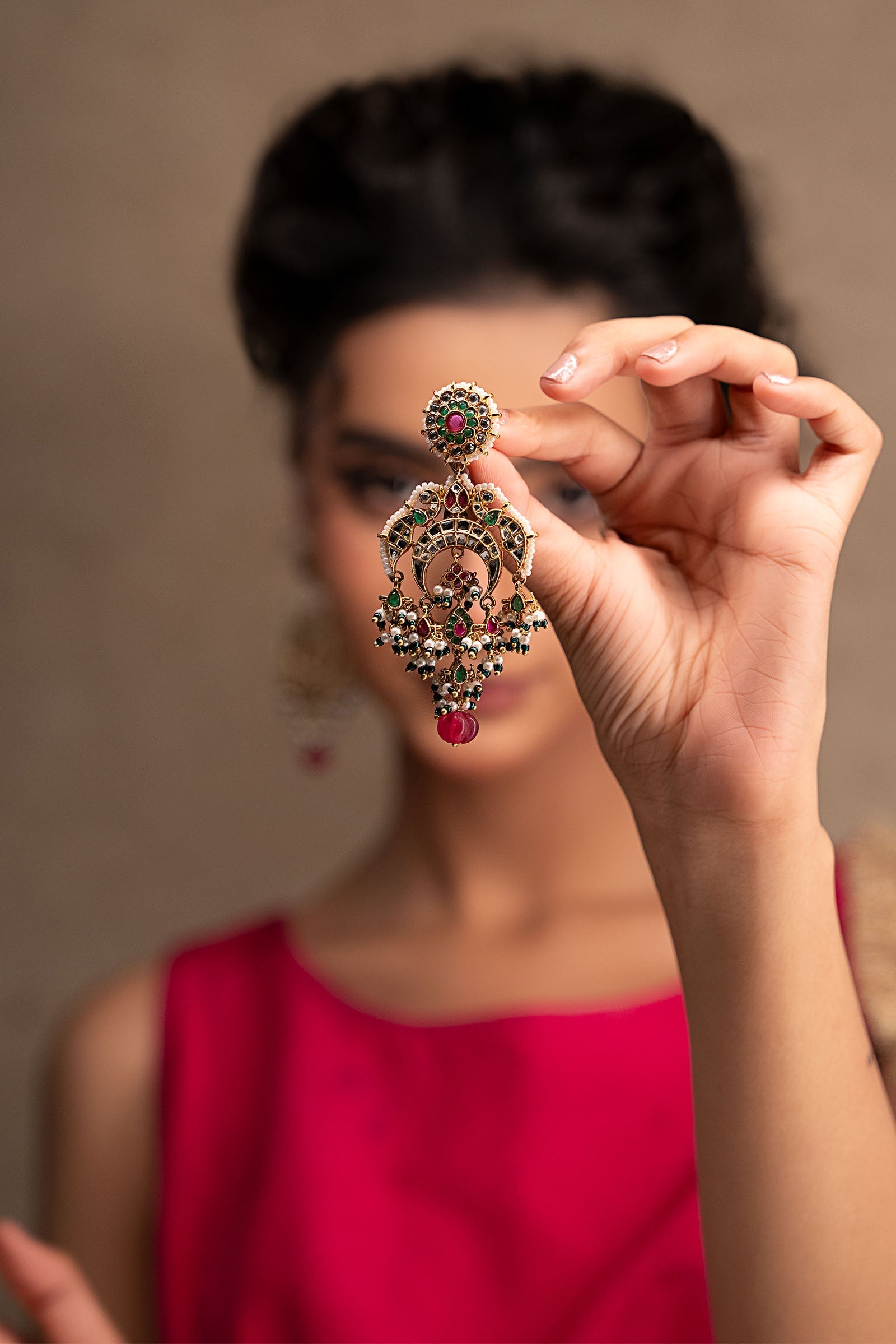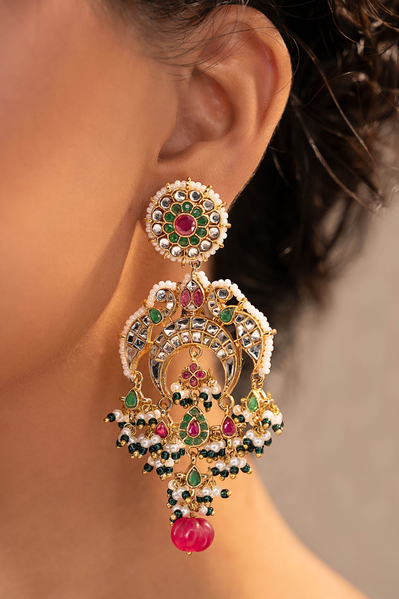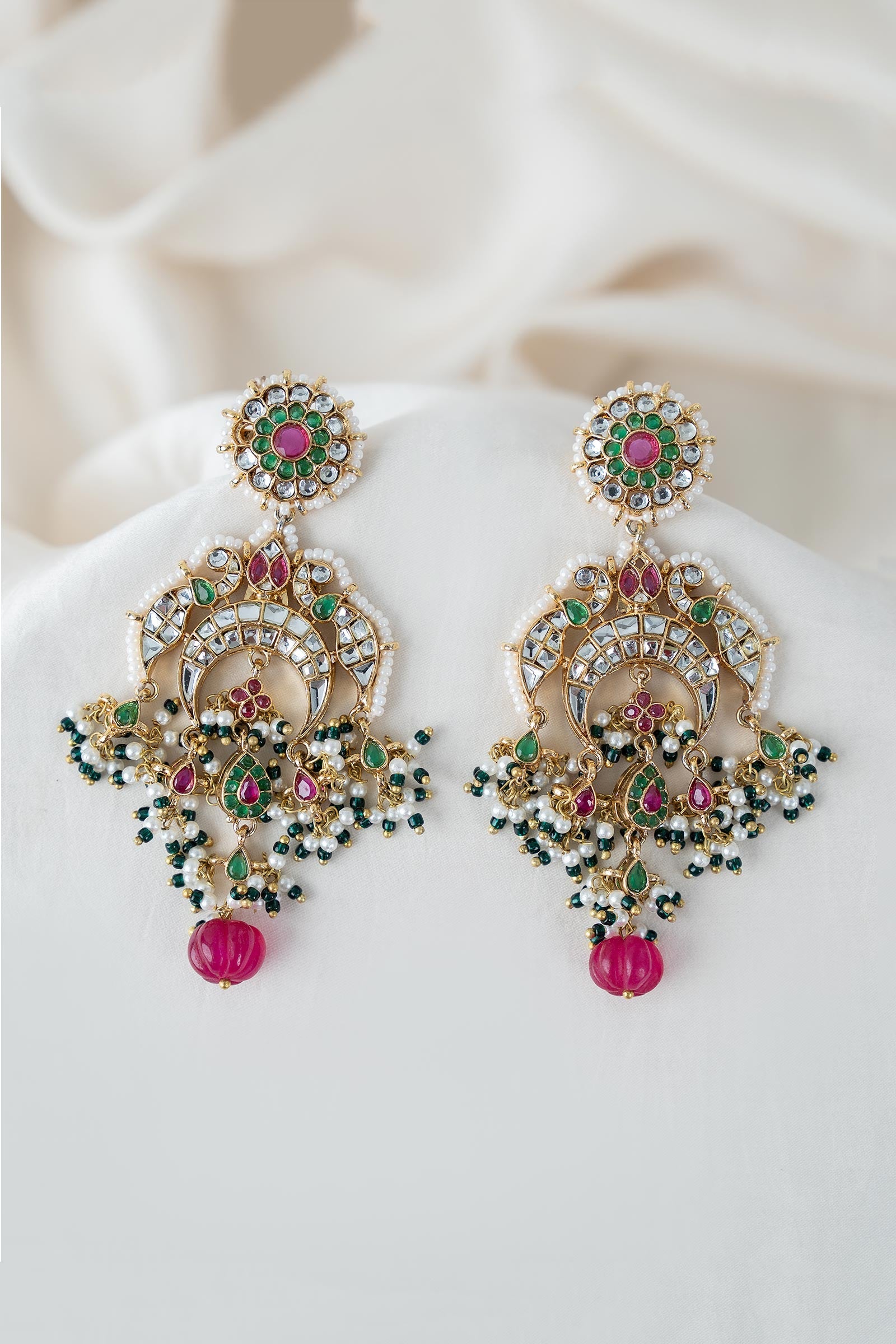 A celebration of rich heritage and vibrant hues, these earrings are adorned with pink chatham, white hand-cut glass, and green onyx stones. Finished with a striking pink watermelon stone in the hangings and delicately strung with white and green indian poth pyroi — this pair brings timeless charm and festive elegance to life. Finish: 21K Gold Plated Back Pin: Sterling Silver Stud Product Care: Wipe Clean
