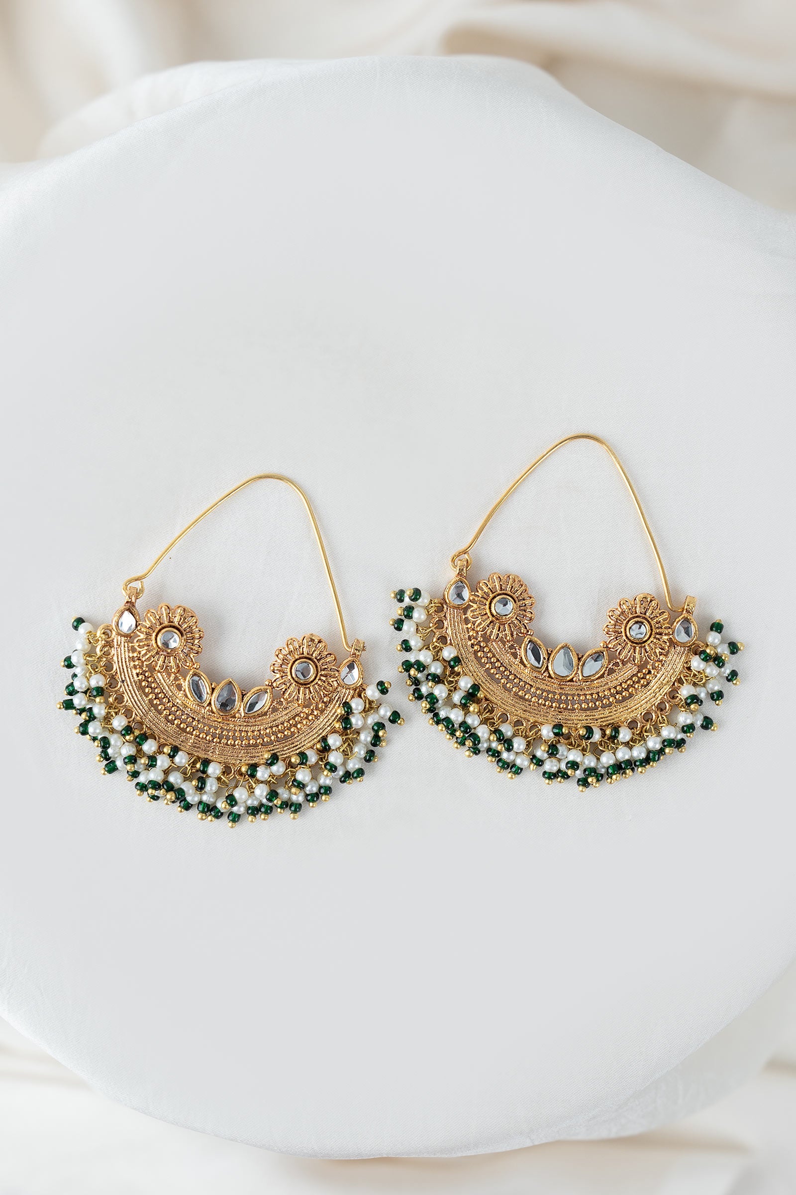 These handcrafted earrings, which are drenched in traditional charm, are made of bright white handcut glass that is exquisitely adorned with pearl pyroi and vivid green poth details. A sophisticated homage to tradition that is destined to turn heads at any event.