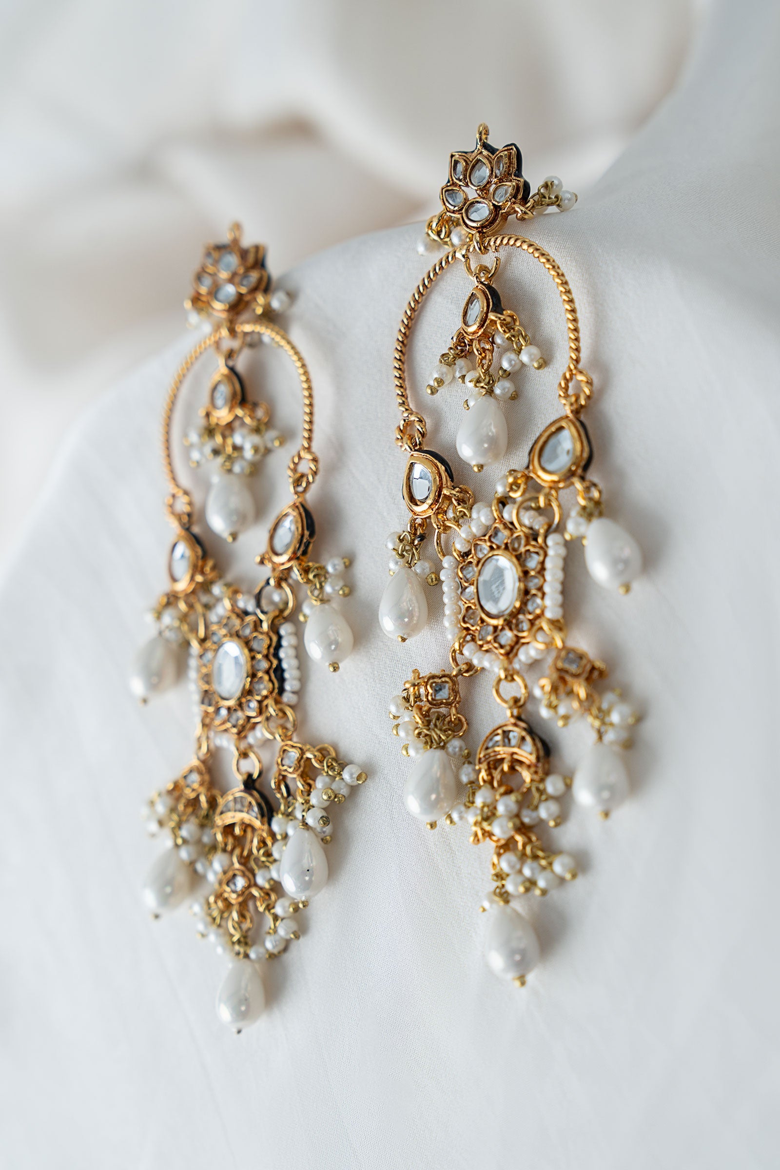These earrings, embellished with exquisite white pearl hangings, pay tribute to traditional craftsmanship by showcasing the radiance of white handcut glass. Finished with elaborate Indian poth pyroi and a hint of green enamel, they are a classic example of elegance that are meant to shine at any celebration.