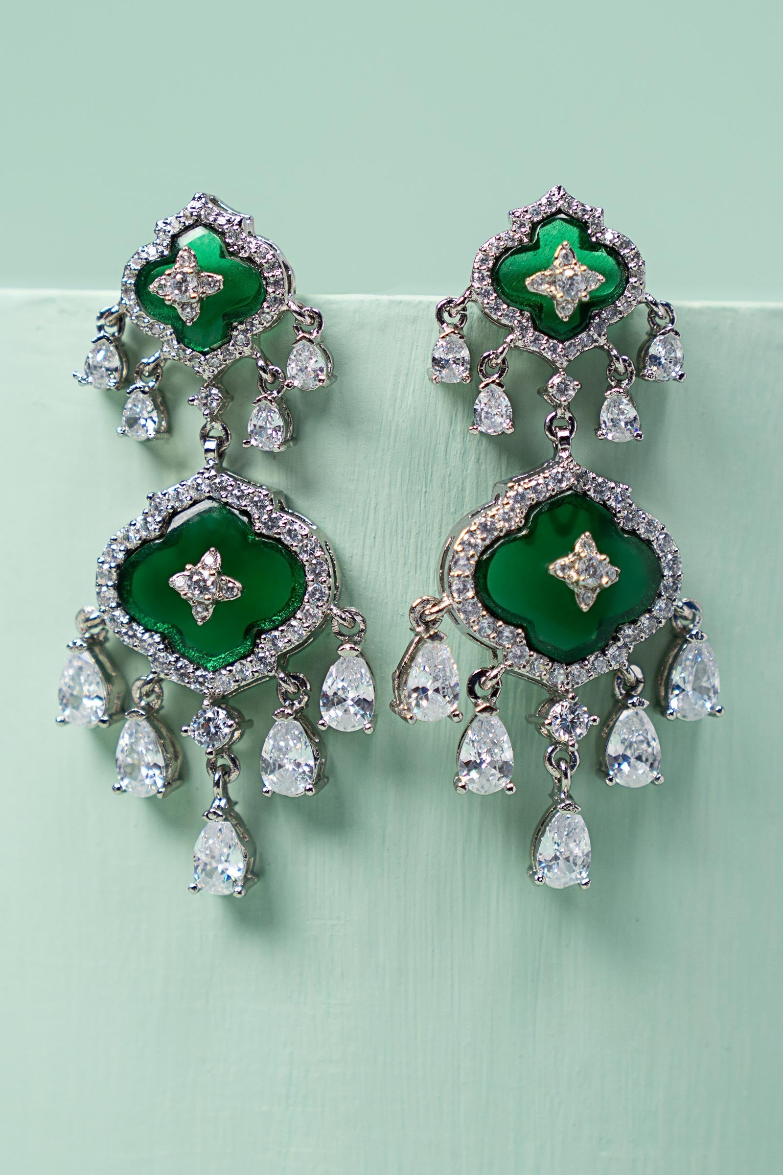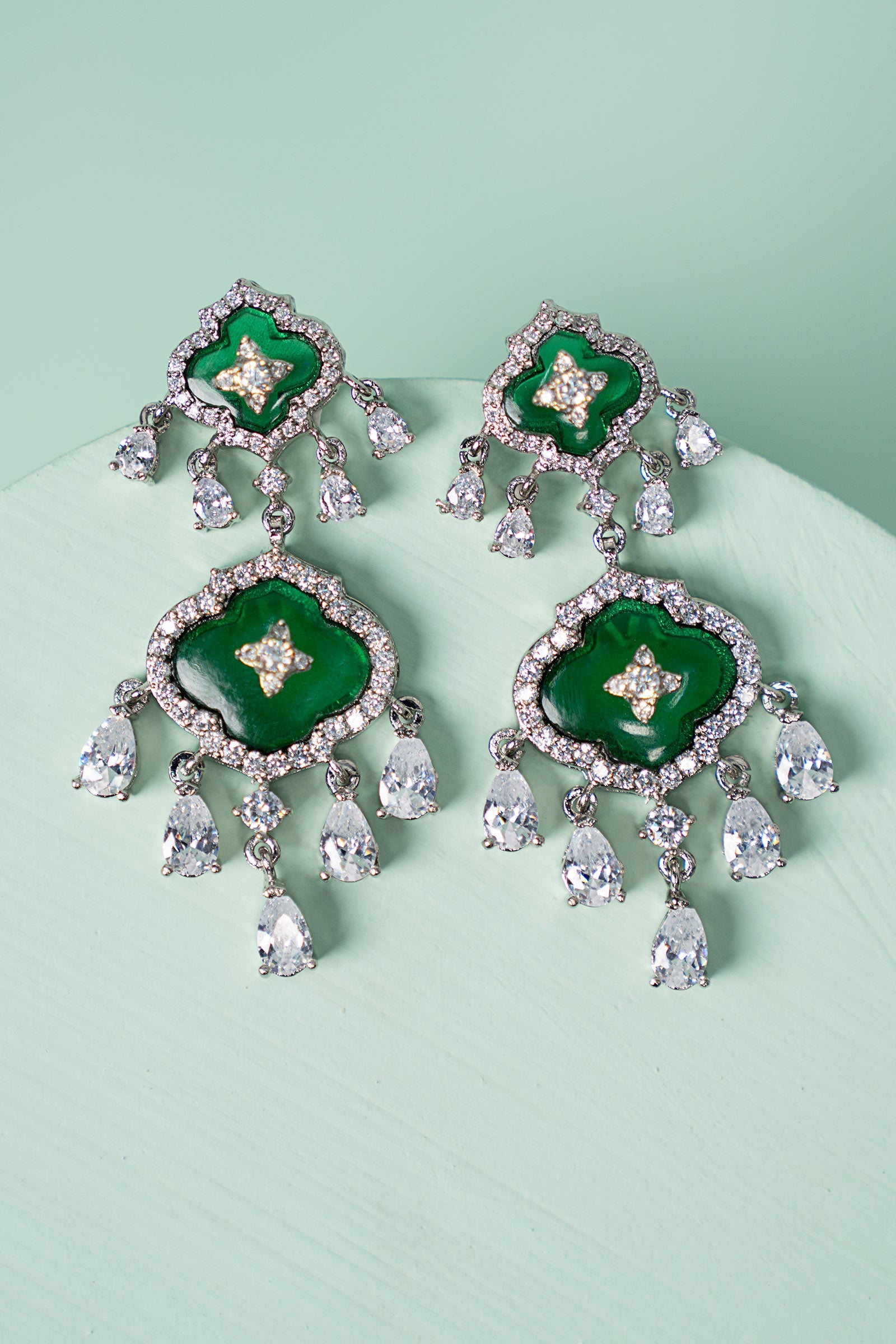 These striking and elegant statement earrings combine the brilliance of white zircons with rich emerald green stones. A striking combination of color and glitter, designed to add effortless glamour to your appearance.
