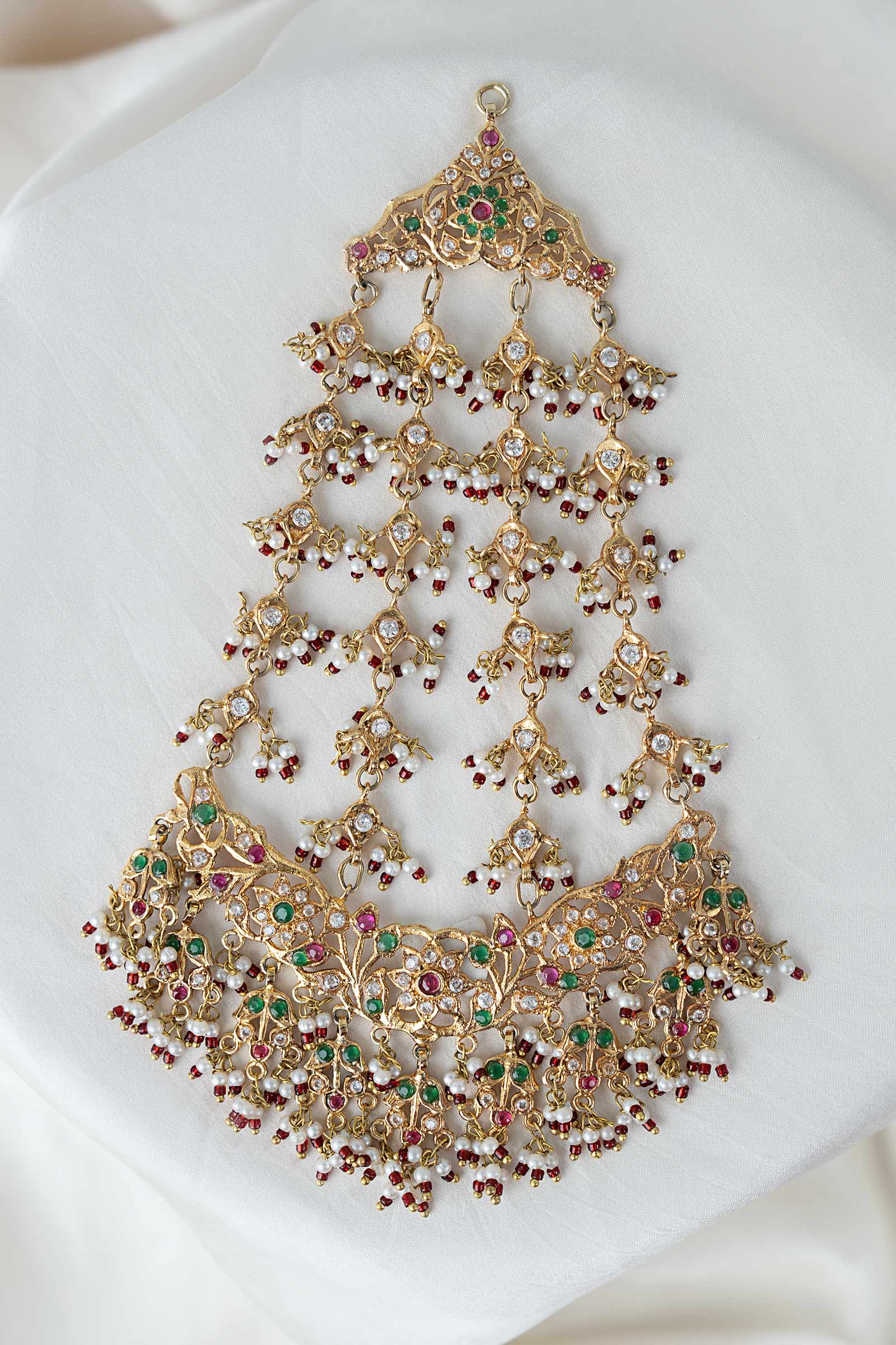 Drenched in festive opulence, this stunning jhoomar is adorned with the soft glow of pink chatham, the deep richness of green onyx, and the radiant sparkle of white zircons. Finished with graceful pearl piroi and a bold touch of red poth, it’s a timeless piece that captures the spirit of celebration with every shimmer and sway.