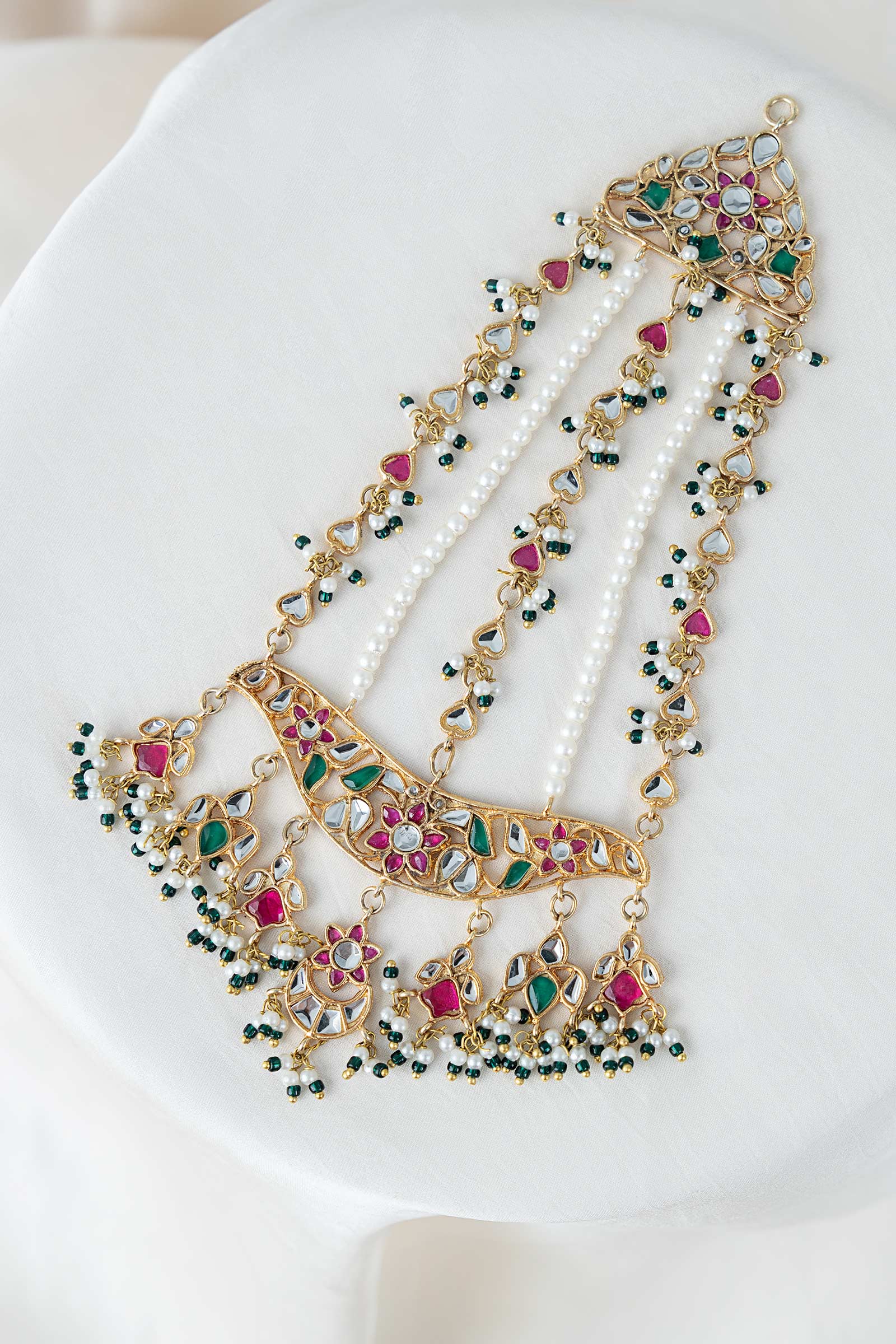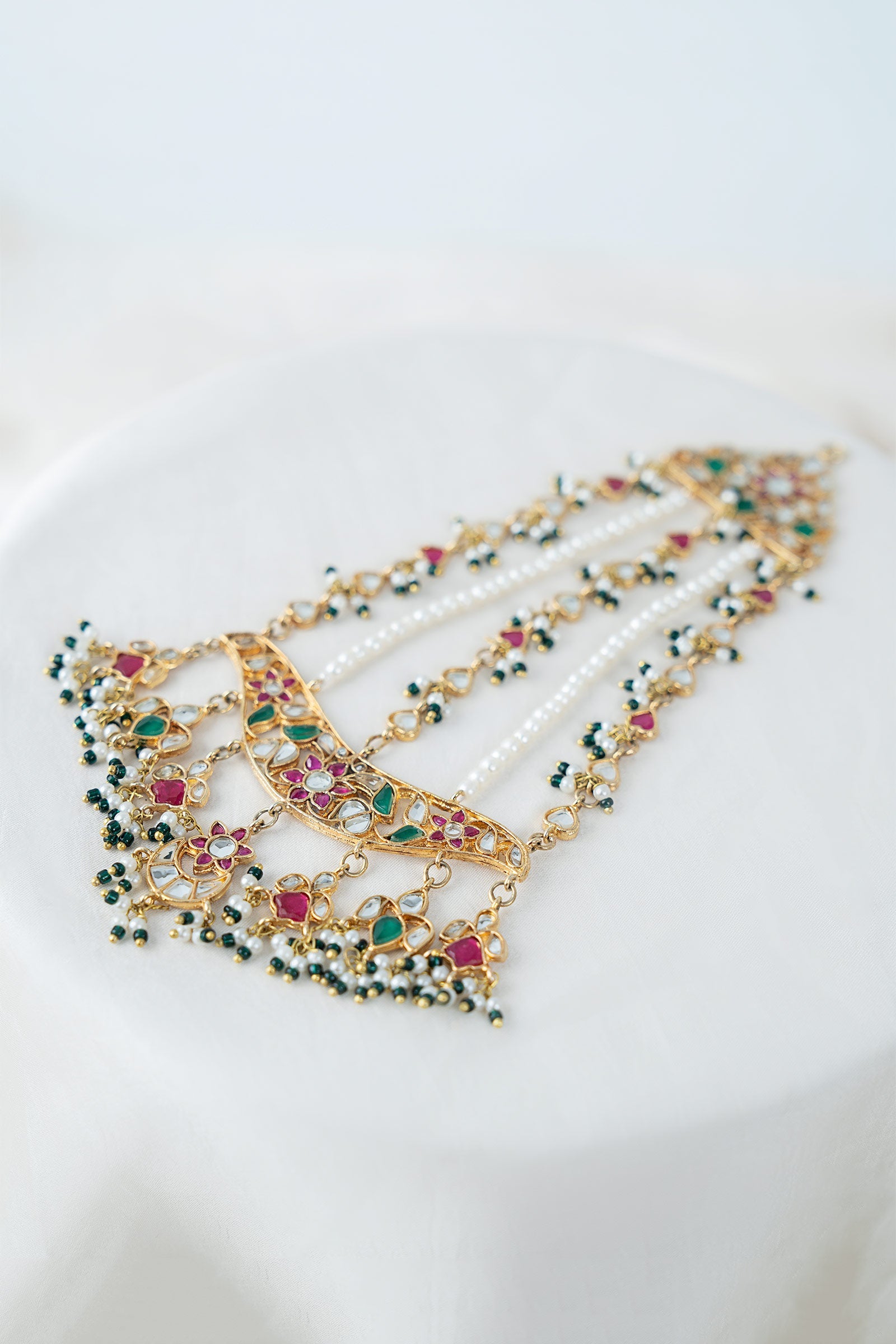This magnificent jhoomar is a regal masterpiece that expertly combines the delicate sheen of white handcut glass, the deep richness of green onyx, and the gentle charm of pink chatham. Finished with elaborate green poth pyroi and adorned with exquisite white pearls, it embodies the majesty of tradition with a new, brilliant beauty that is ideal for your memorable celebrations.