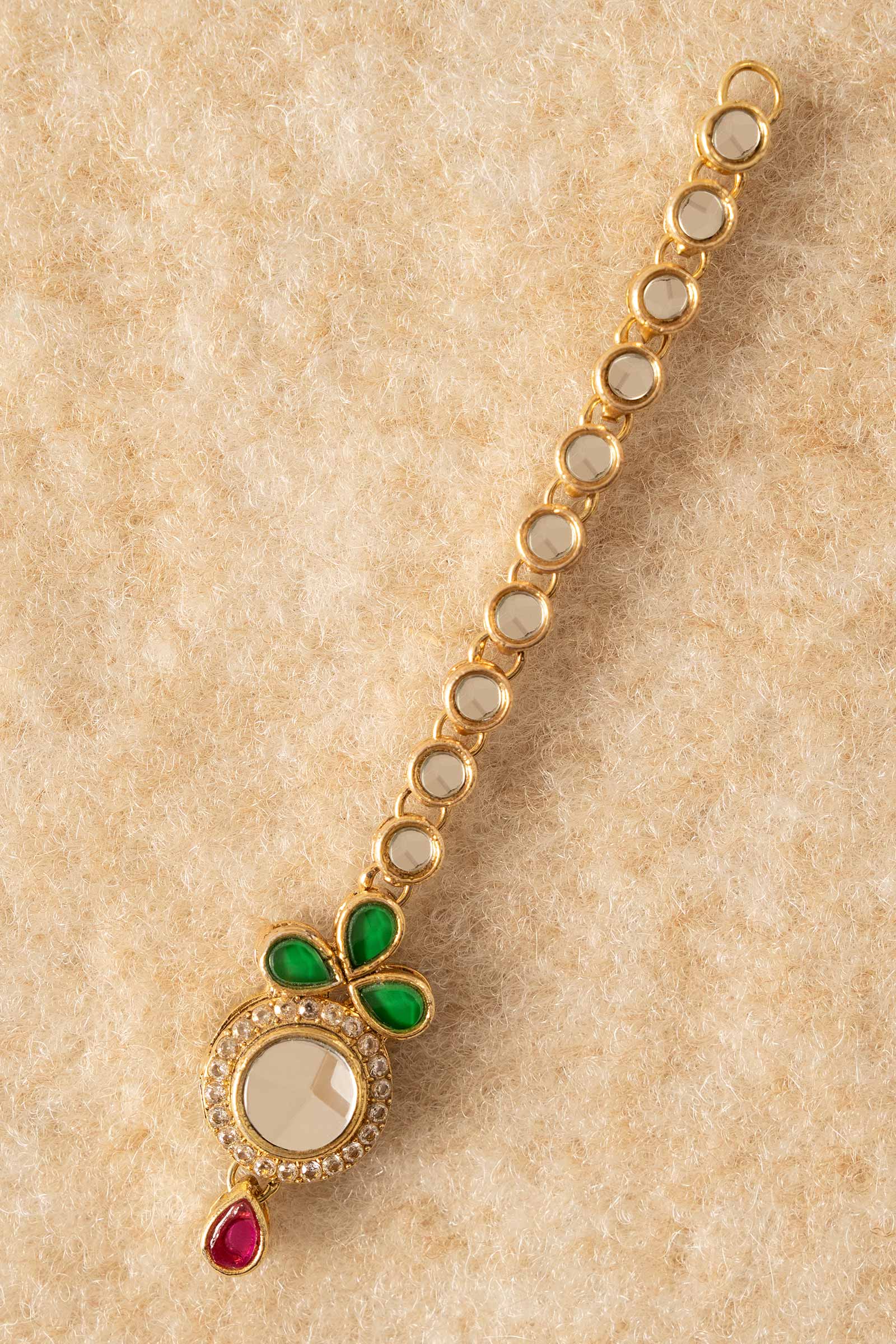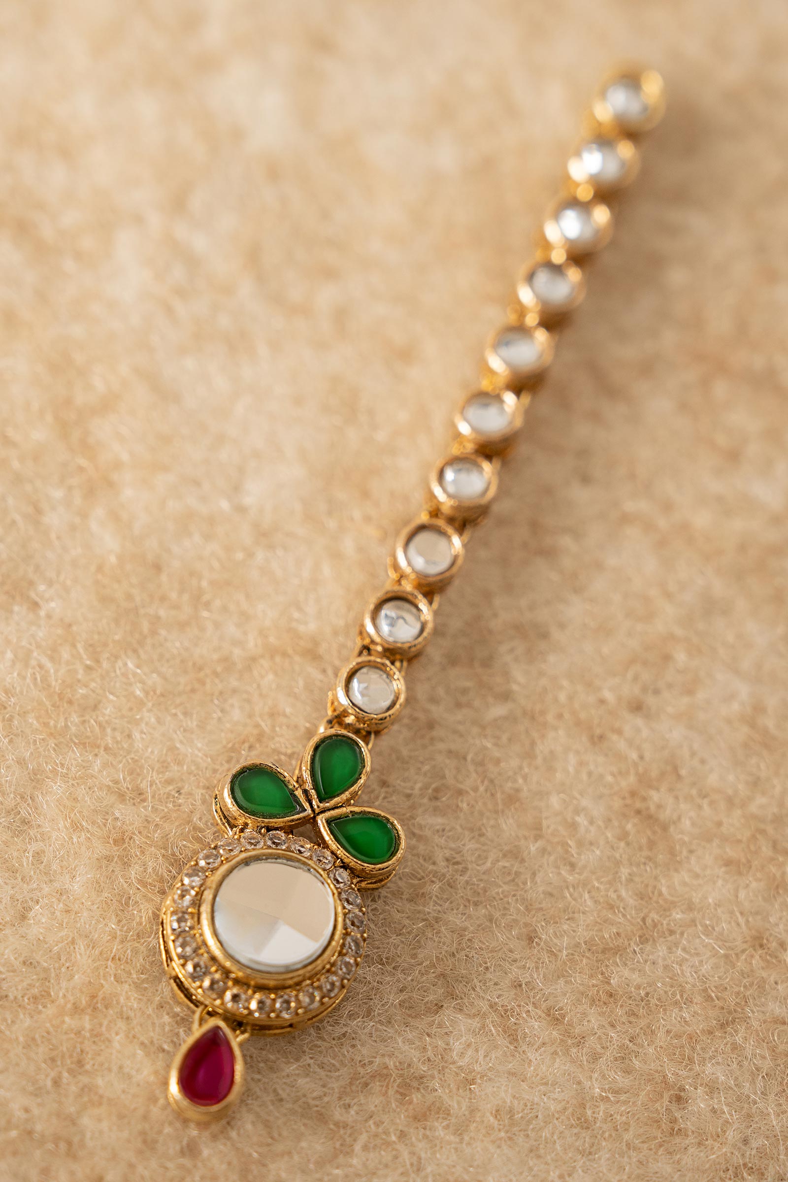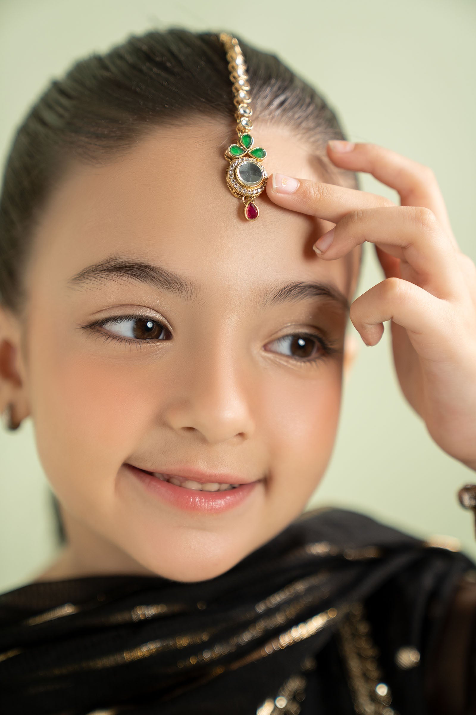 Brighten your little one’s festive look with this charming tikka, featuring the playful hues of pink chatham and green onyx, sparkling white handcut glass, and dazzling white zircons. A perfect blend of tradition and sparkle, designed to add joy and elegance to every celebration.