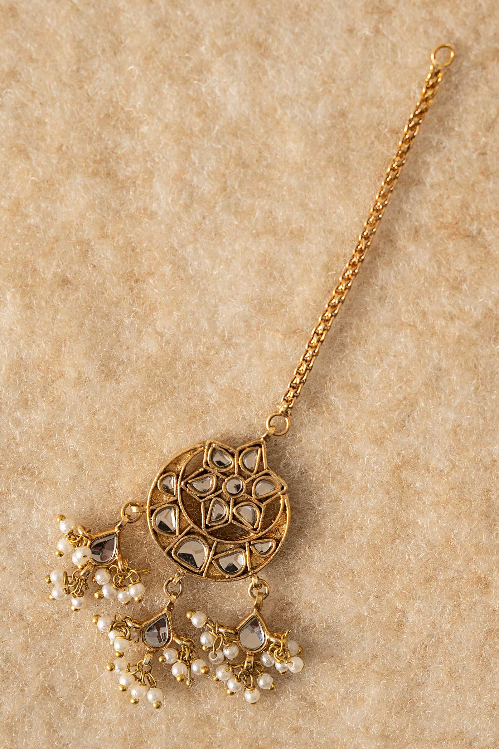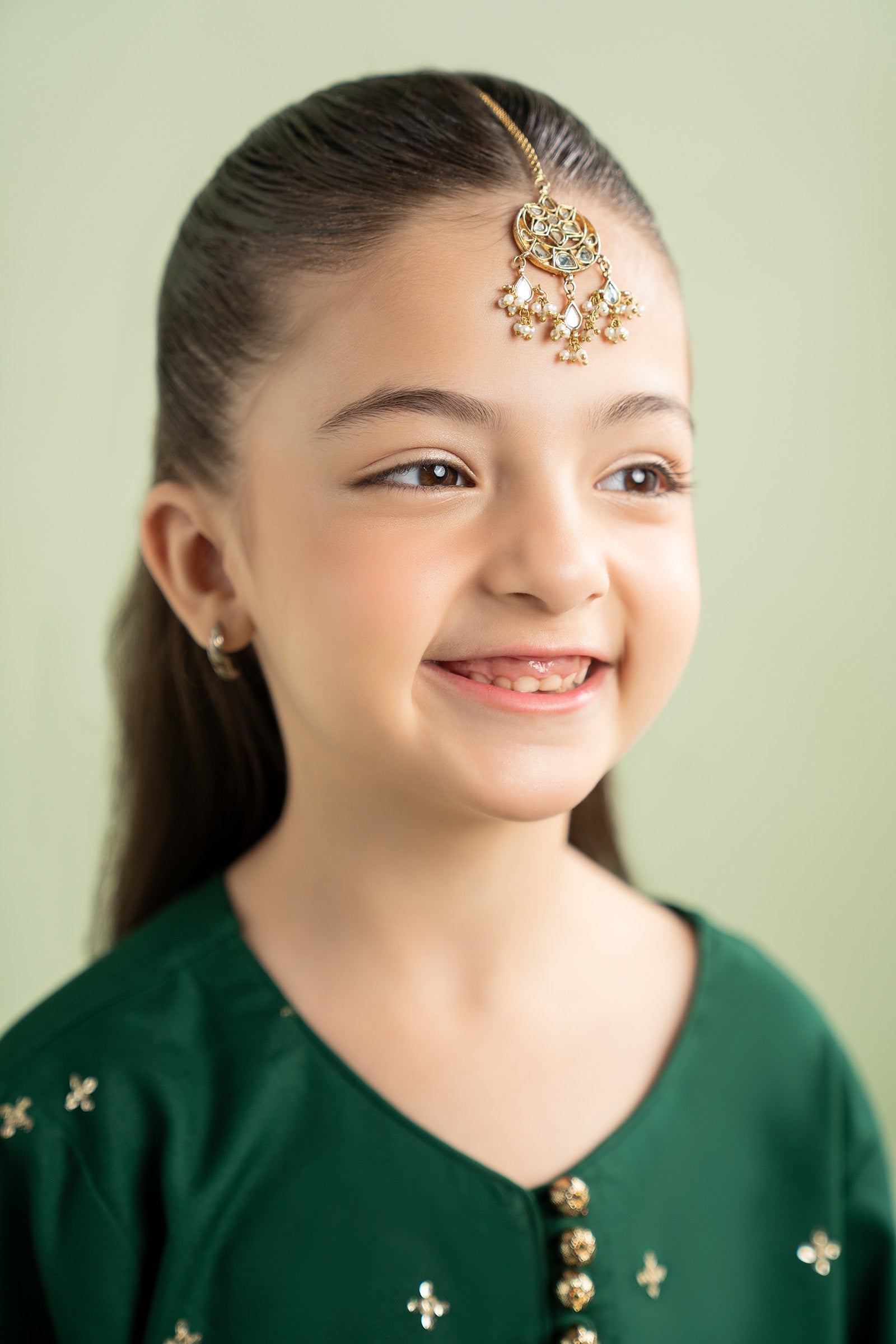 Twinkle like the stars with this adorable tikka, where sparkling white handcut glass meets soft, dreamy pearl pyroi. A magical blend of tradition and charm, made just for your little princess to shine bright on every festive day.