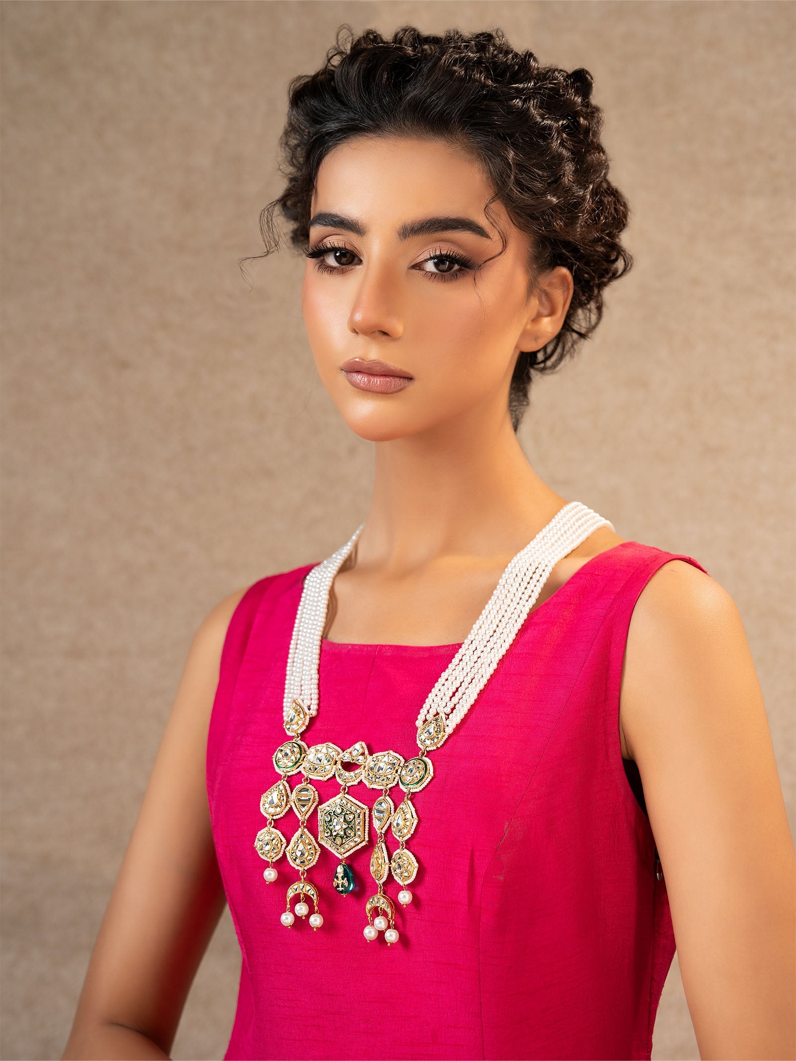 With gorgeous white handcut glass, teal green stones, and delicate white pearls dangling from it, this gorgeous mala exudes festive elegance. This piece is the ideal fusion of tradition and classic beauty to enhance your look, especially when paired with elaborate Indian poth pyroi and vivid green enamel.