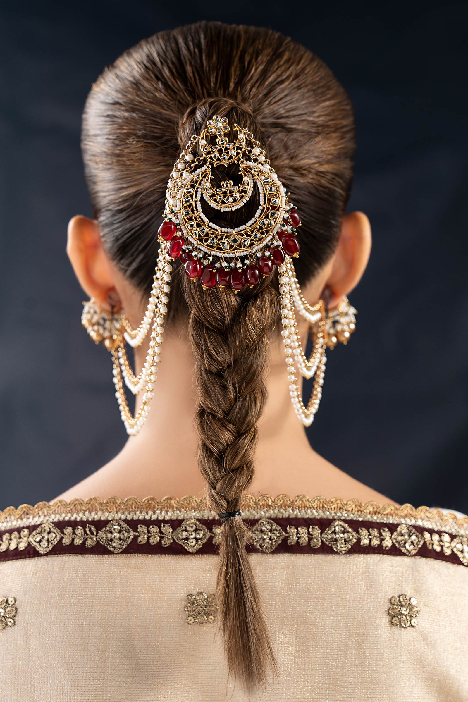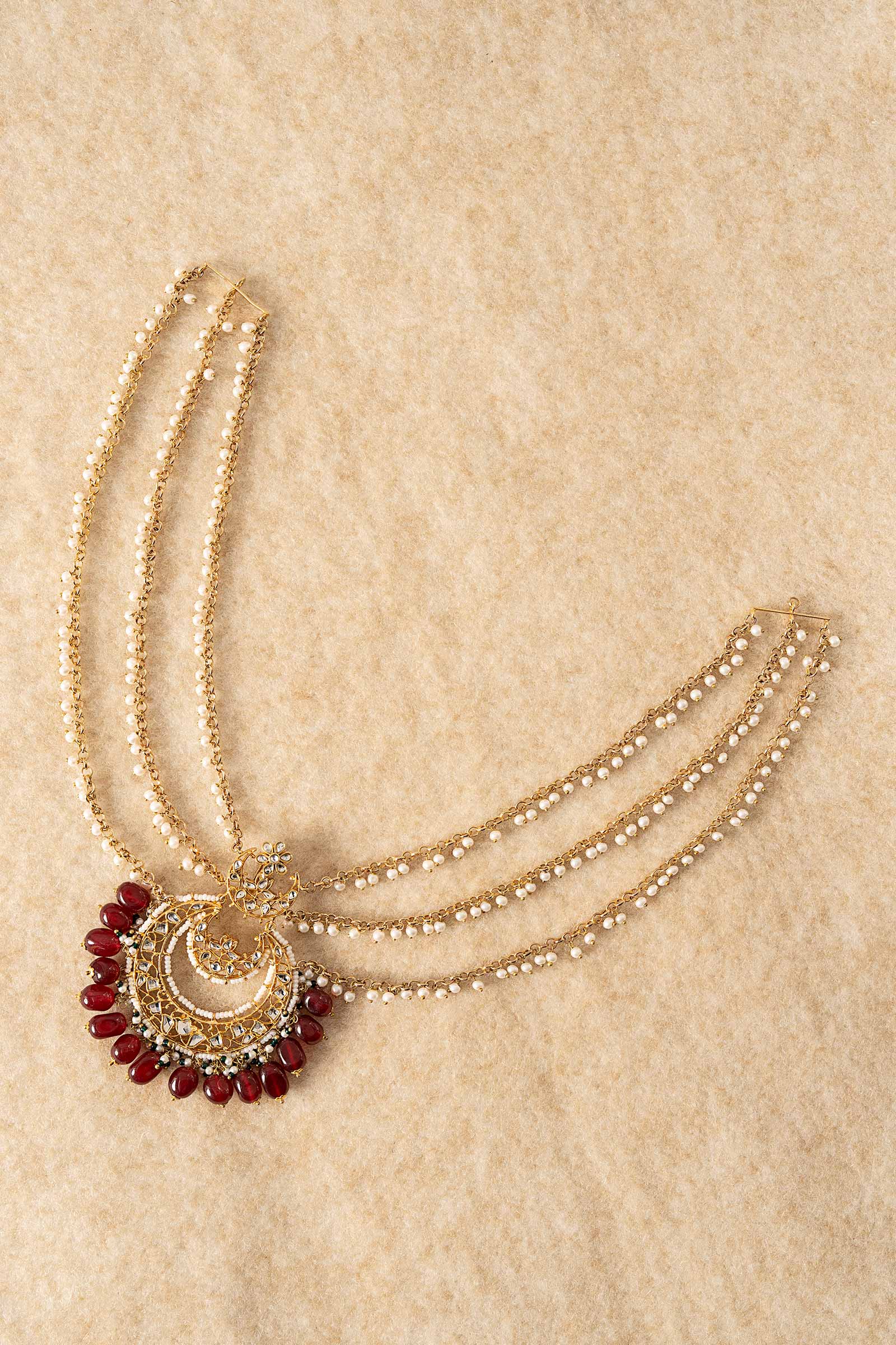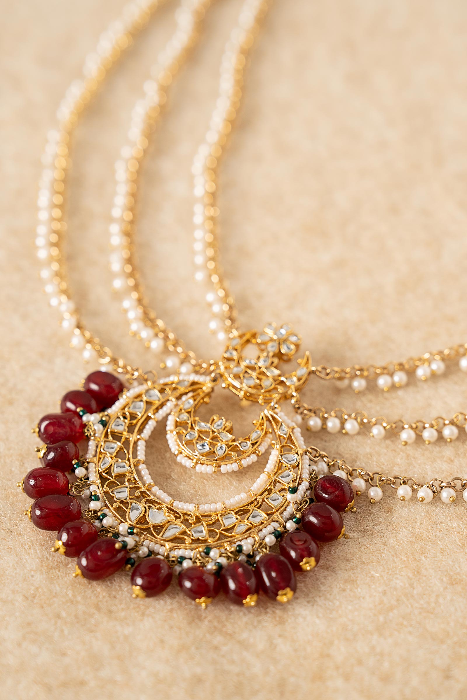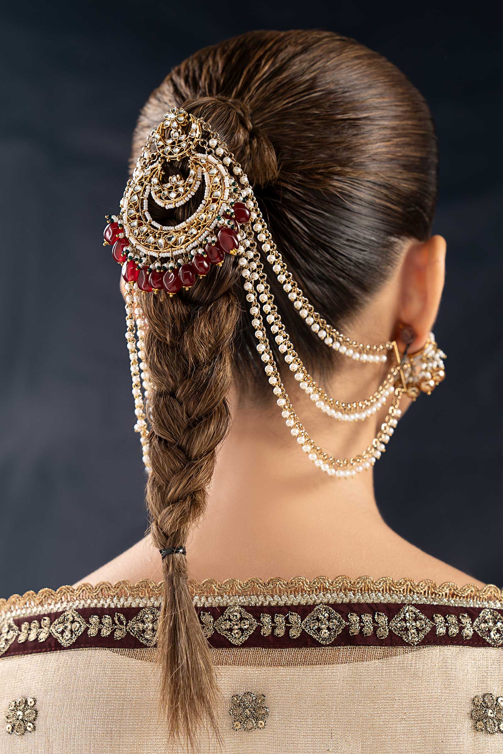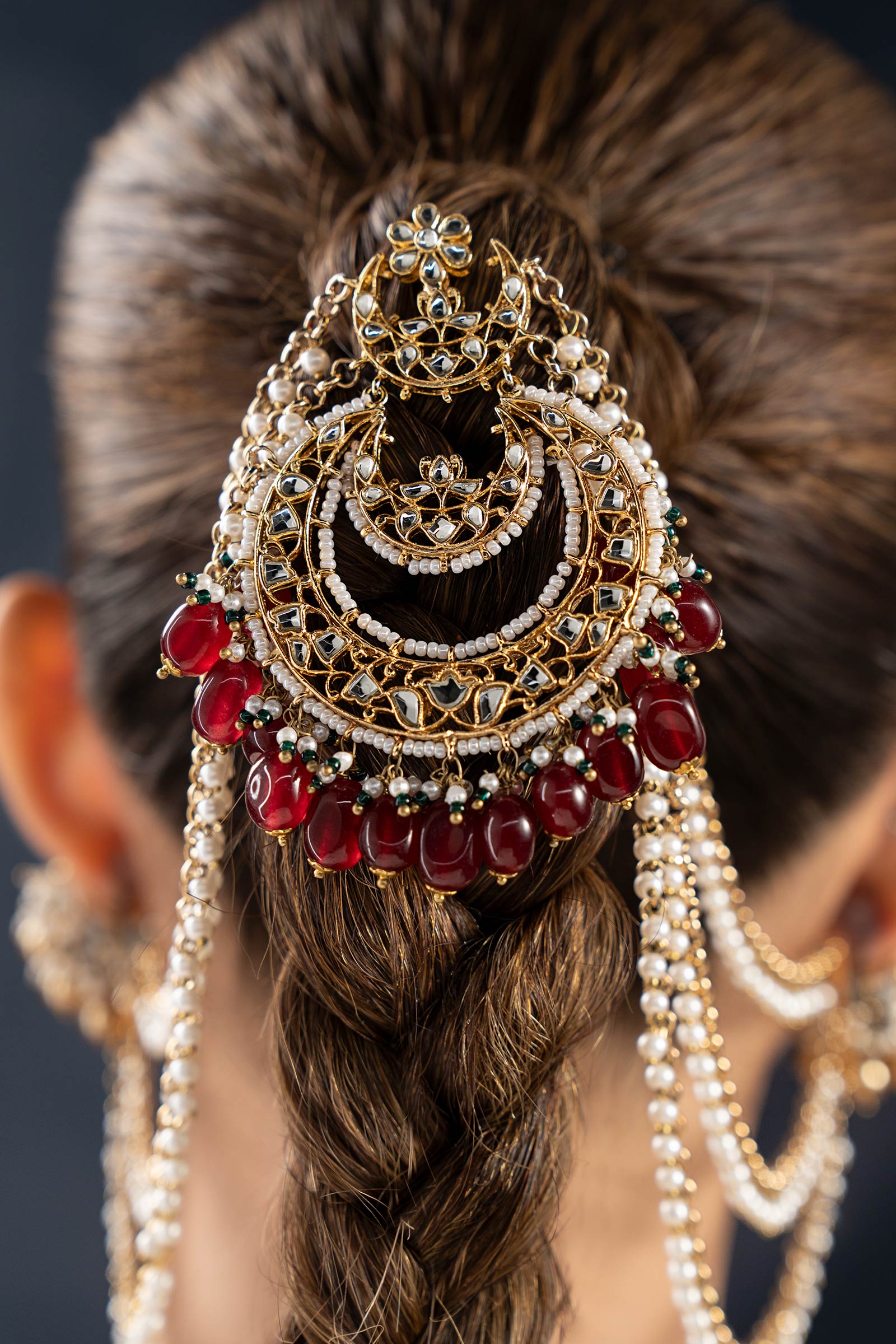 This finely created jura pin, which combines the rich color of dark pink onyx with the brilliant dazzle of white handcut glass, will elevate your festive hairstyle. With its exquisite white pearl pyroi, vivid green poth, and traditional Indian poth accents, this piece gives your festive ensemble a perfect dose of heritage elegance.