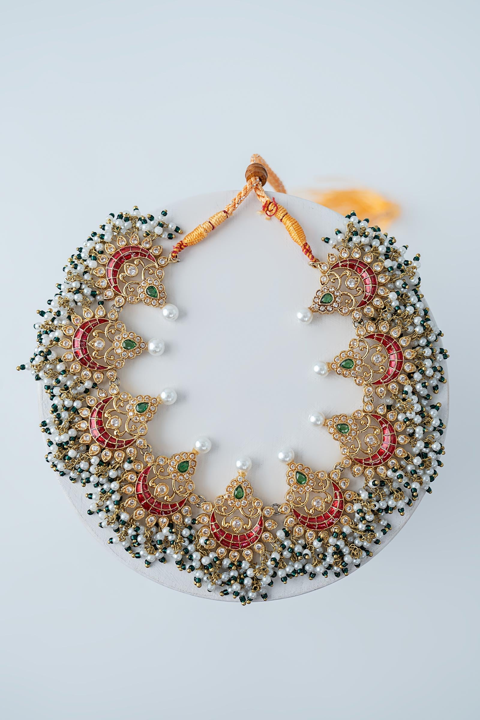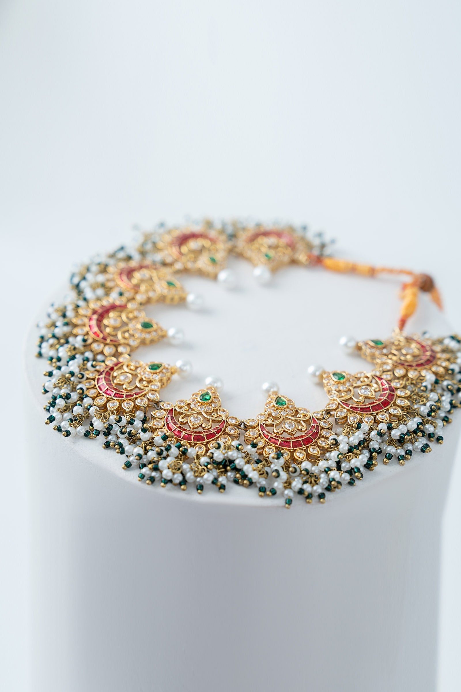 This charming 2Pc necklace and earring combination combines the subtle blush of pink chatam, the soft glow of white pearls, and the deep allure of green onyx in a symphony of tradition. It is a timeless celebration of tradition, adorned with elaborate green and white poth pyroi and caressed by delicate pink enamel. It is designed to provide elegance and poetic appeal to your joyful moments.