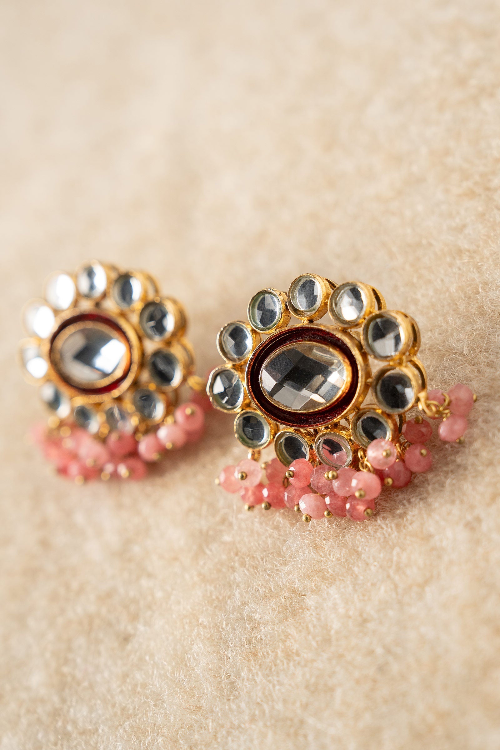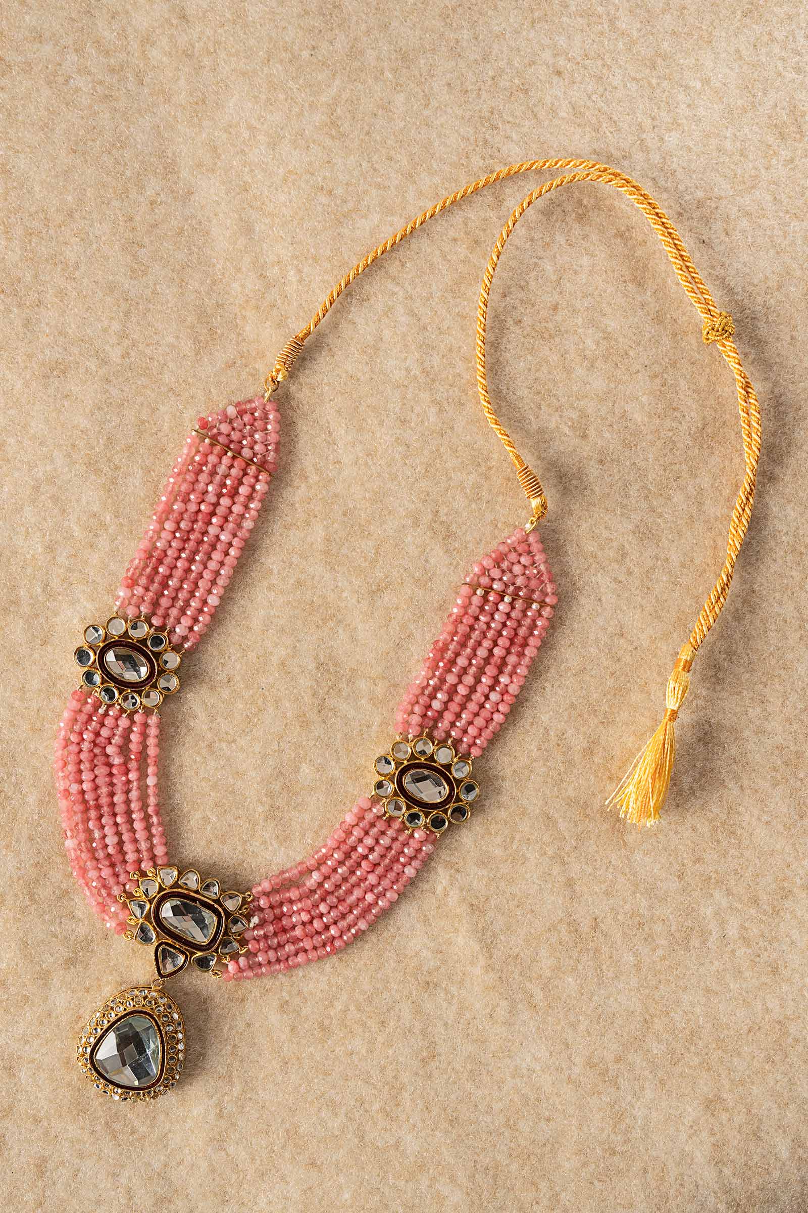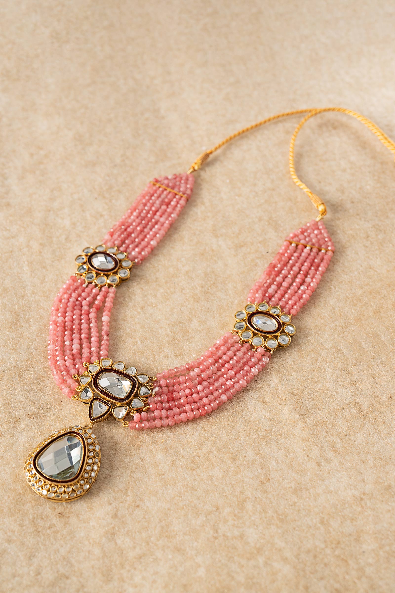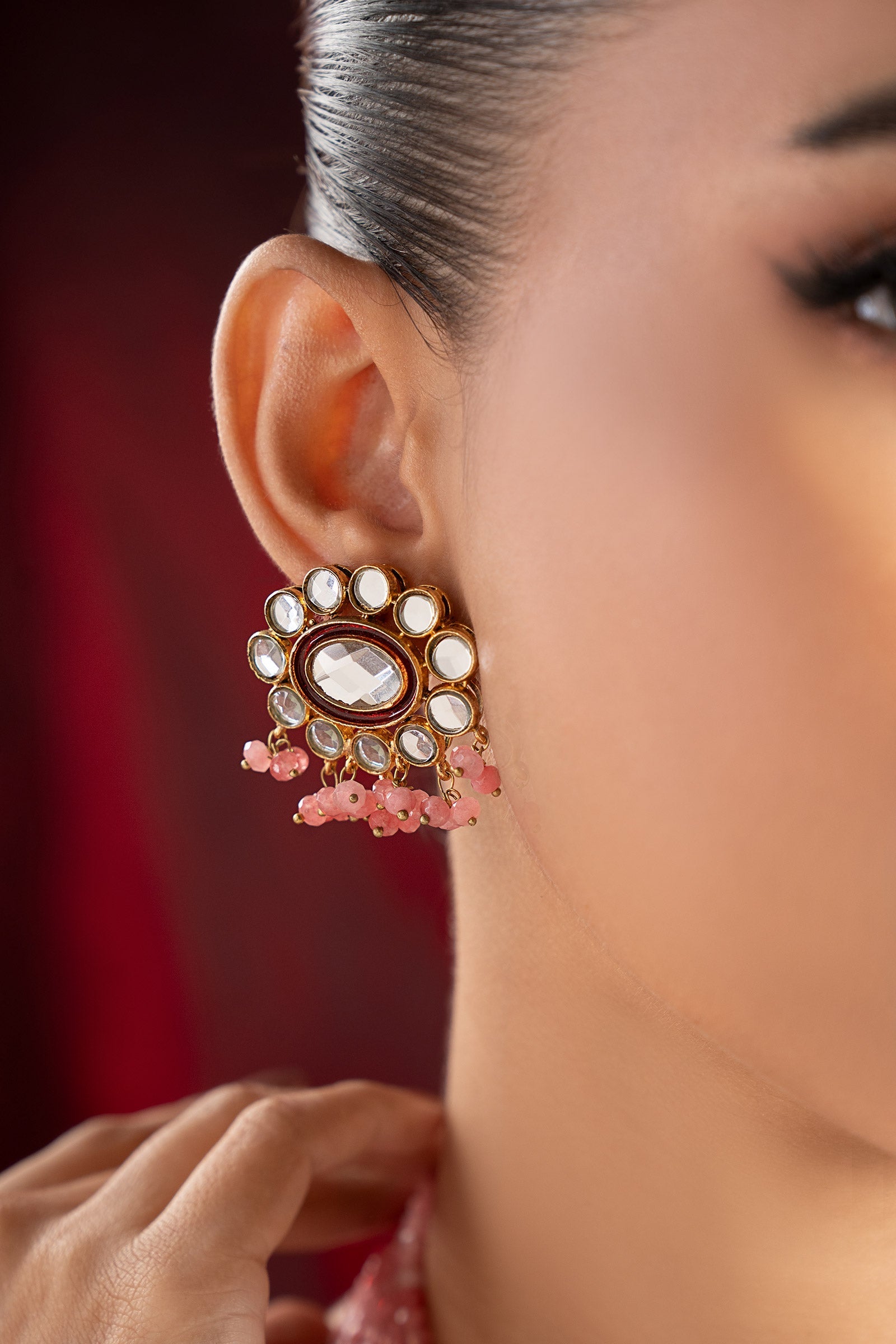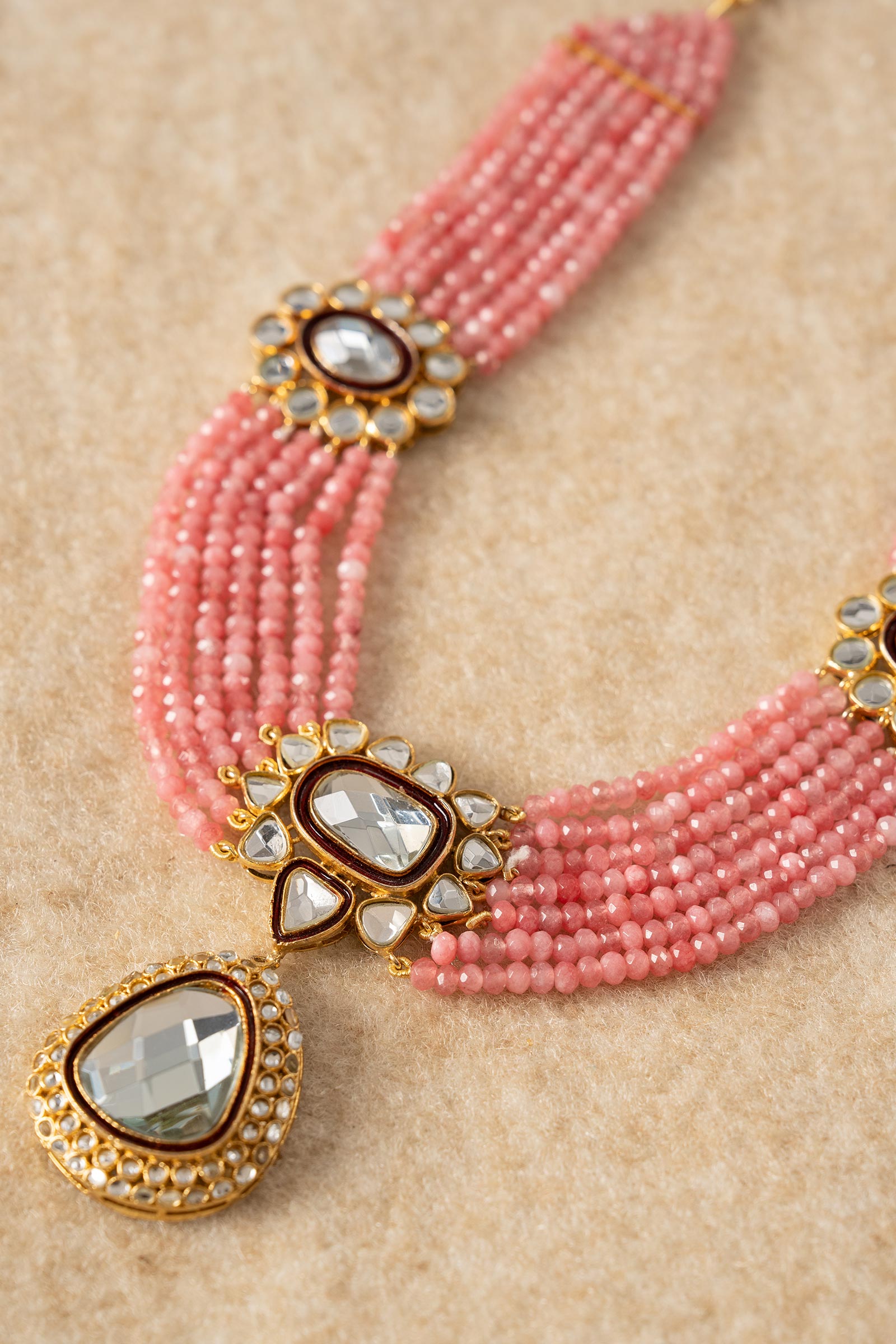 This lovely 2PC necklace and earrings combination combines the delicate blush of light pink onyx with the immaculate shine of white handcut glass in a charming fusion of tradition and color. It is a poetic homage to tradition, designed to add timeless charm to your celebrations, and it is accentuated with vivid red enamel, capturing the essence of festive joy and timeless elegance.