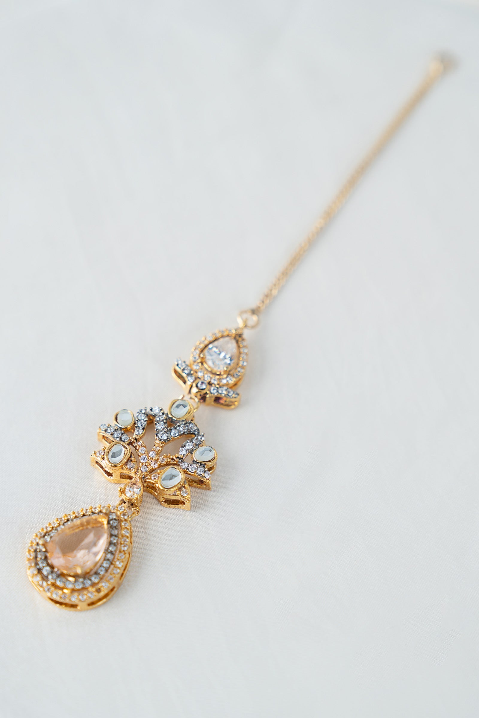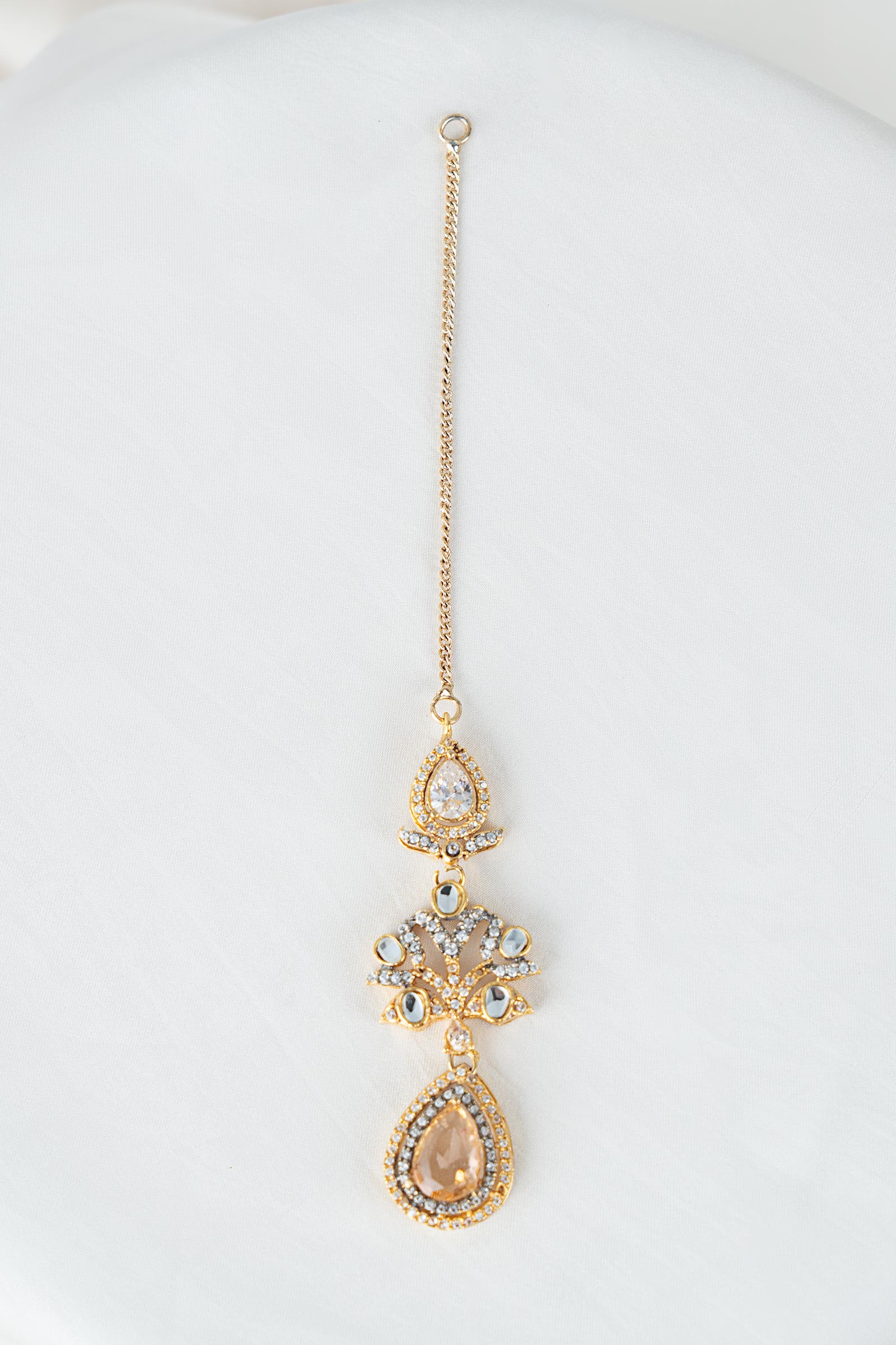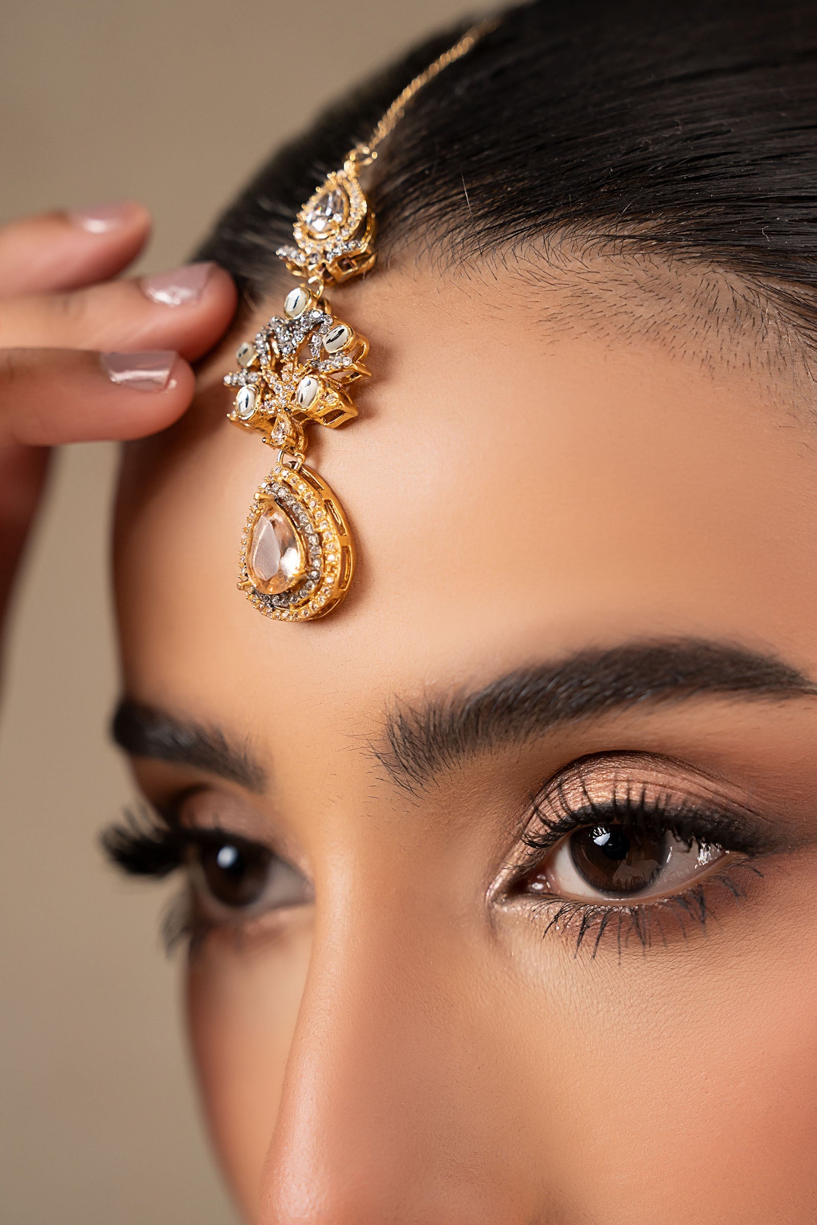 This traditional and elegantly ornamented classic tikka reflects the elegance of regal charm and is the ideal crown jewel for your festive ensemble. It showcases the everlasting shine of white handcut glass and is exquisitely framed with delicate champagne and white zircons.