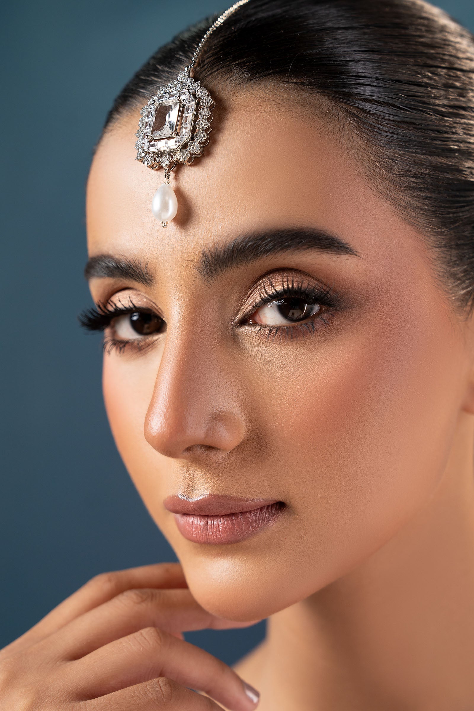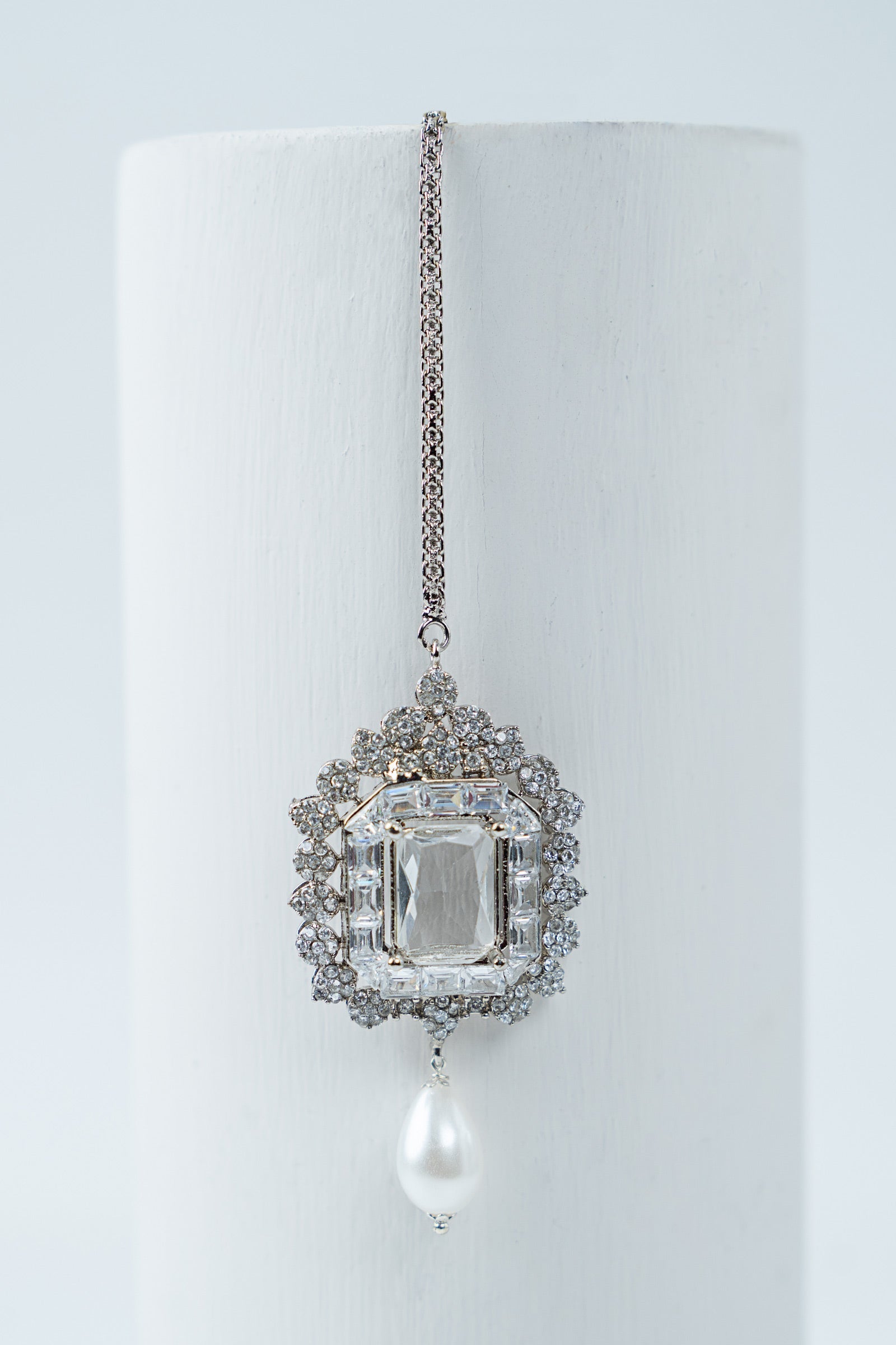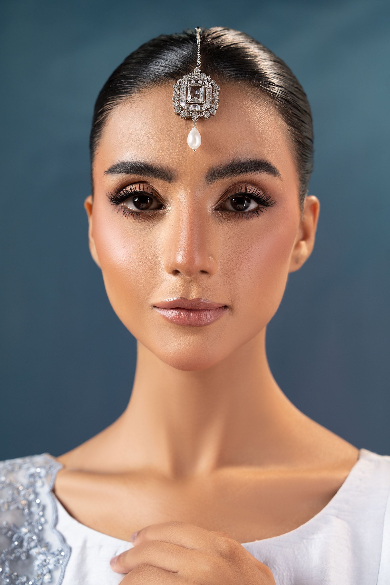 Exuding sophisticated elegance, this modern festive tikka is a timeless accent that will add a touch of regal appeal and modern refinement to your ensemble. It includes the rich allure of white zircons finished with a graceful white drop pearl.