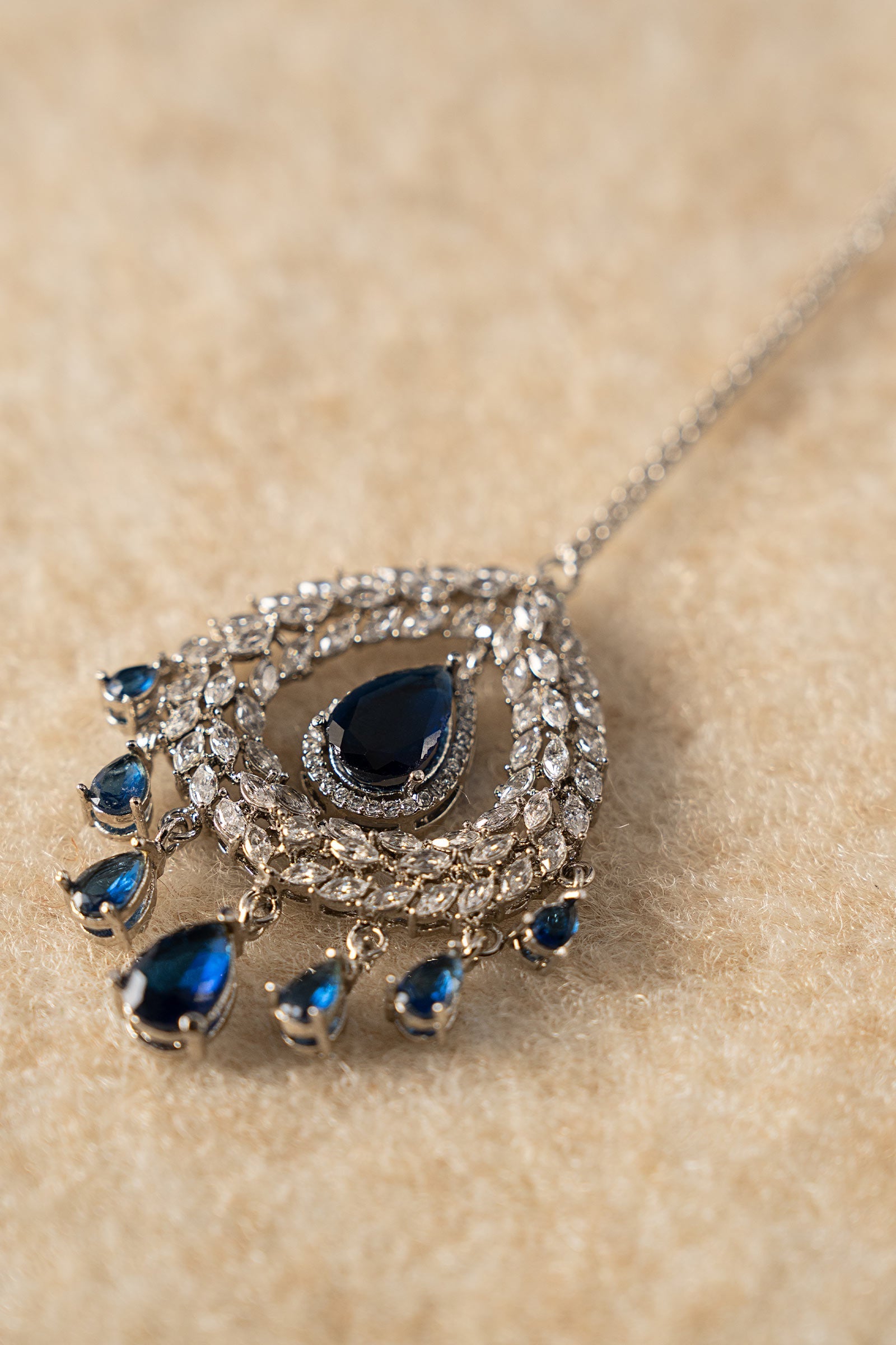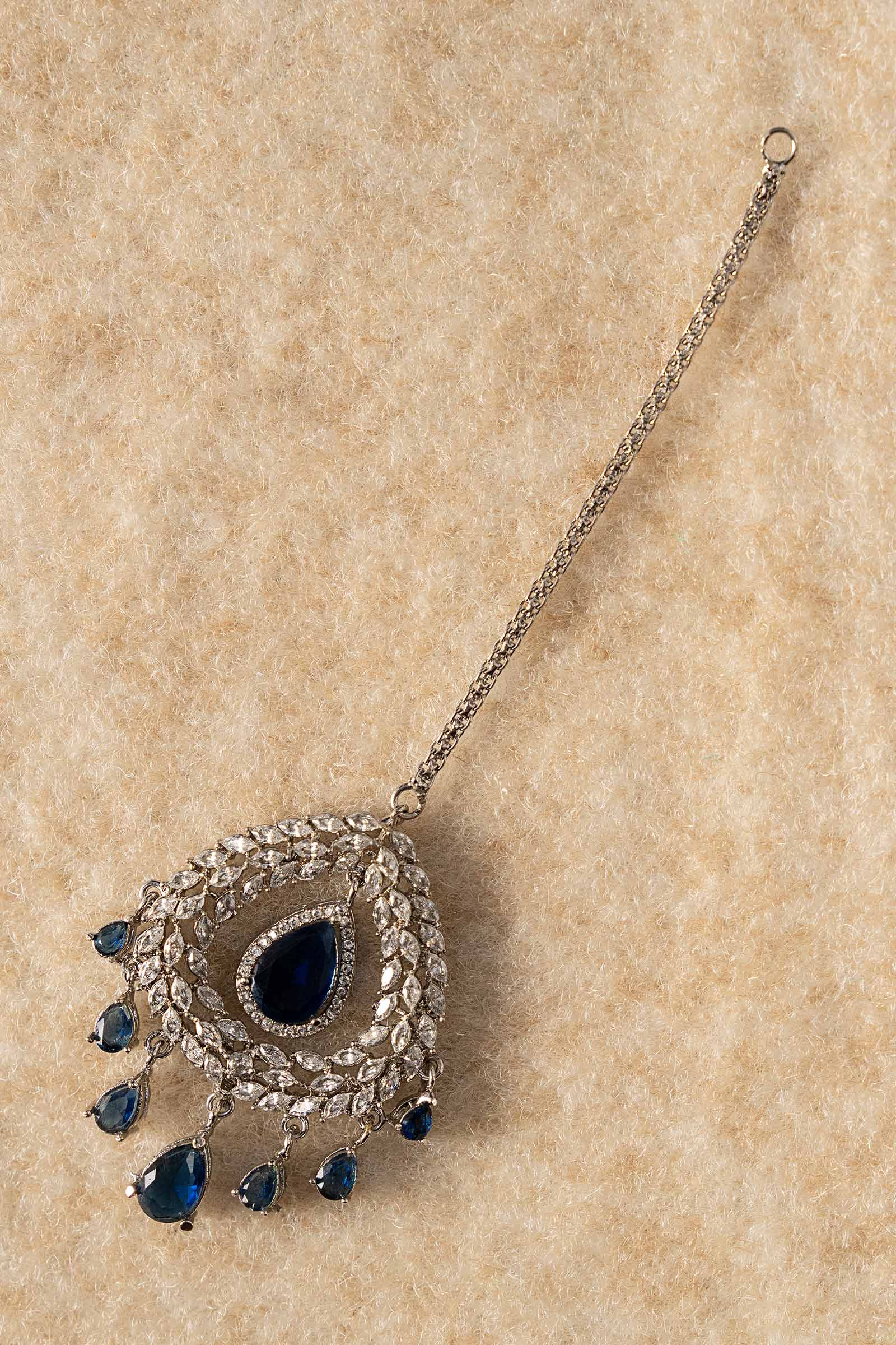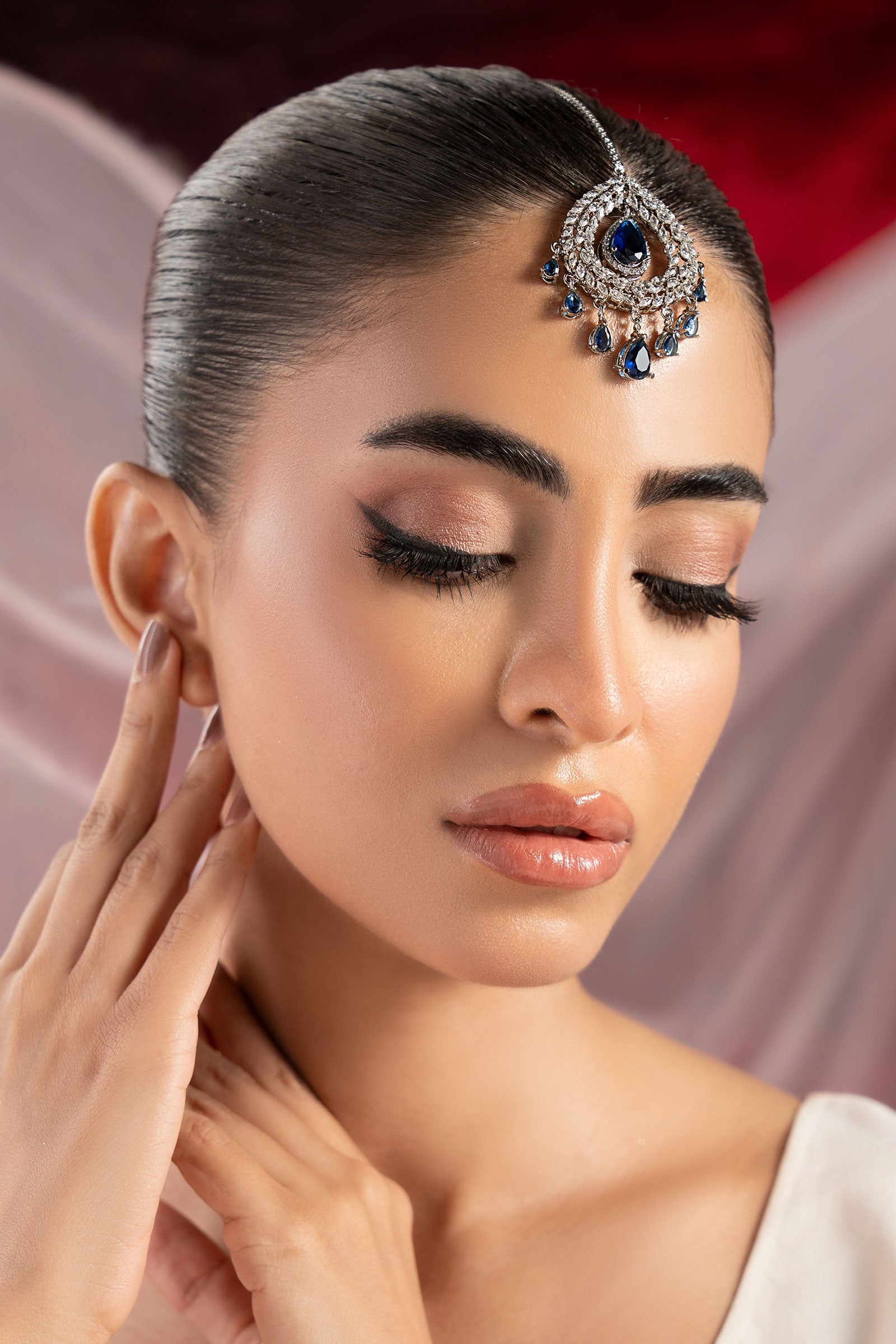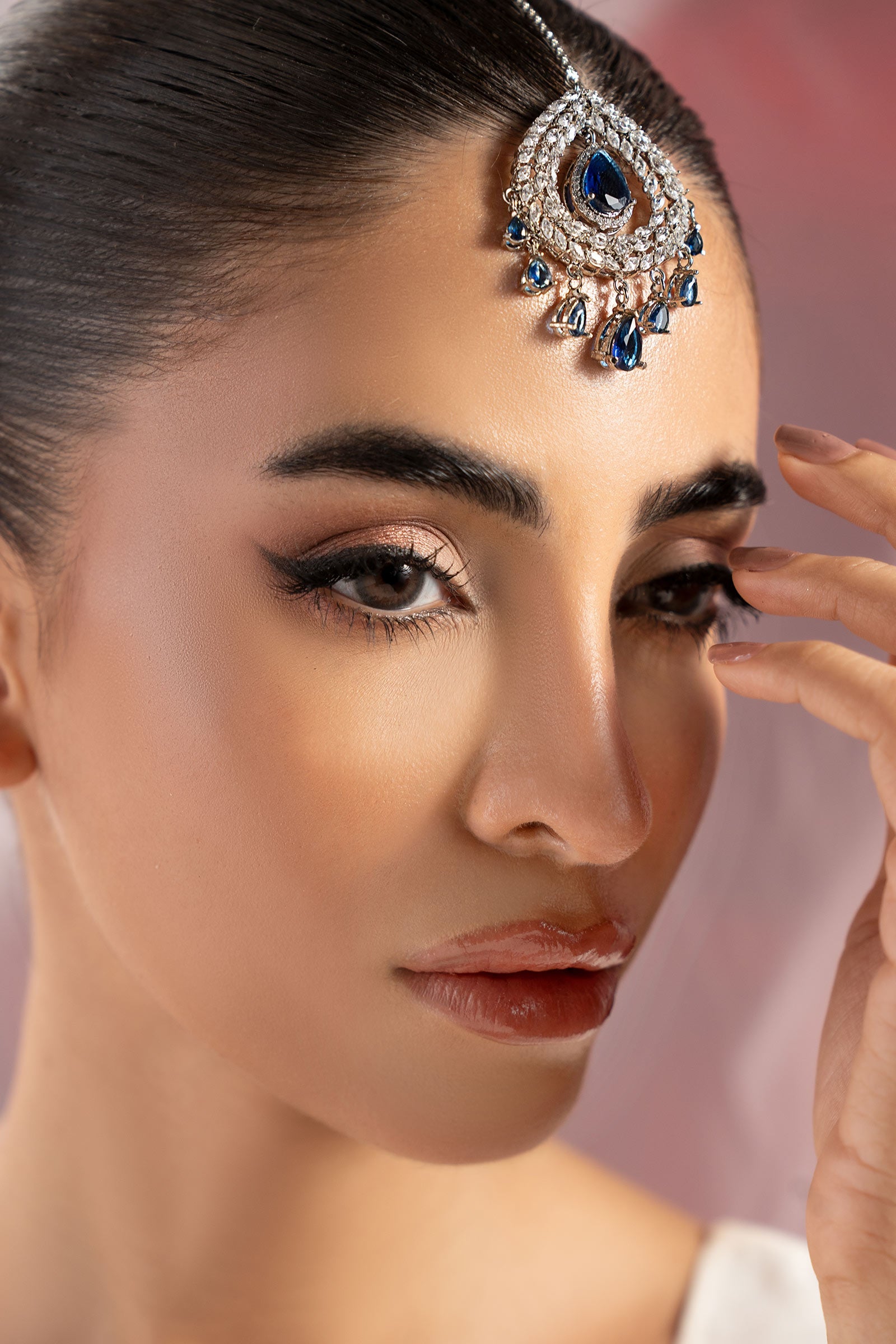 This magnificent tikka, which sparkles with the brilliance of white zircons and the royal allure of sapphire blue, is a statement of modern elegance. It adds a lovely harmony of tradition and modern charm to your festive costume and is made to sit elegantly at the center of your celebration appearance.