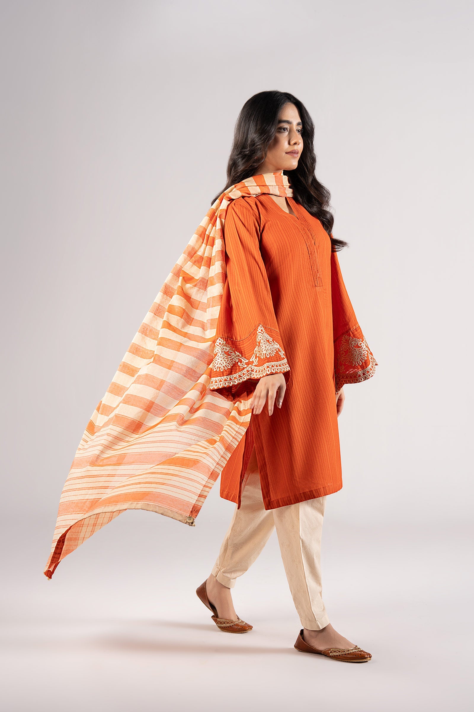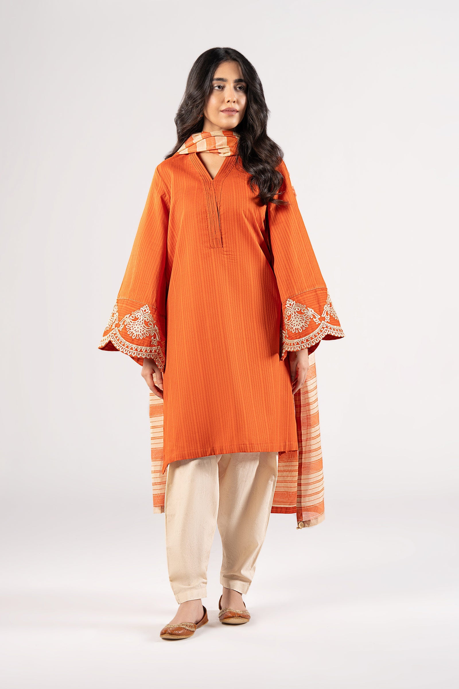 ShirtTextured Straight-Cut ShirtOverlap Neckline With Pleats DetailingEmbroidered Scalloped Border SleevesColor: OrangeFabric: Textured CottonFit: RegularDupattaDyed Bold Stripe Dupatta Color: OrangeFabric: Yarn Dyed Model is wearing size xsNote: Dry Clean Only