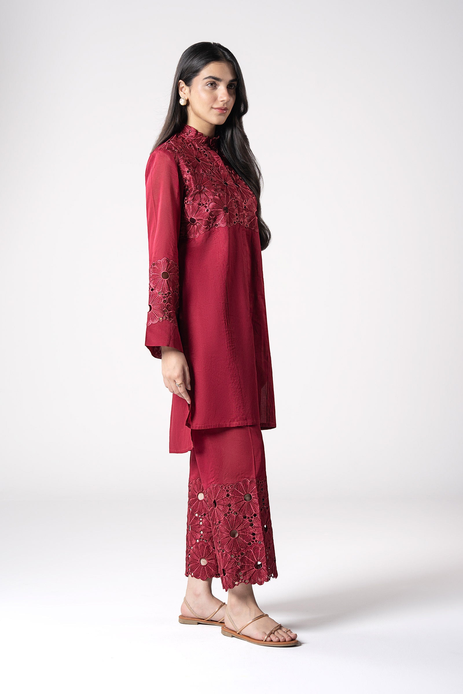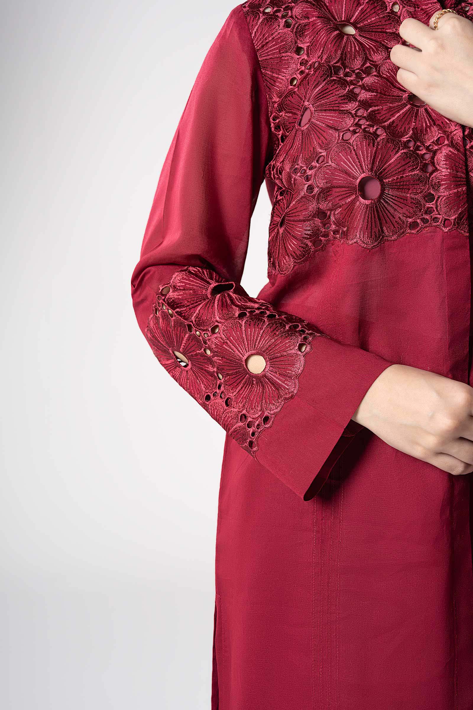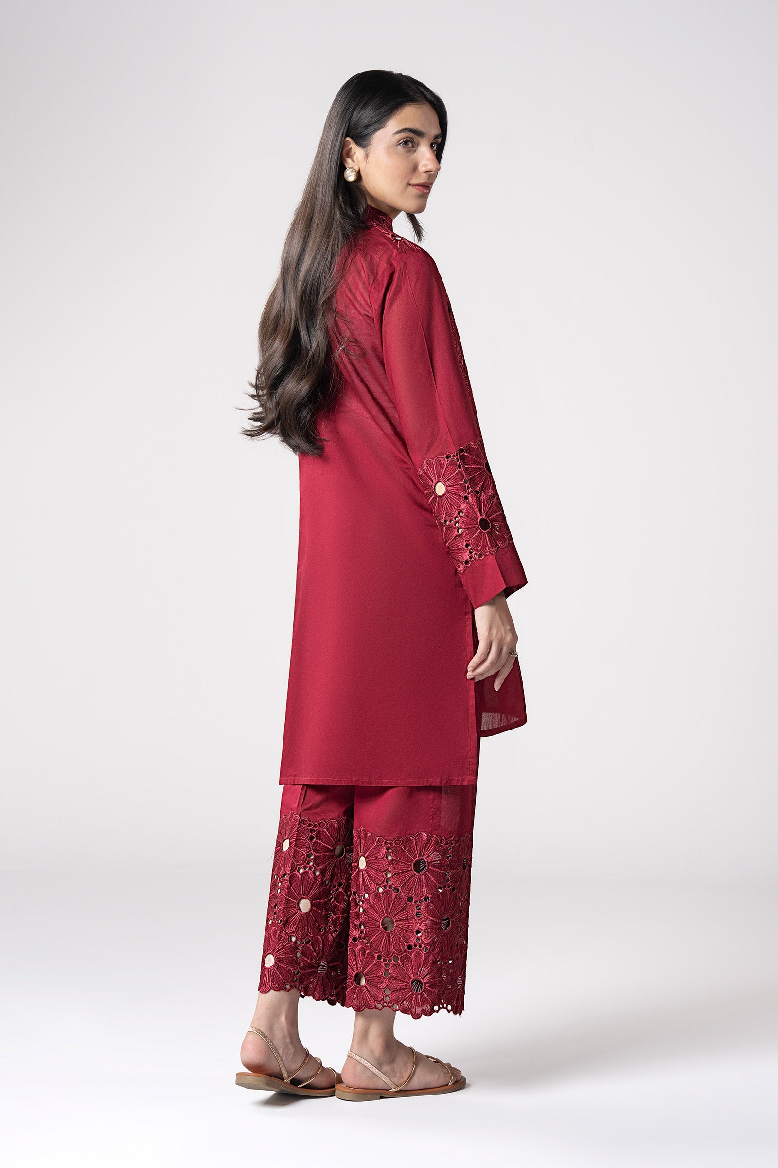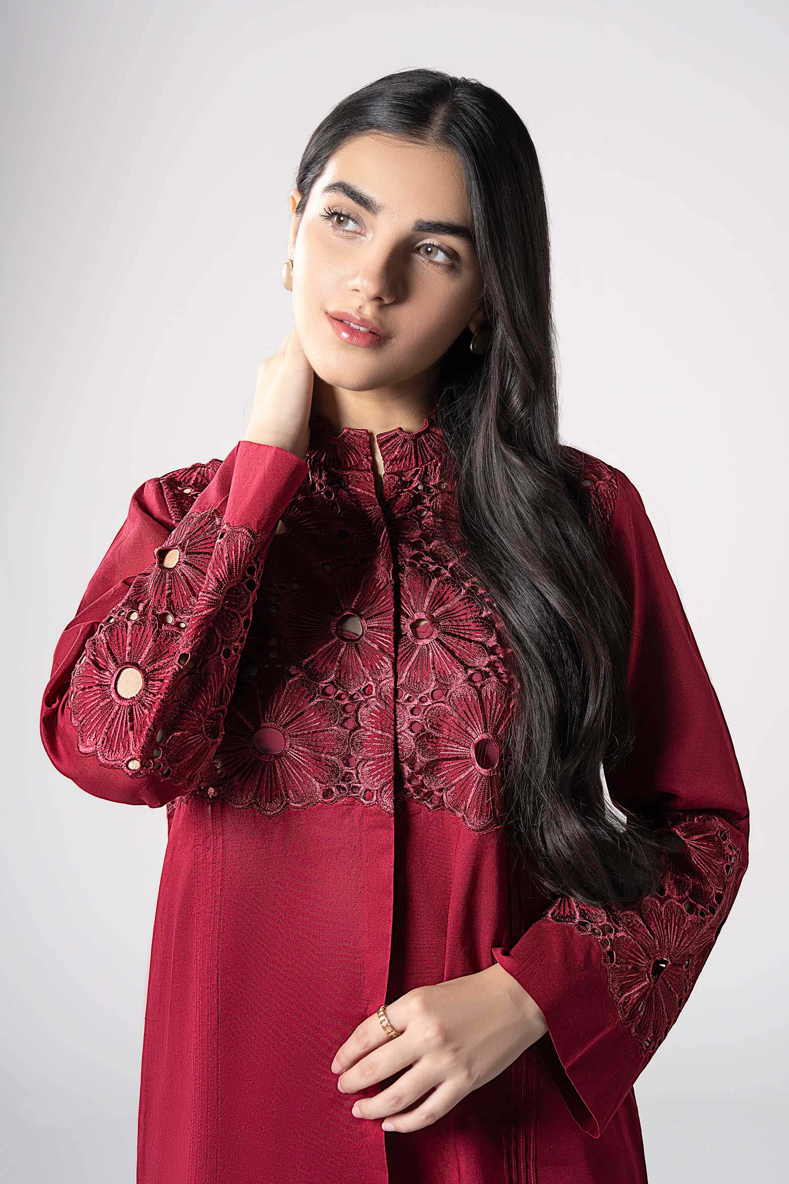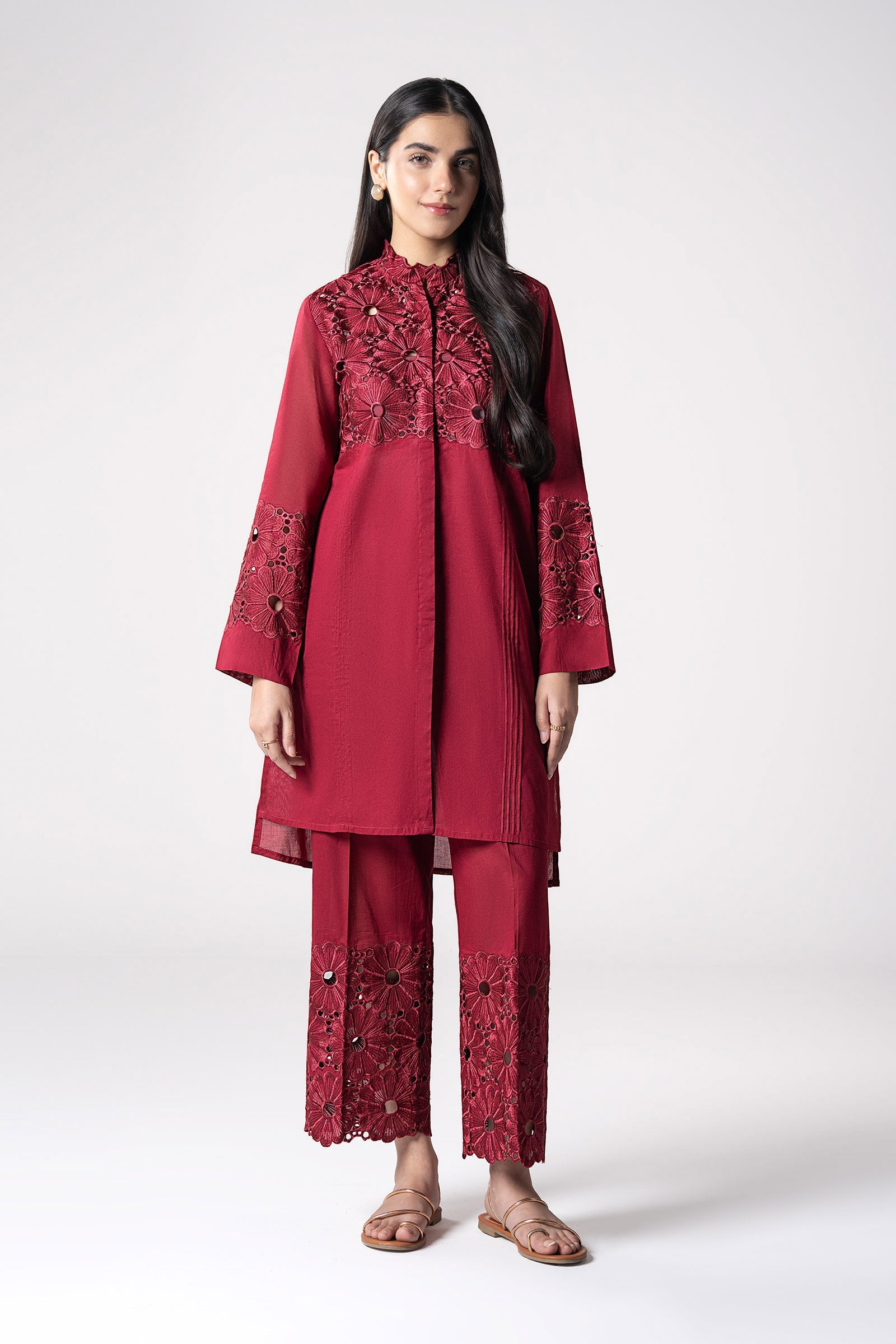 ShirtButton Down ShirtEmbroidered Ban NecklineDyed Embroidered FrontDyed Embroidered Sleeves With CuffDyed BackColor: MaroonFabric: LawnFit: RegularTrousersDyed Cropped PantsElasticated WaistbandEmbroidered HemColor: MaroonFabric: CambricFit: RegularModel is wearing size xsNote: Dry Clean Only