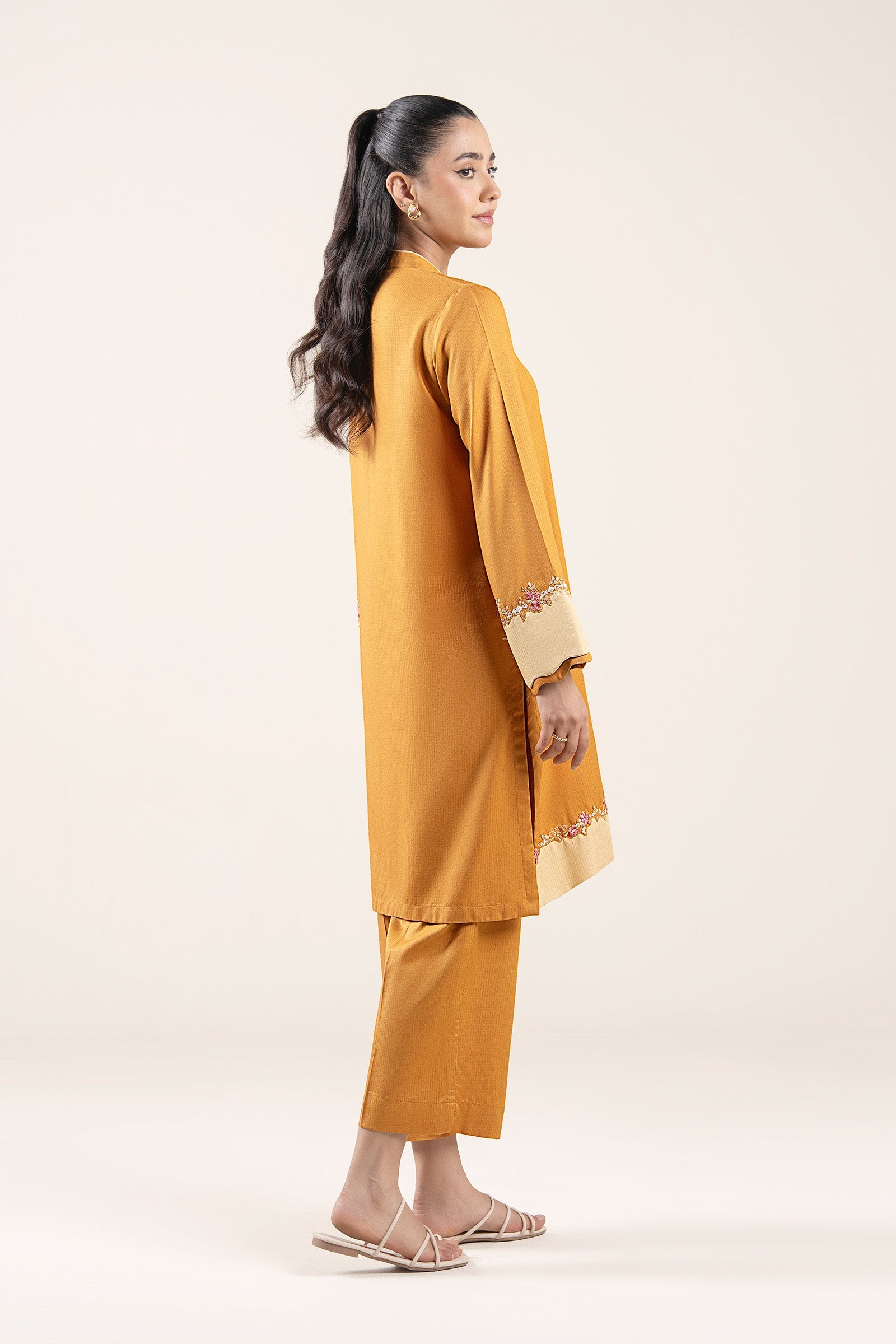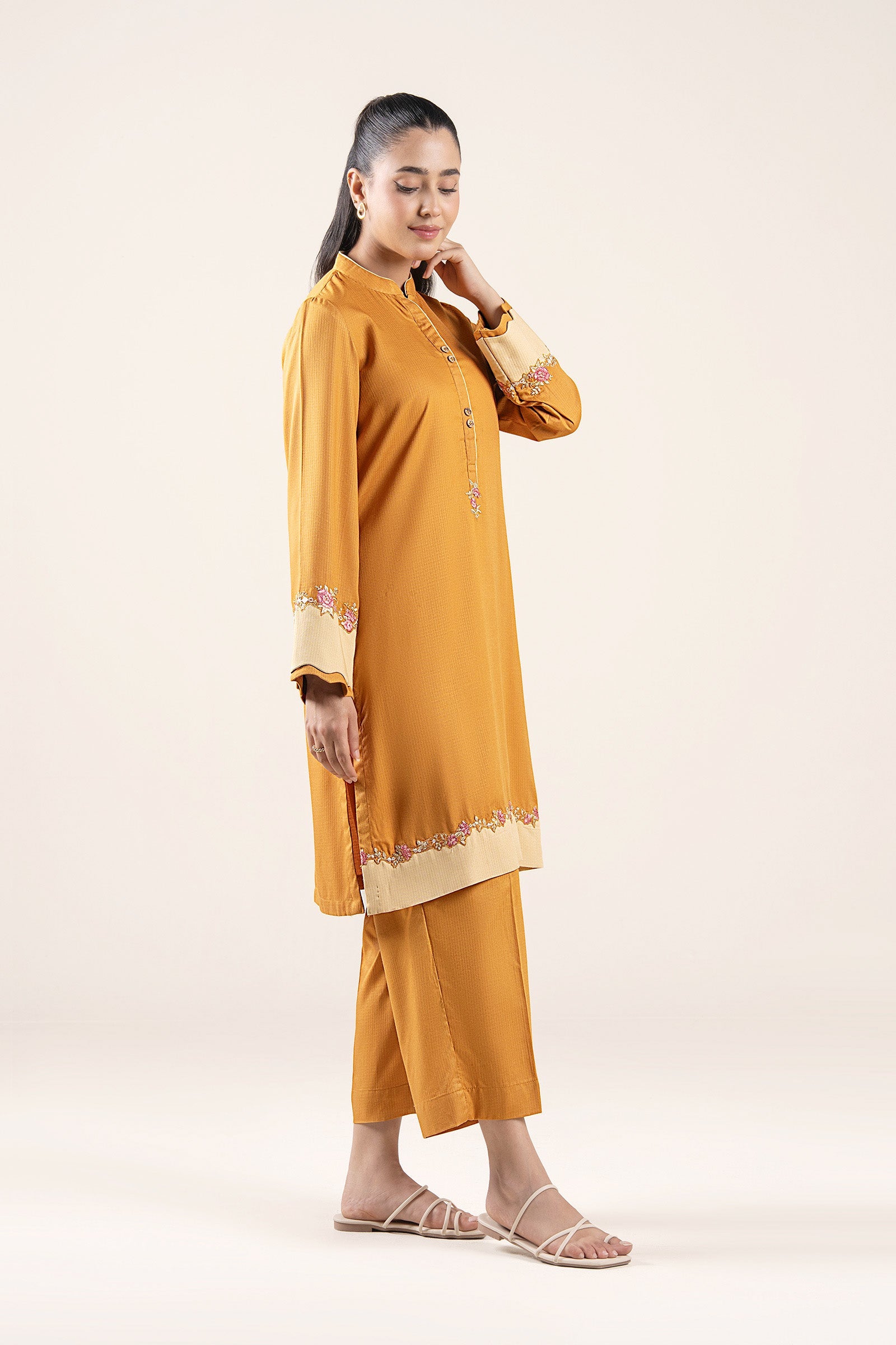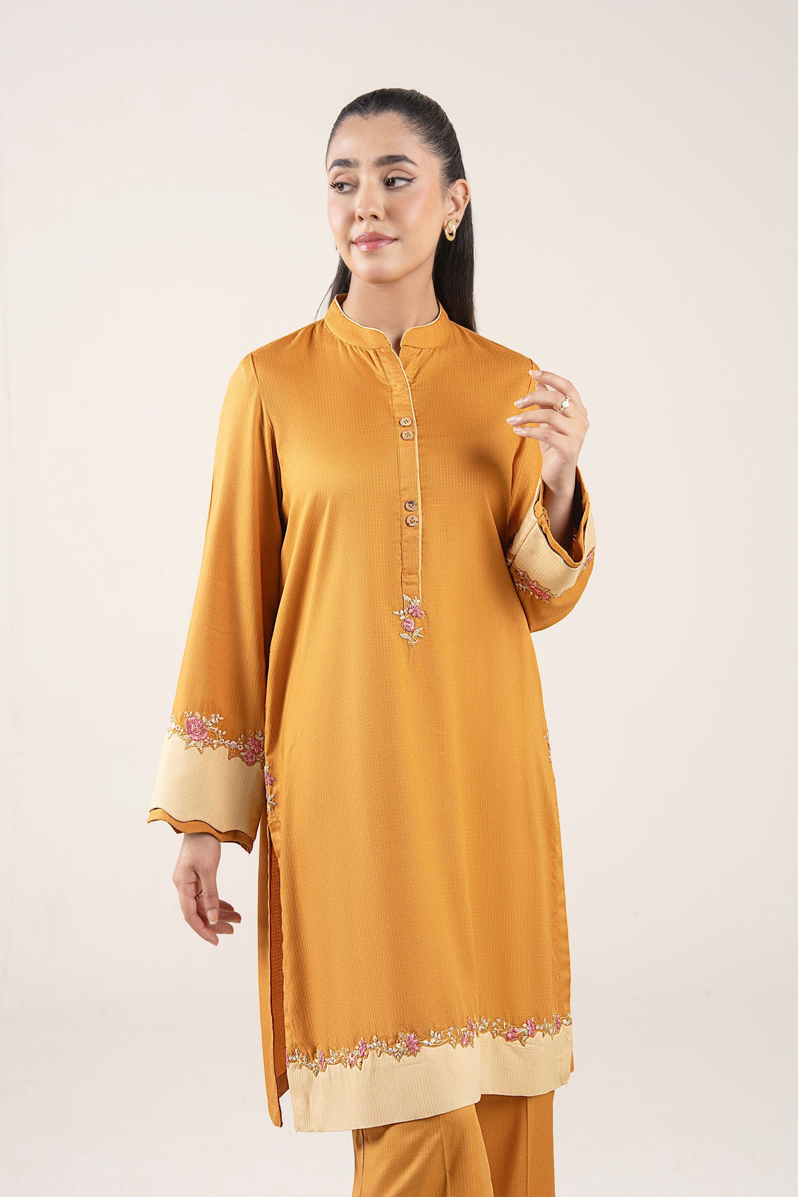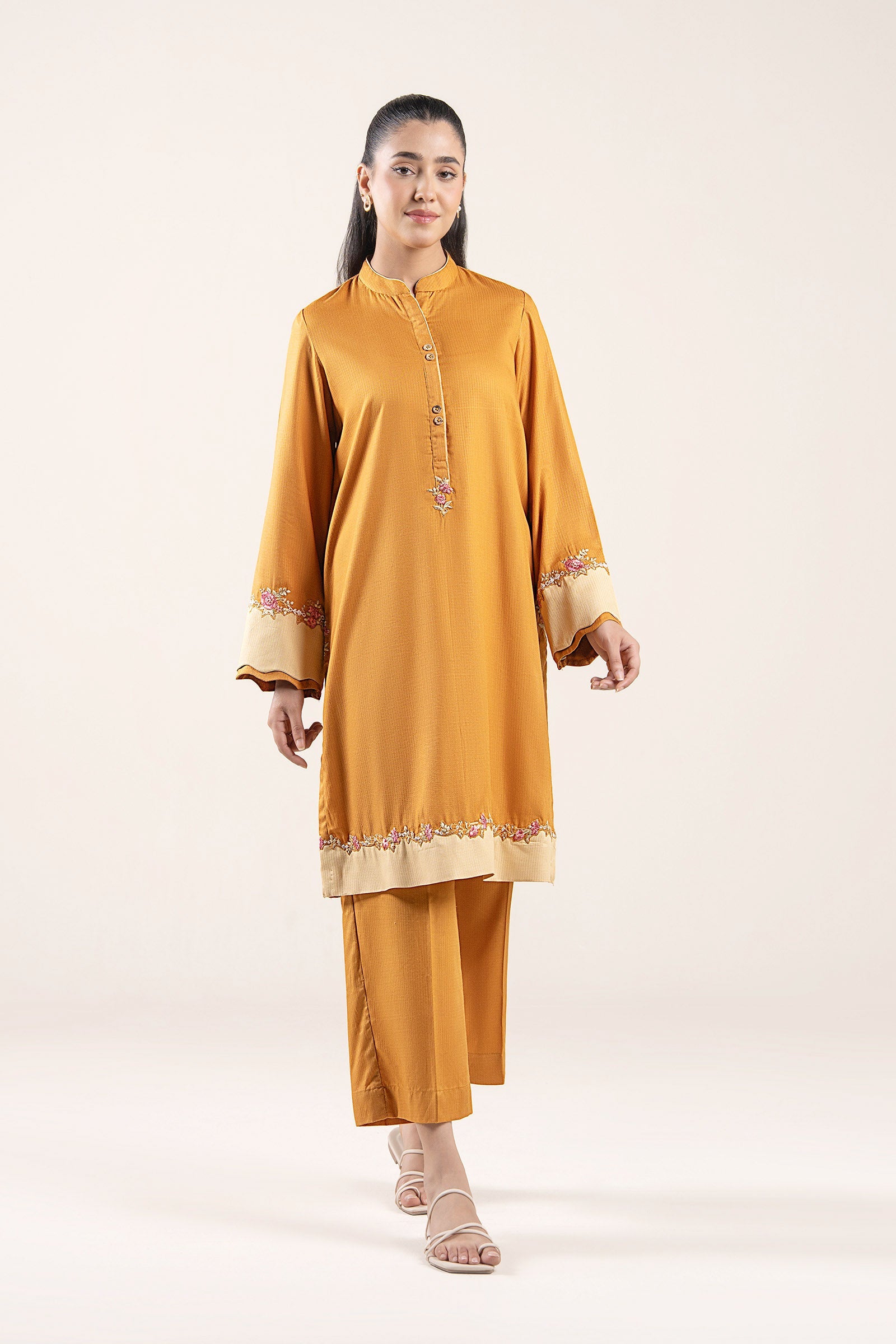 ShirtDyed Straight-Cut ShirtBan Collar Neckline With Embroidery & Buttons DetailingContrast Border With Embroidered FrontFull Sleeves With Printed & Dyed Contrast Embroidered BorderColor: MustardFabric: RipstopFit: RegularTrousersPrinted CulottesElasticated WaistbandColor: MustardFabric: RipstopFit: RegularModel is wearing xs sizeNote: Dry Clean Only