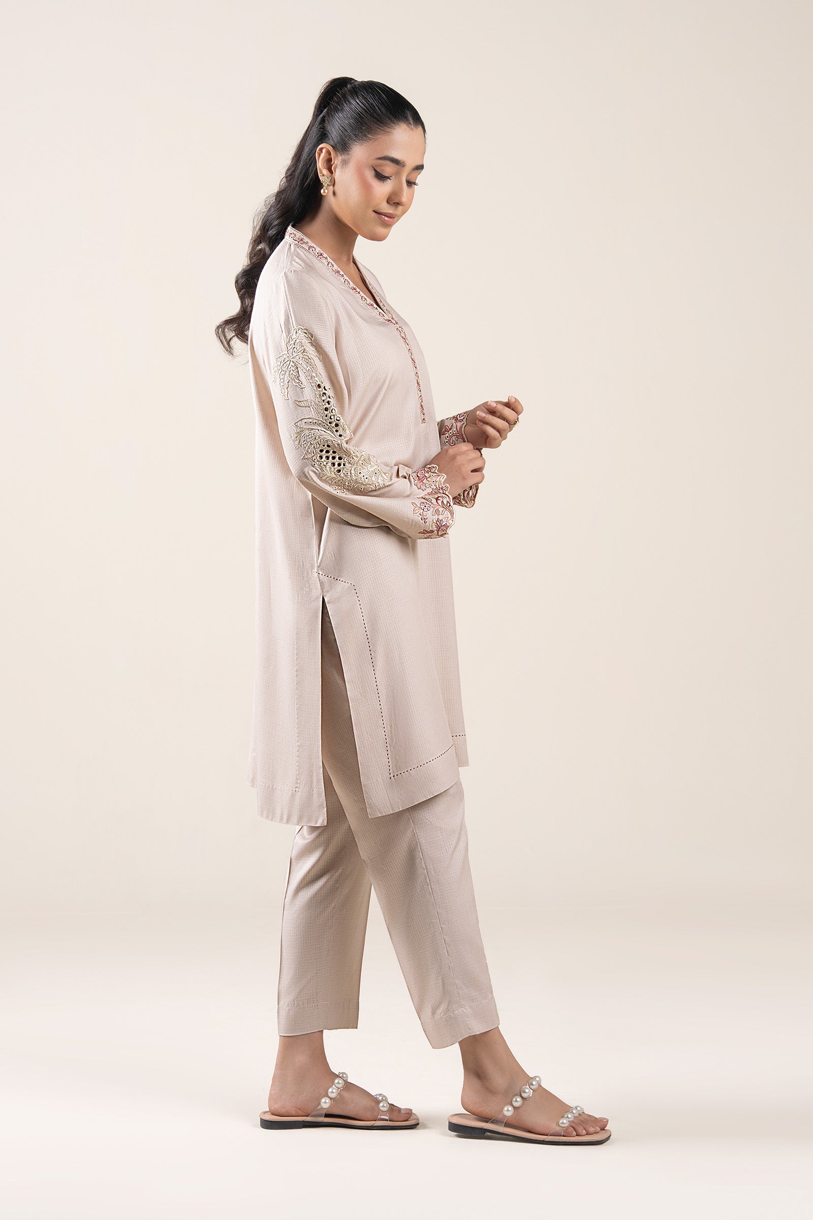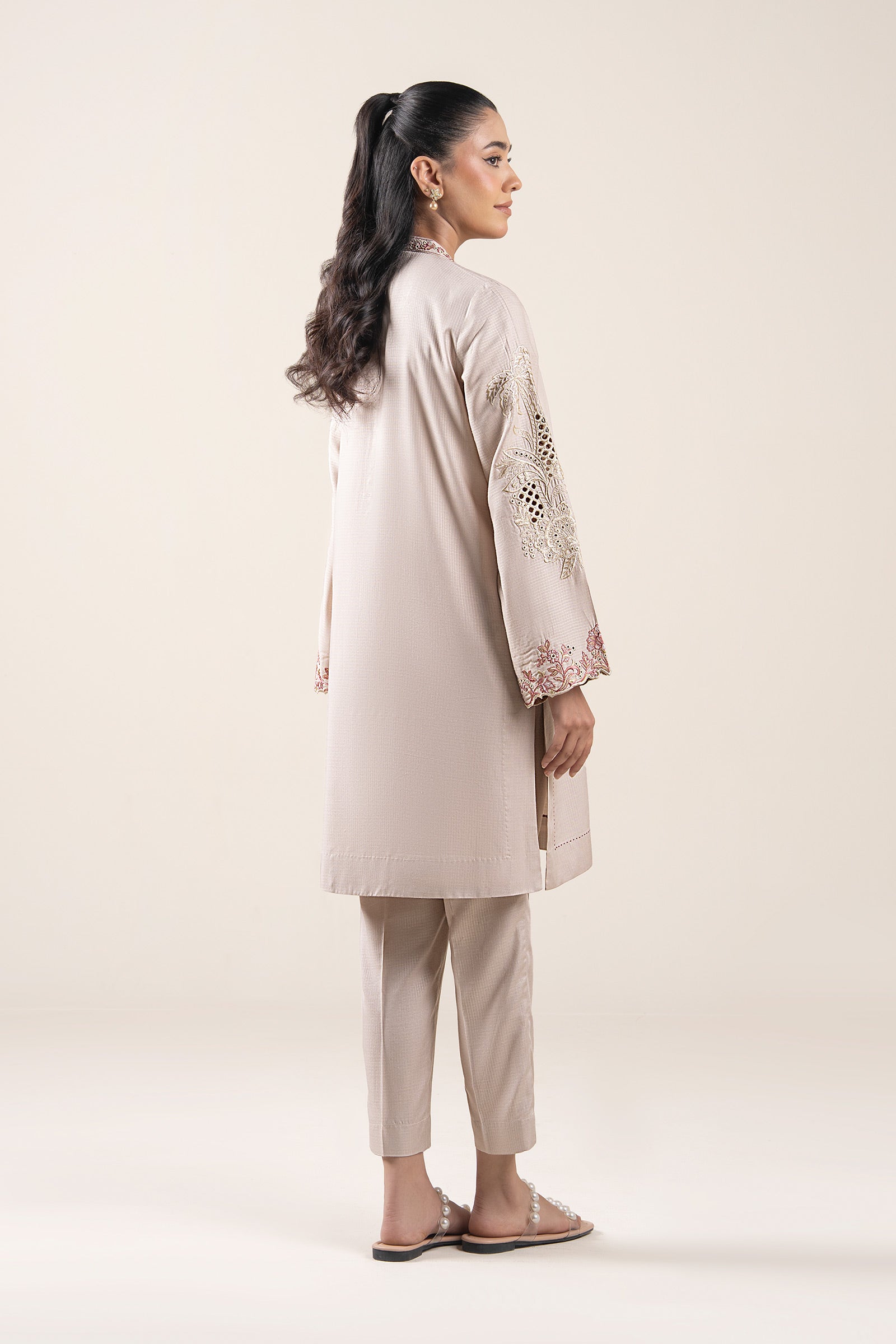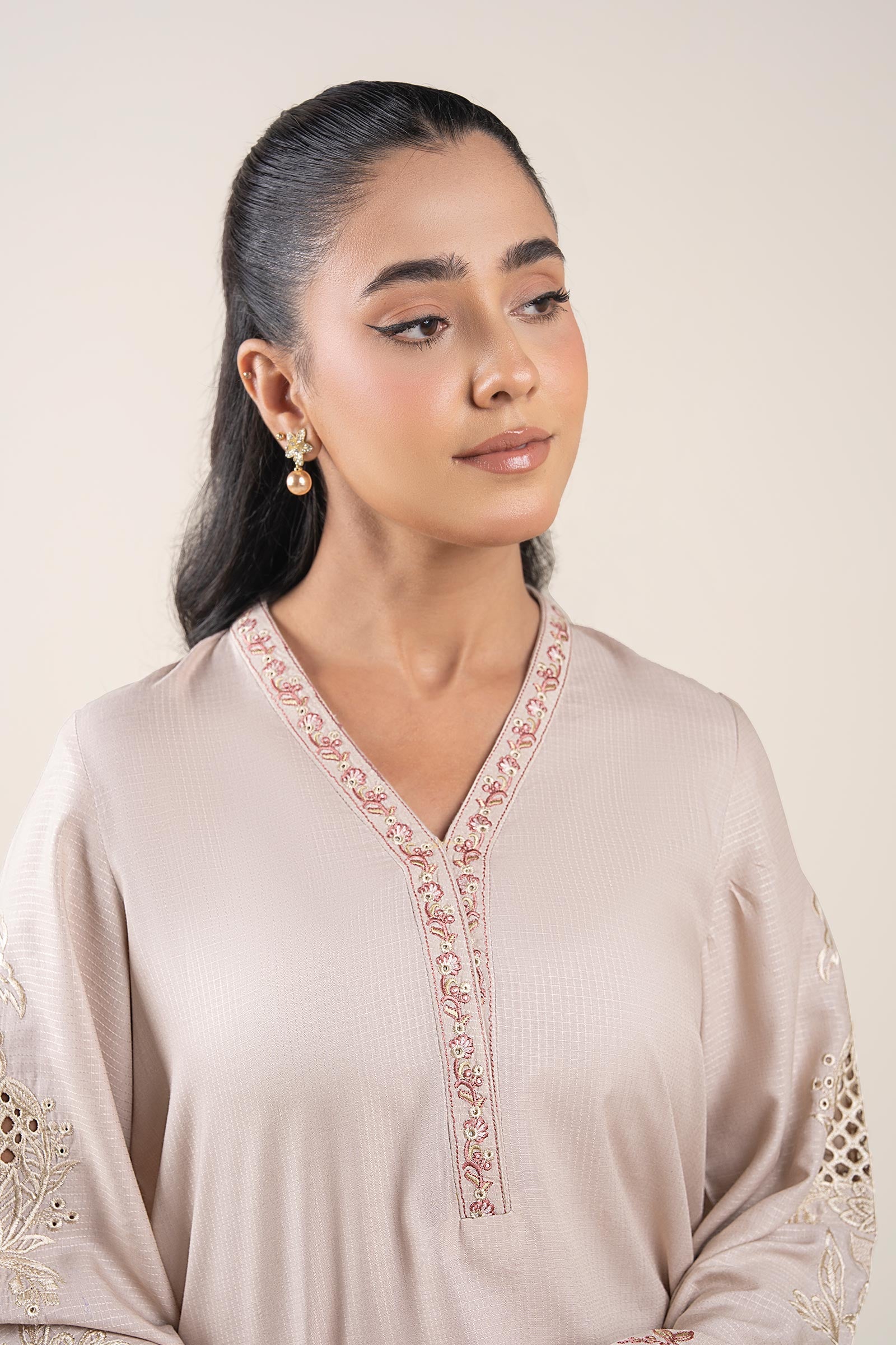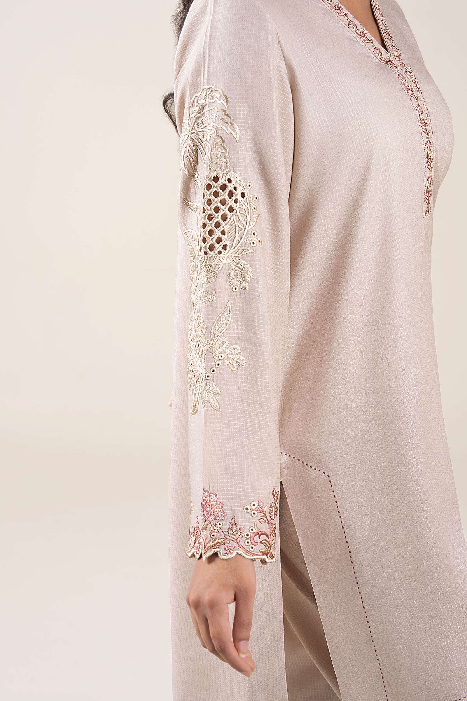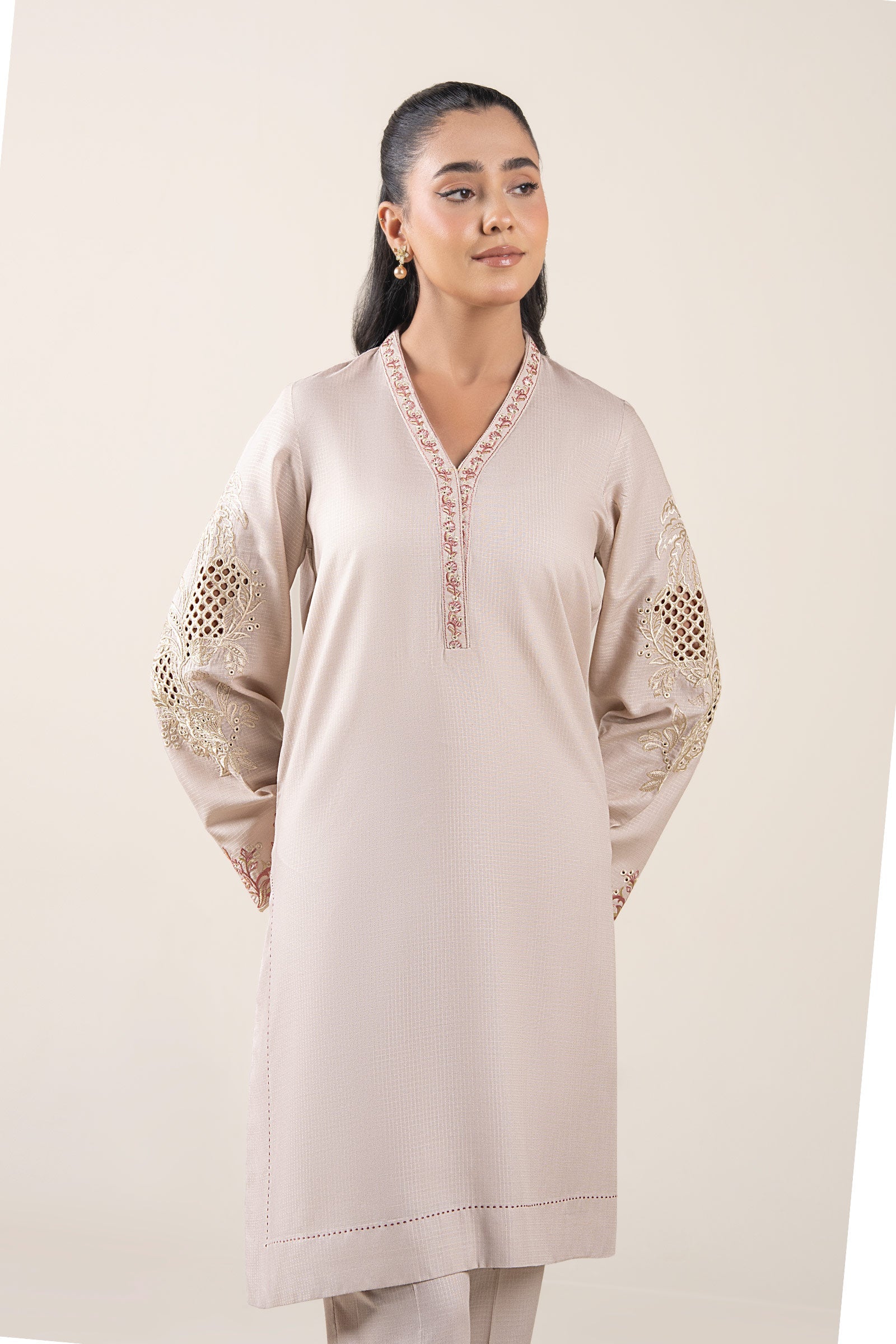 Shirt Dyed Straight Cut Shirt Embroidered Overlap Neckline Full Sleeves With Embroidered Motif & Border Color: Off White Fabric: Ripstop Fit: Regular Trousers Straight Trouser Elasticated Waistband Color: Off White Fabric: Ripstop Fit: Regular Model is wearing xs size Note: Dry Clean Only