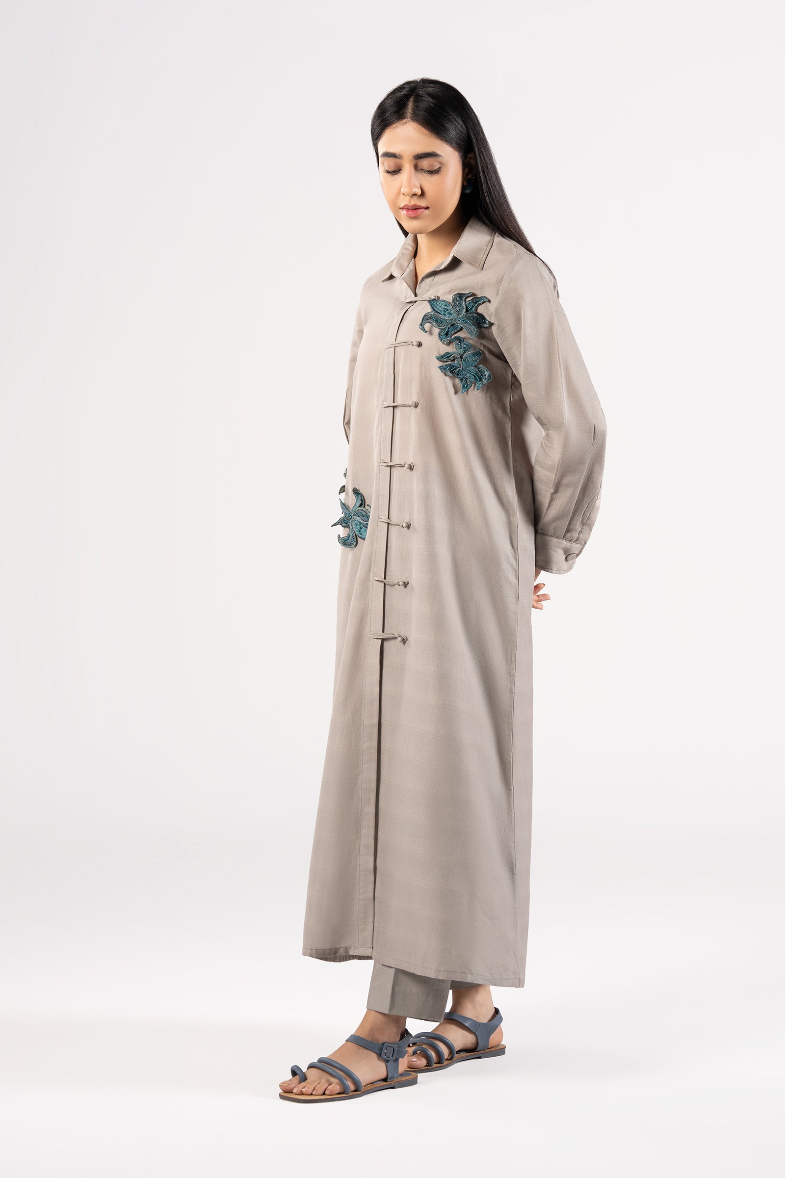 1 Piece - Shirt Straight-Cut Shirt Collar Neckline With Loop-Button Placket Dyed Front With 3D Embroidered Flowers Straight Cuffed Sleeves Dyed Back Color: Grey Fabric: Textured Cotton Fit: Regular Model is wearing size xs Note: Dry Clean Only