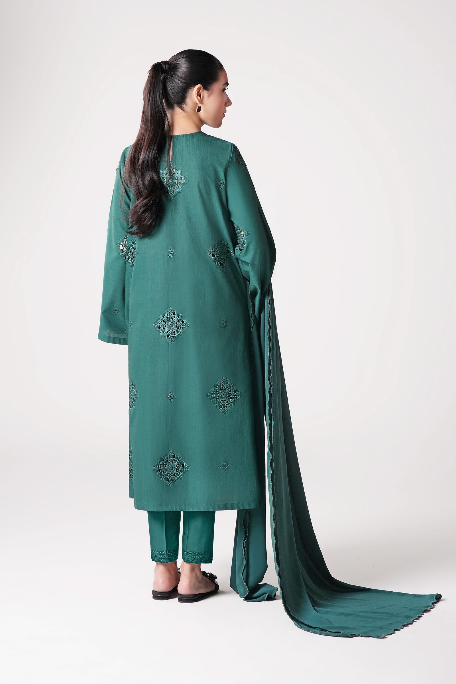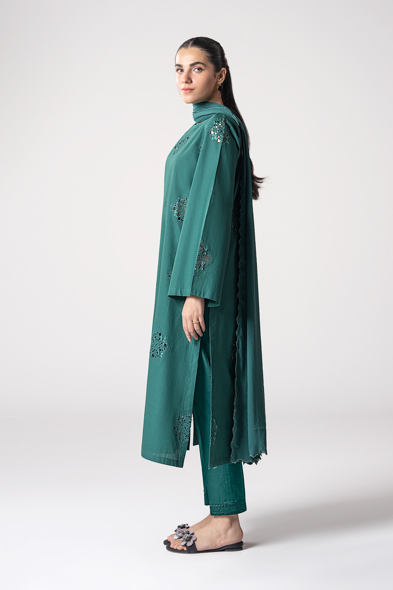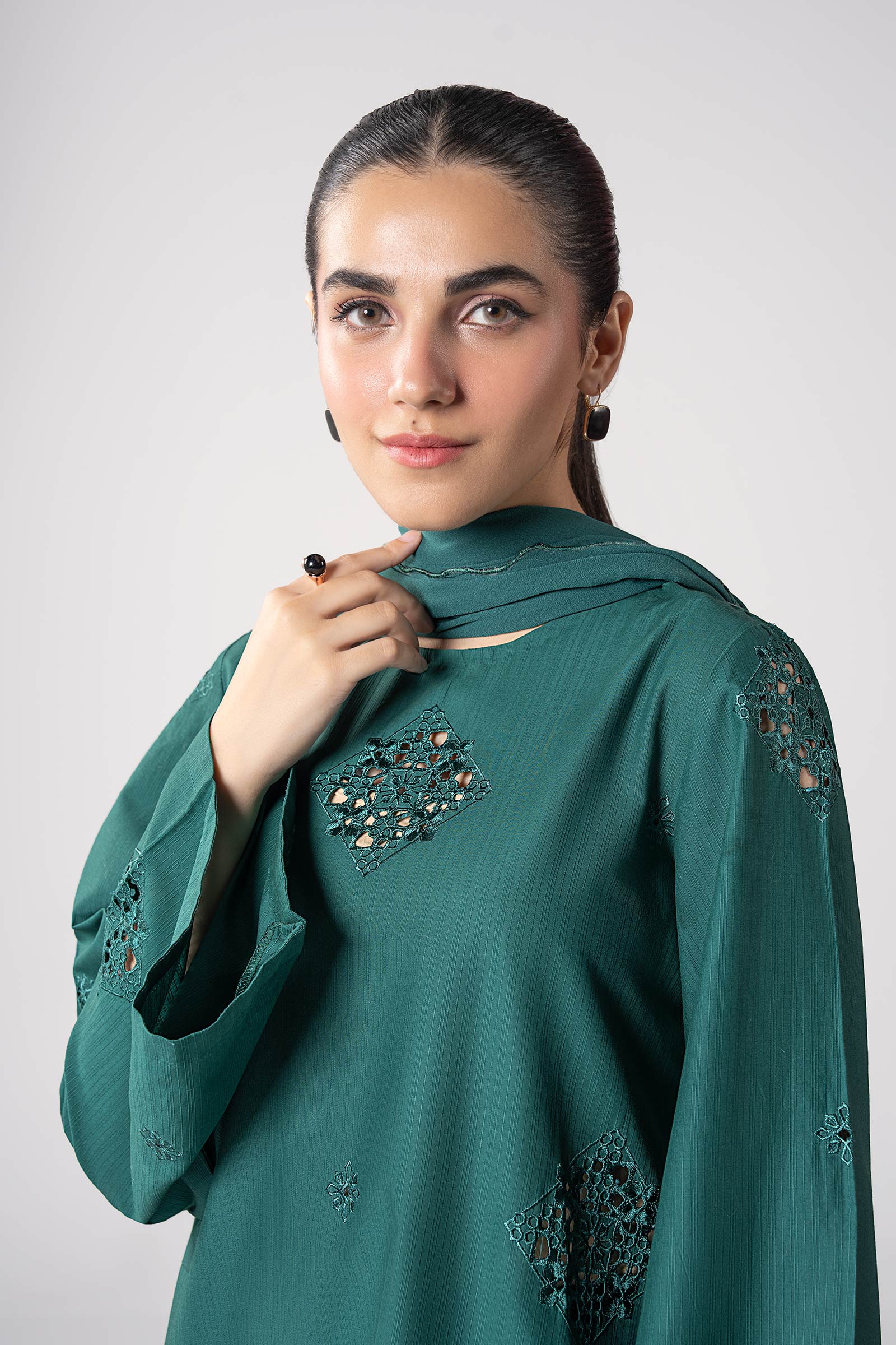 ShirtA-Line ShirtScoop NecklineDyed Front With Boring EmbroideryA-Line SleevesDyed BackColor: Bottle GreenFabric: Textured CottonFit: RegularDupattaDyed DupattaFour-Side Scalloped BorderColor: Bottle GreenFabric: GeorgetteModel is wearing size xsNote: Dry Clean Only