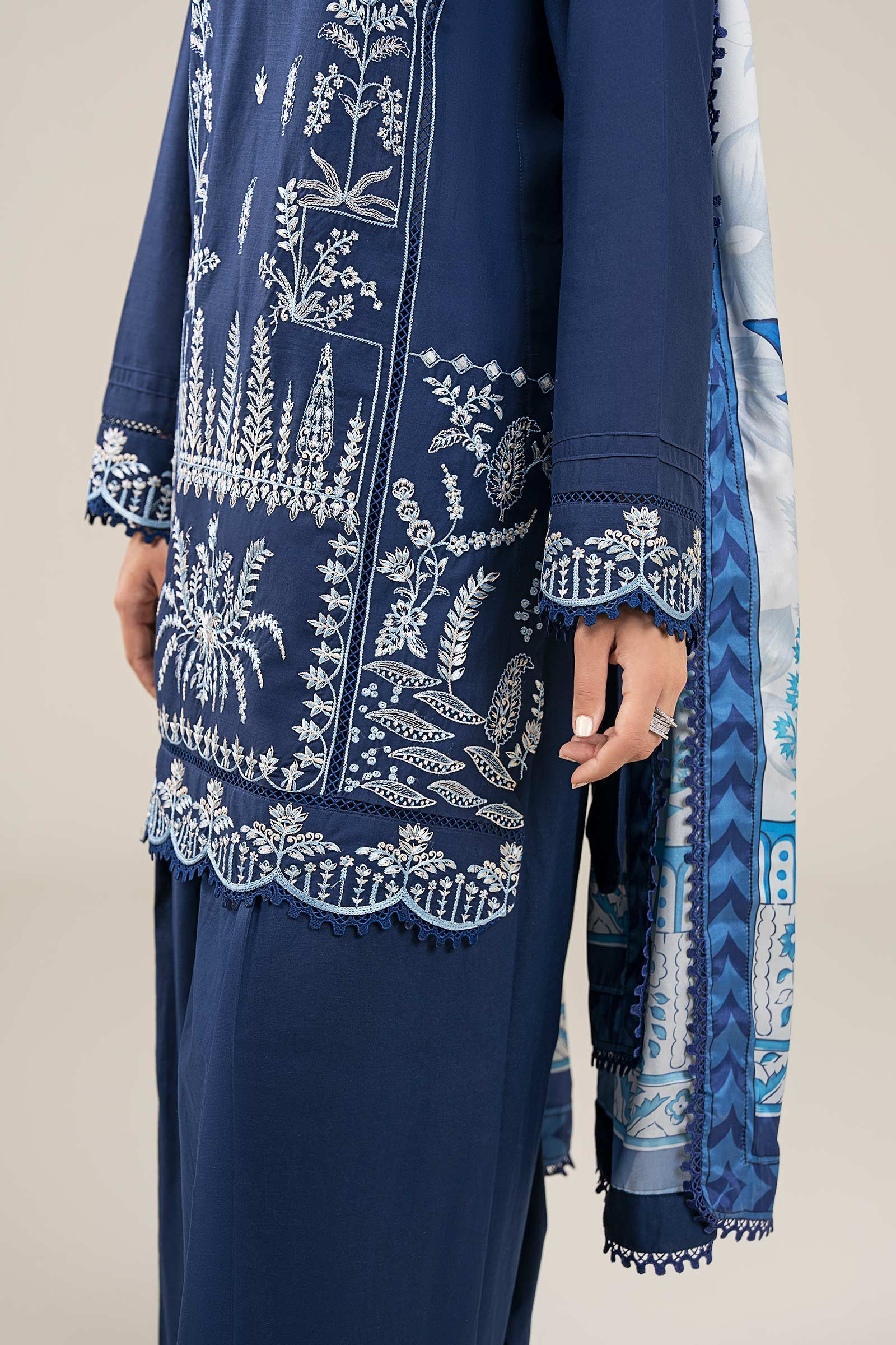 Shirt3 Panel Embroidered Shirtscoop NecklineScalloped Border With Lace DetailingDyed Sleeves With Lace & Embroidered Scalloped BorderColor: BlueFabric: Crosshatch LawnFit: RegularShalwarDyed Farshi ShalwarElasticated WaistbandColor: BlueFabric: CambricFit: RegularDupattaPrinted DupattaColor: BlueFabric: Tissue SilkModel is wearing size xsNote: Dry Clean Only