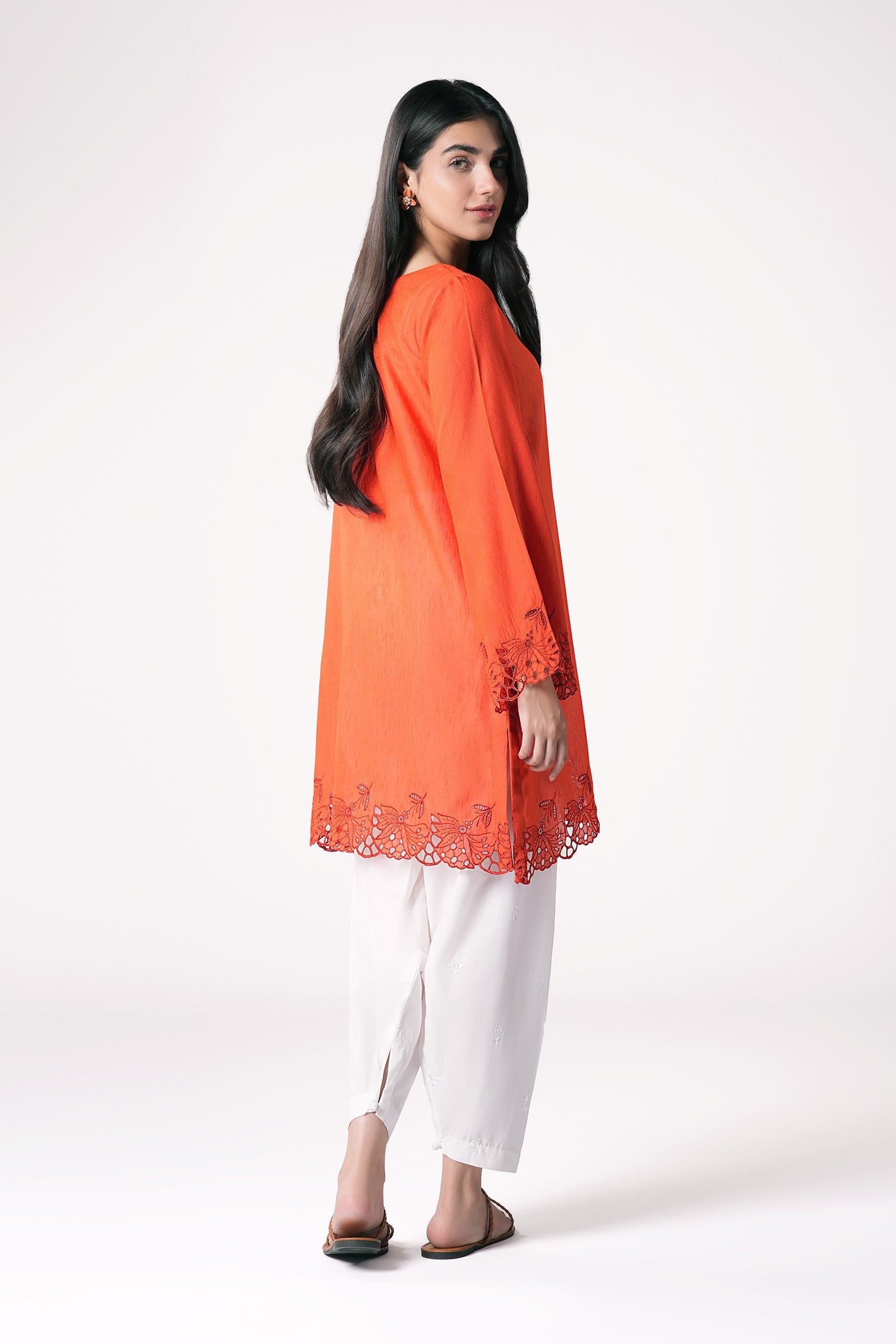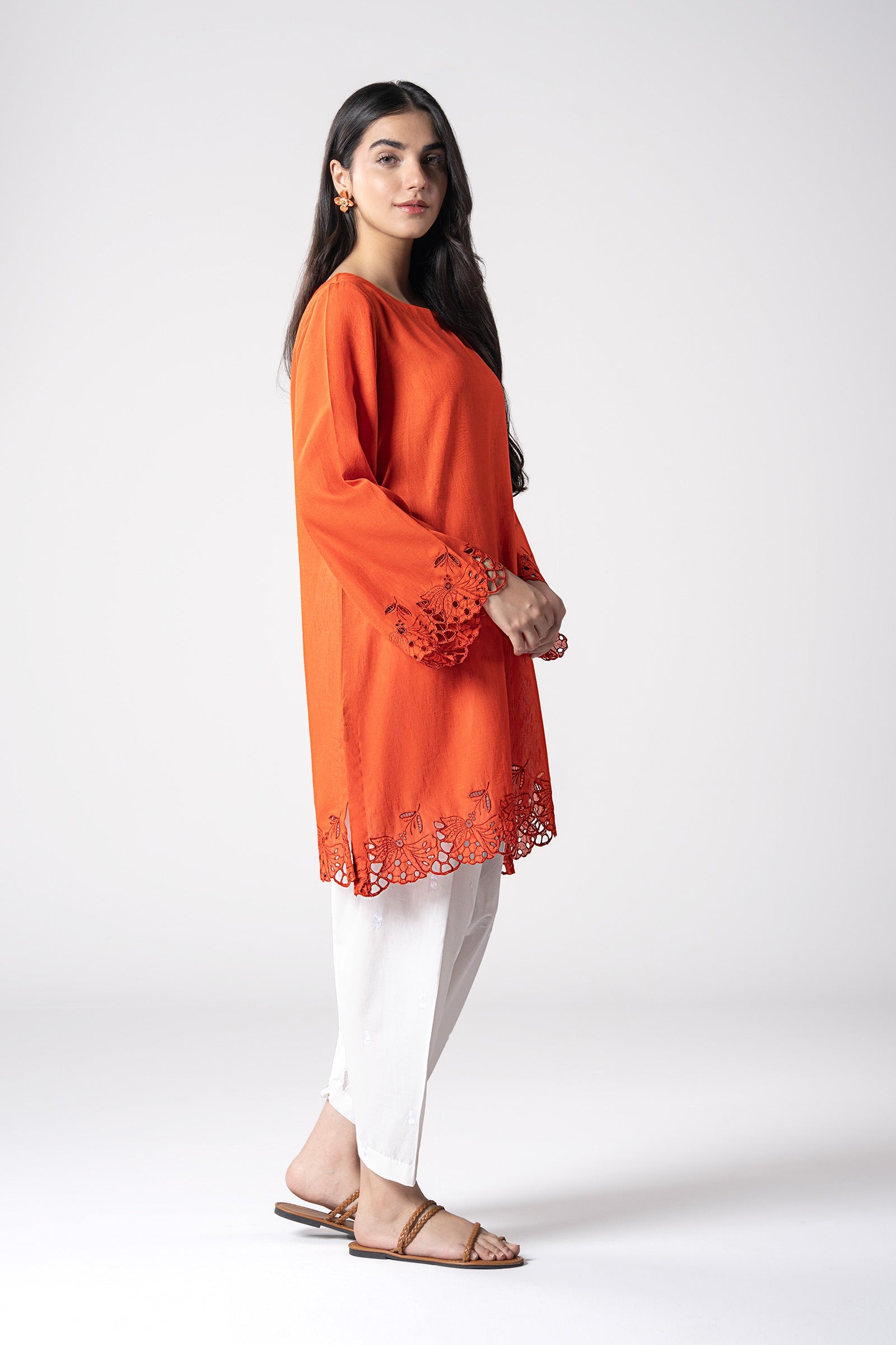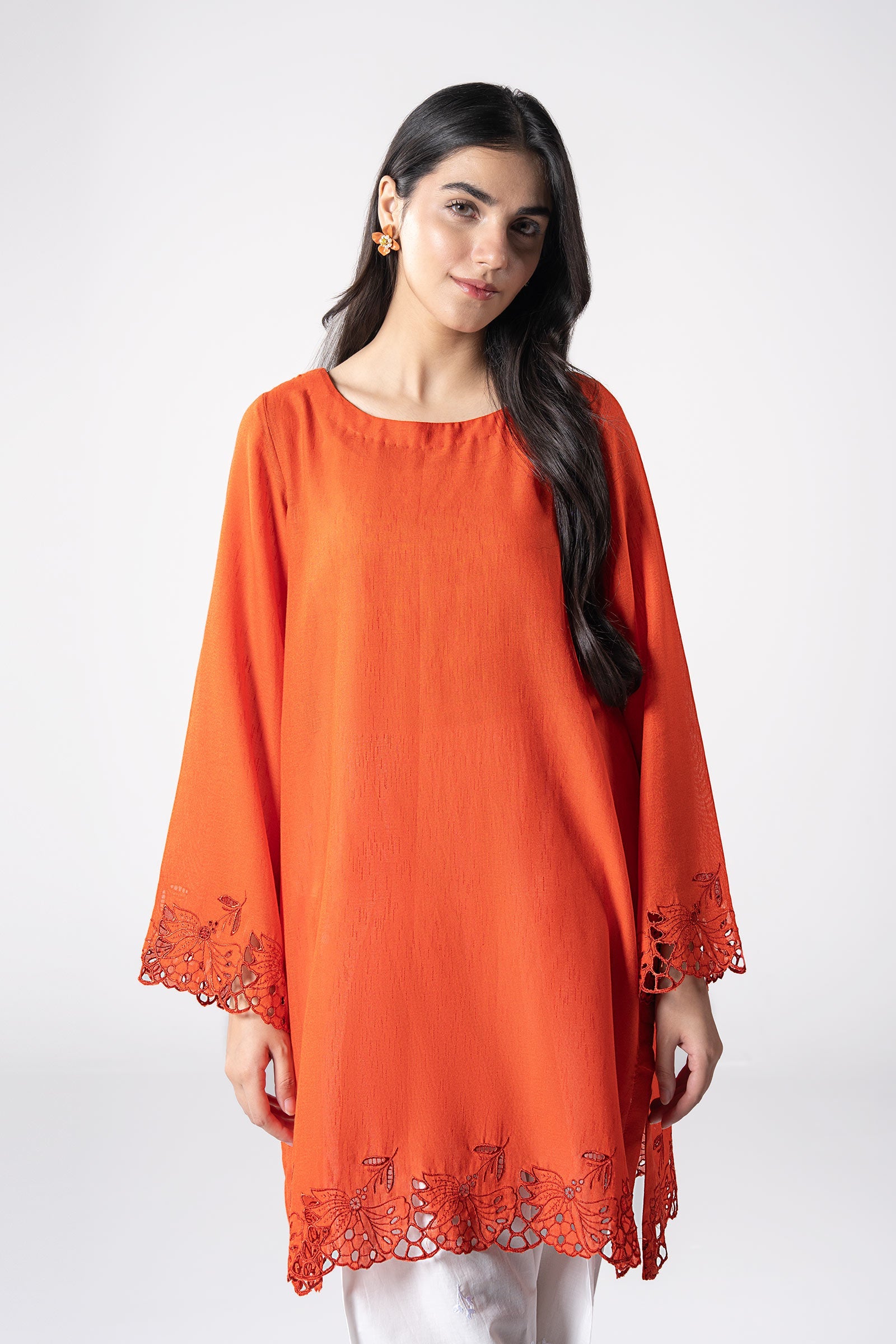 1 Piece - Shirt Dyed Short Shirt Boat Neckline Embroidered Scalloped Border Full Sleeves With Embroidered Border Color: Orange Fabric: Karandi Fit: Regular Model is wearing size xs Note: Dry Clean Only