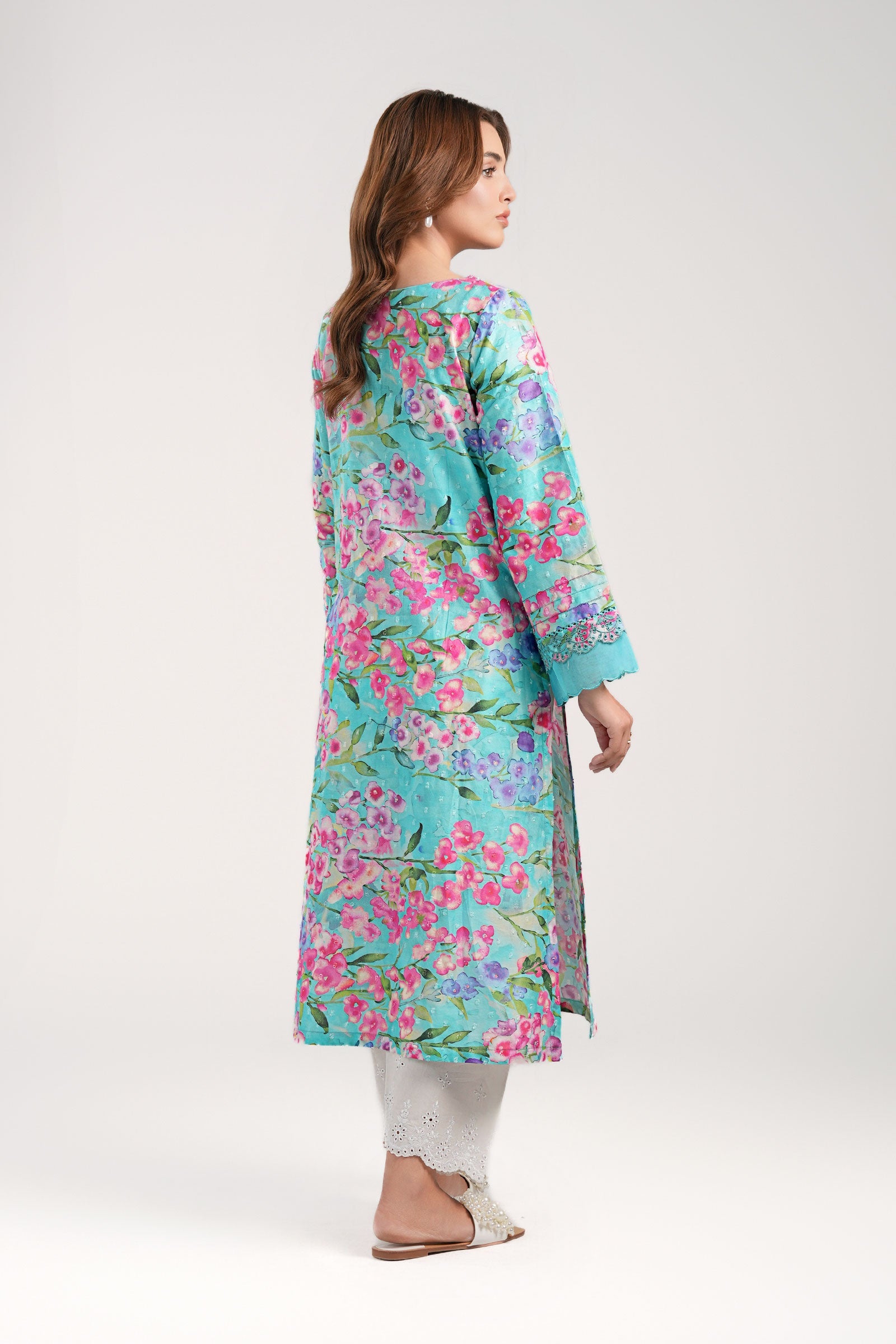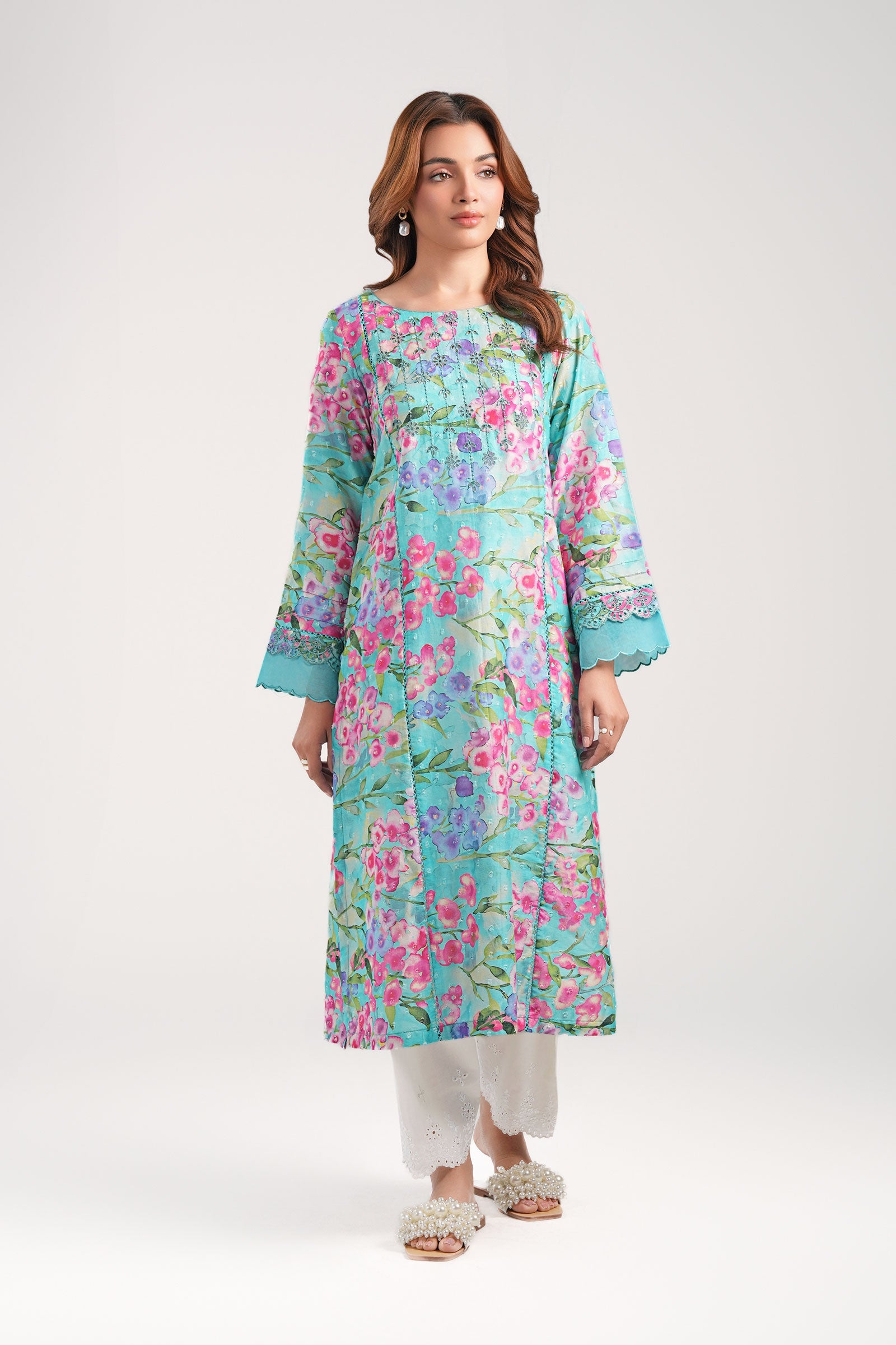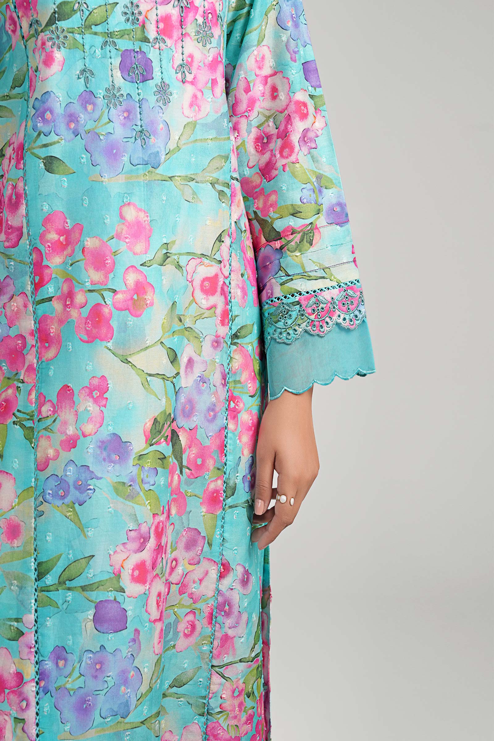 1 Piece - Shirt Printed Mid-Length Straight Cut Shirt Round Embroidered Neckline Full Sleeves With Embroidered Border Scalloped Organza & Lace Detailing On Sleeves Color: Ferozi Fabric: Brochia Fit: Regular Model is wearing size xs Note: Dry Clean Only
