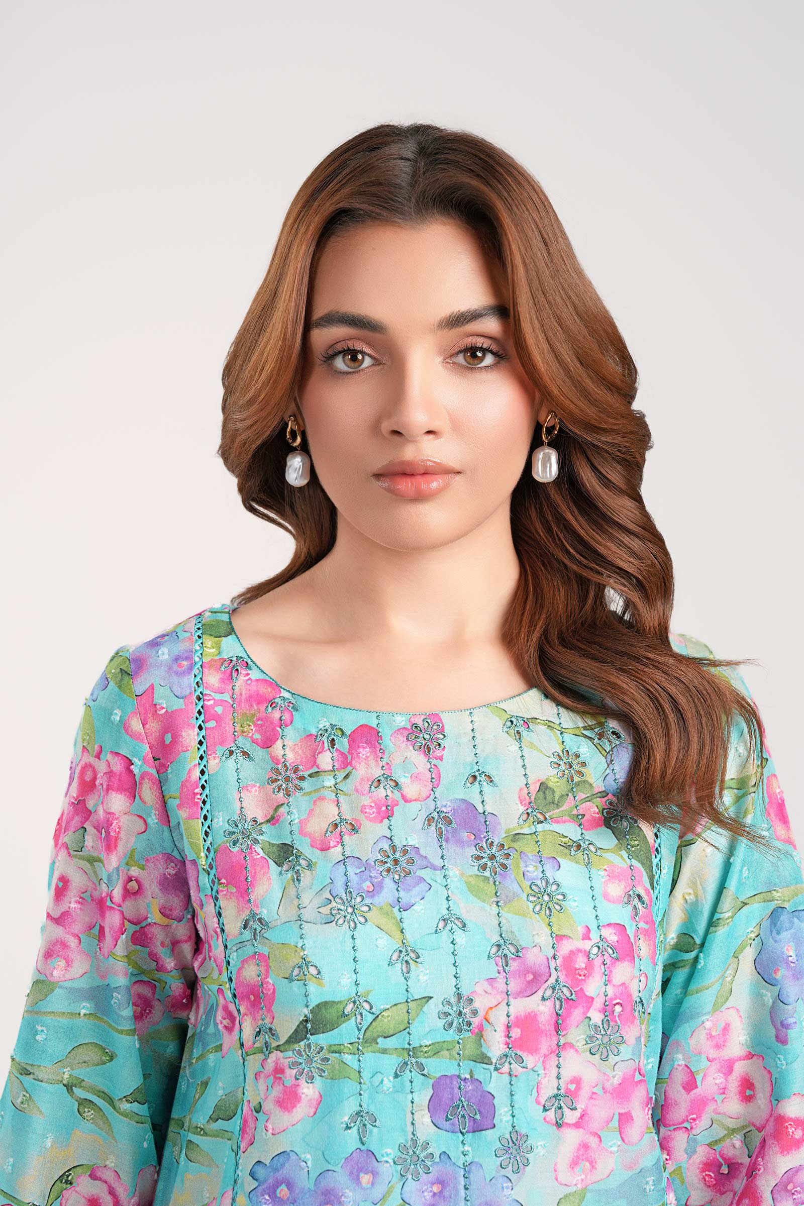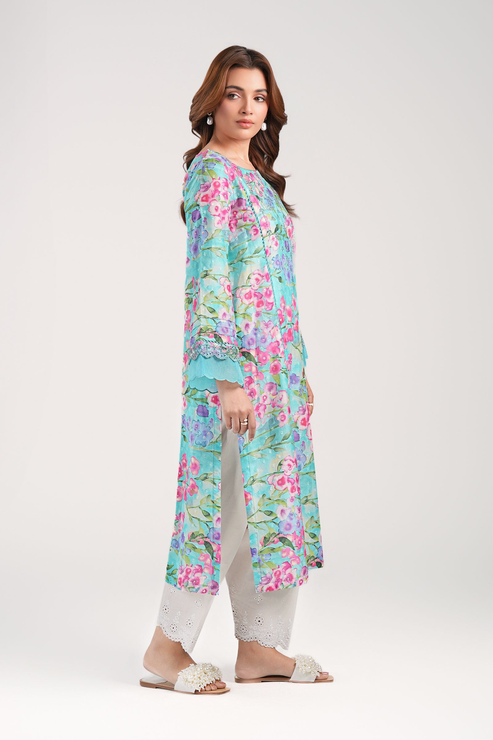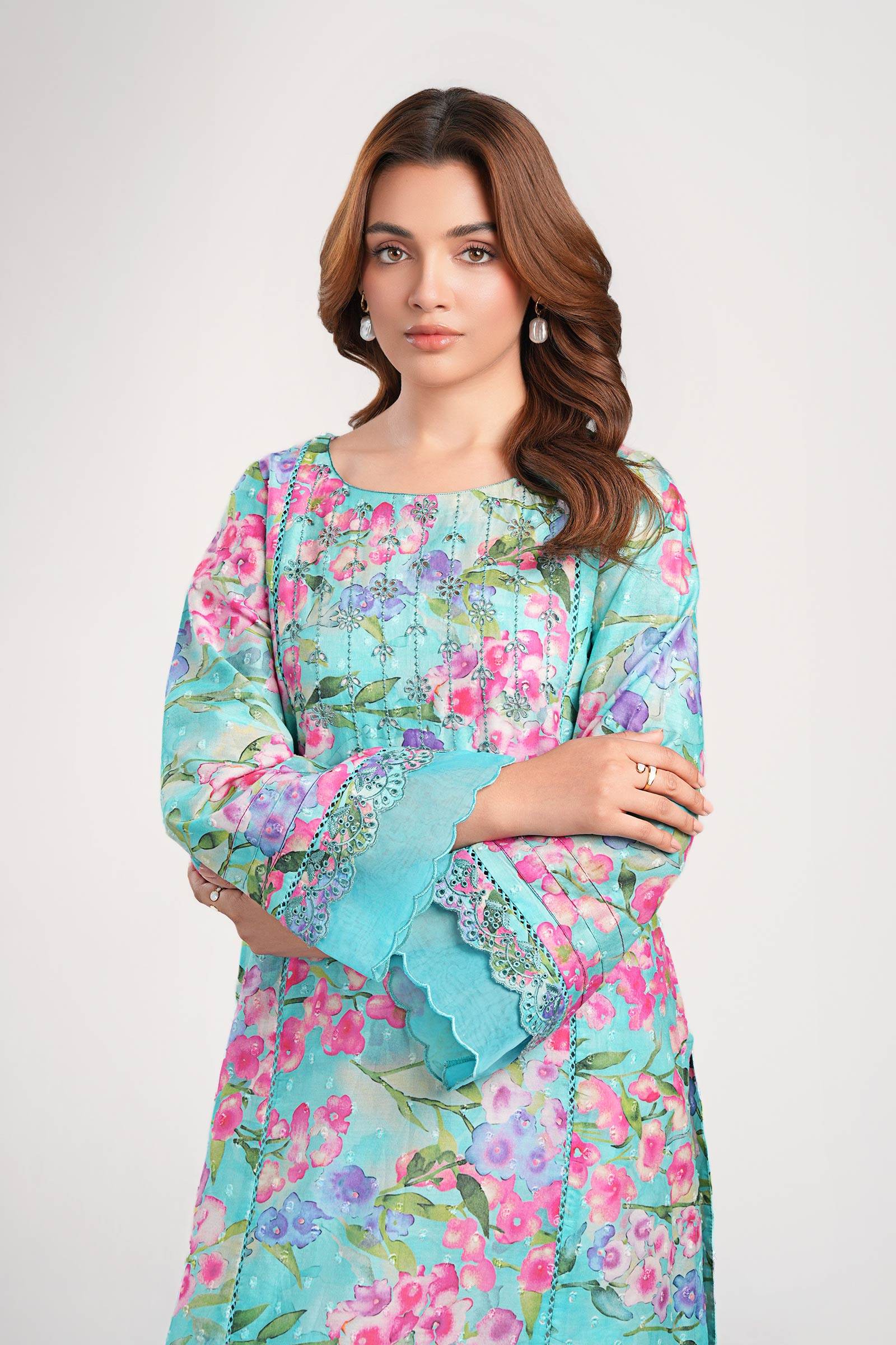 1 Piece - Shirt Printed Mid-Length Straight Cut Shirt Round Embroidered Neckline Full Sleeves With Embroidered Border Scalloped Organza & Lace Detailing On Sleeves Color: Ferozi Fabric: Brochia Fit: Regular Model is wearing size xs Note: Dry Clean Only