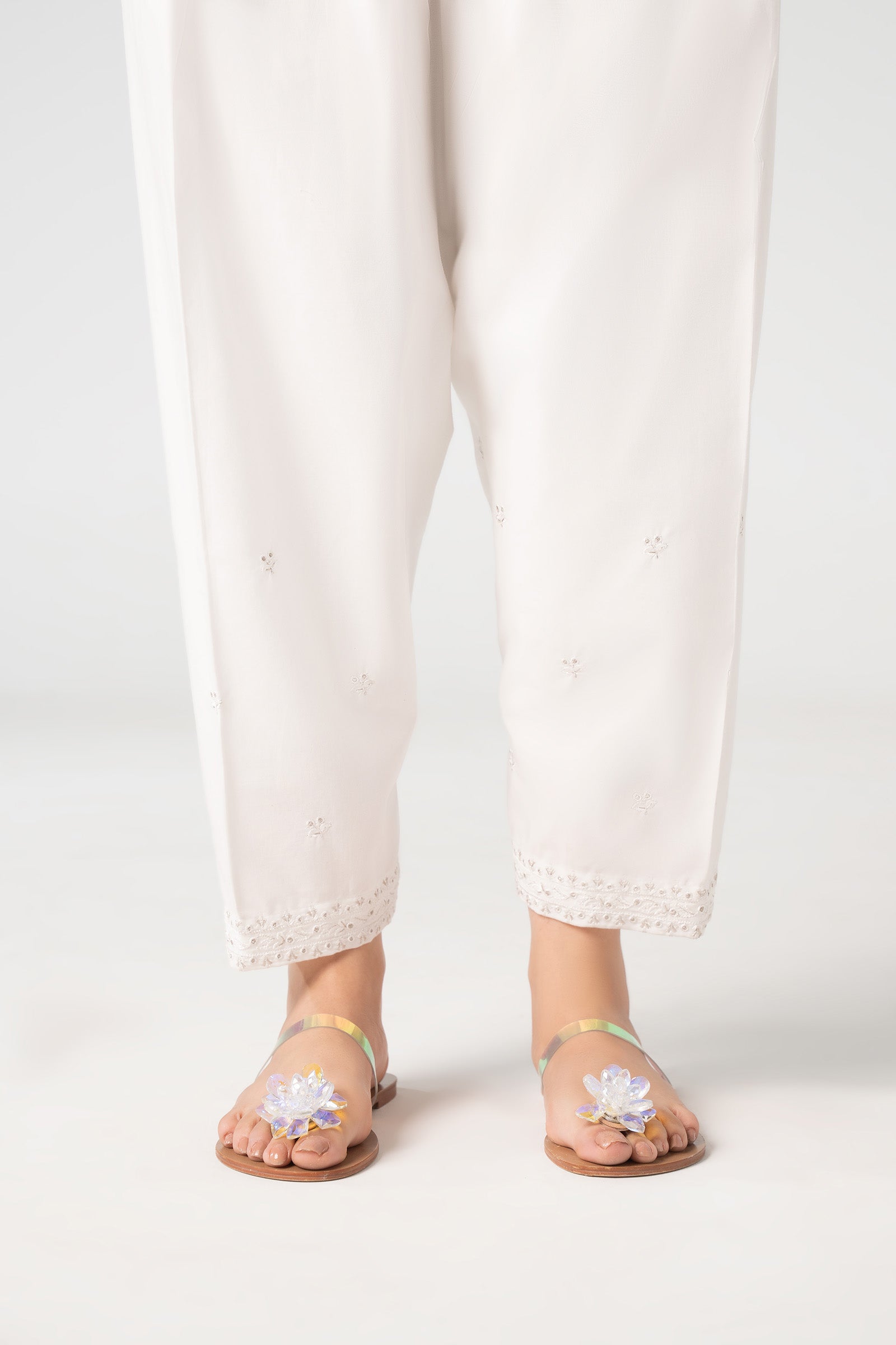 Regular Solid Shalwar Elasticated Waistband Spray Embroidered Hem Color: White Fabric: Cambric Model is wearing xs size Note: Dry Clean Only