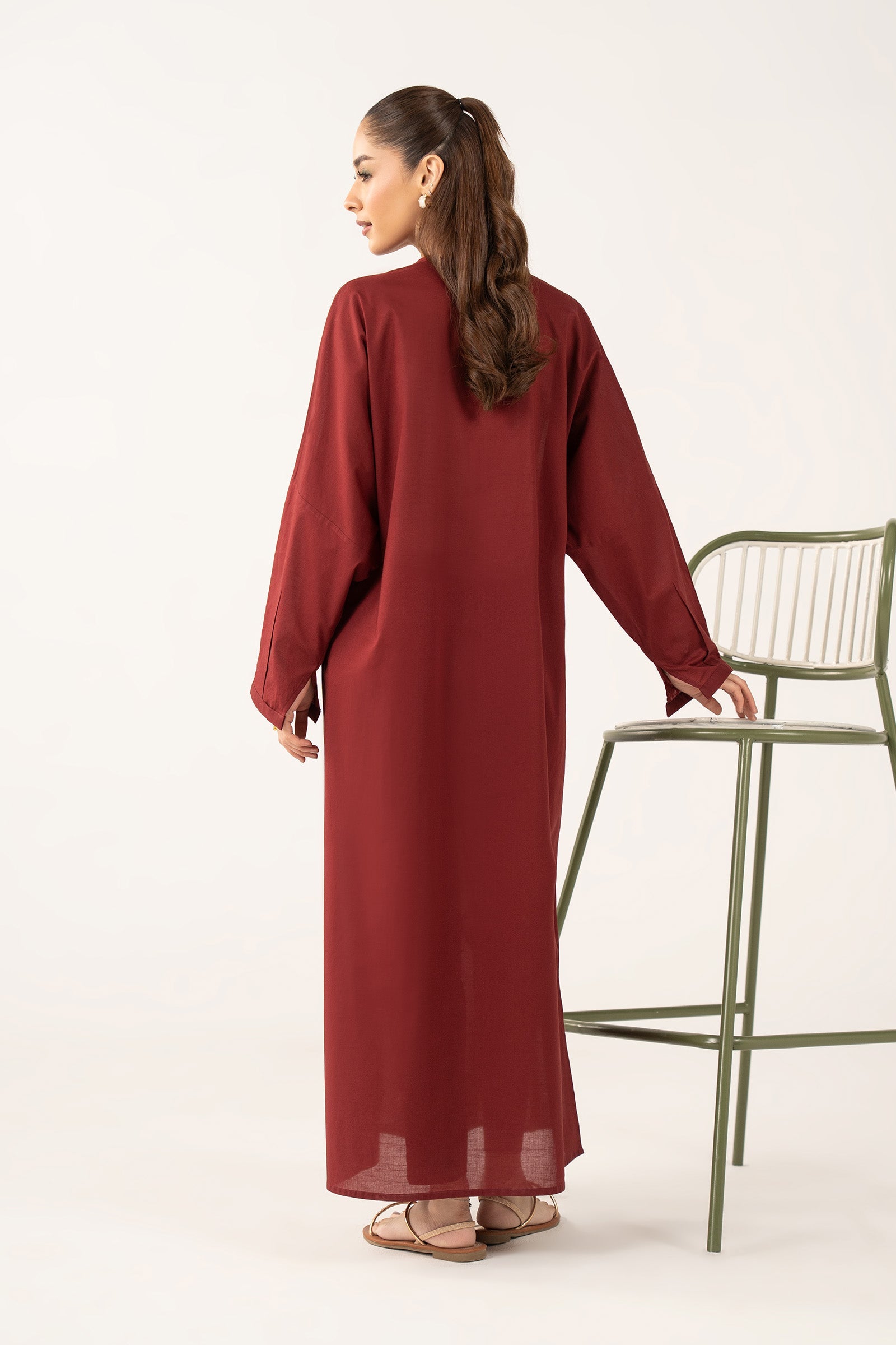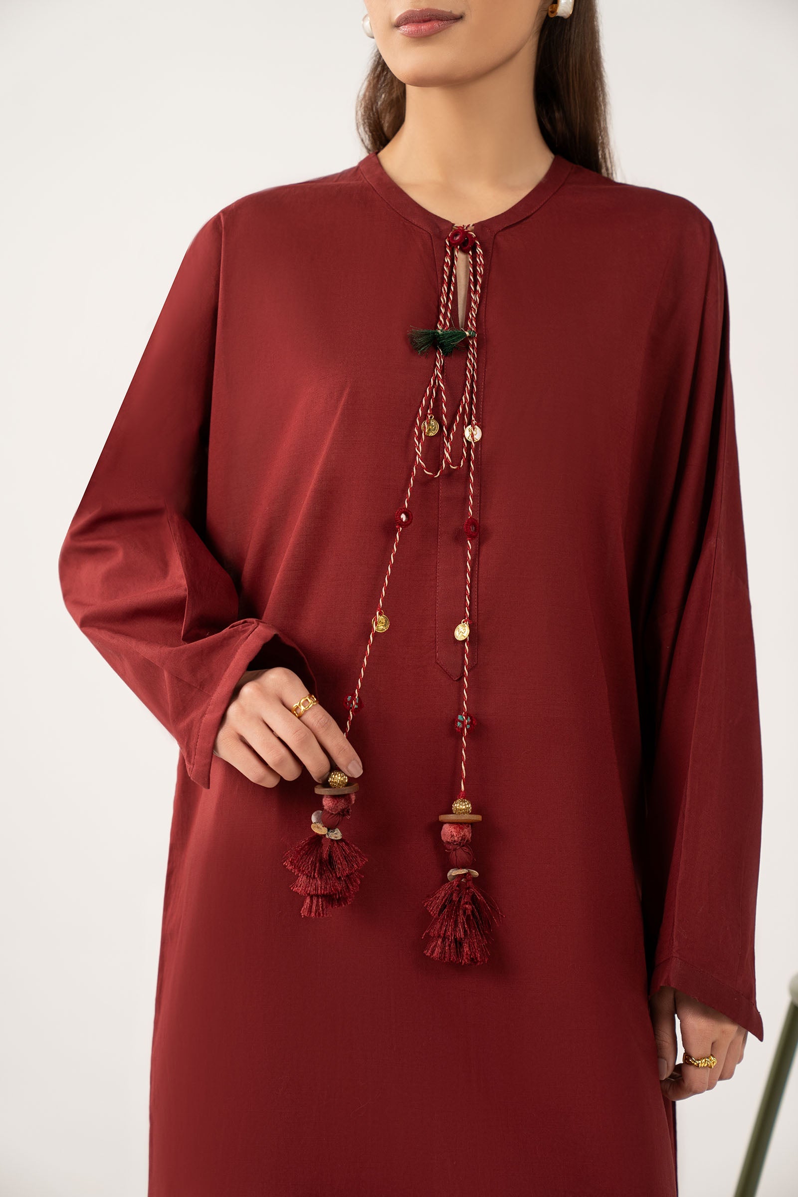 ShirtSolid Straight-Cut ShirtRound Neckline With Placket & Dori AccentsStraight SleevesColor: MaroonFabric: Slub LawnTrouserTapered PantsElasticated WaistbandColor: MaroonFabric: Slub LawnModel is wearing xs sizeNote: Dry Clean Only