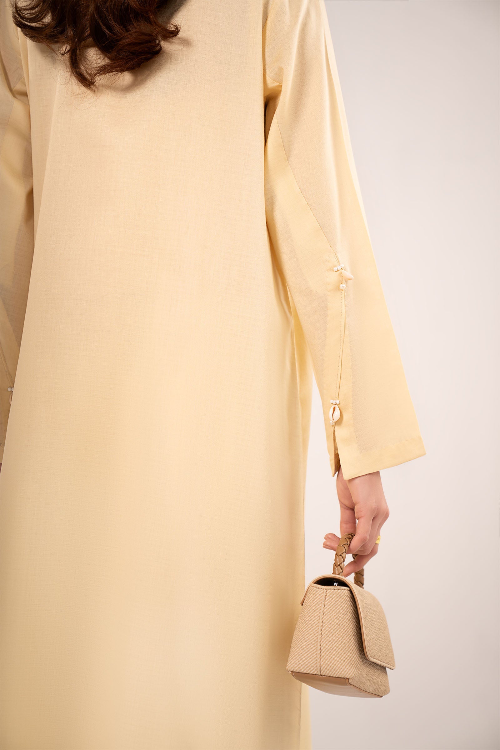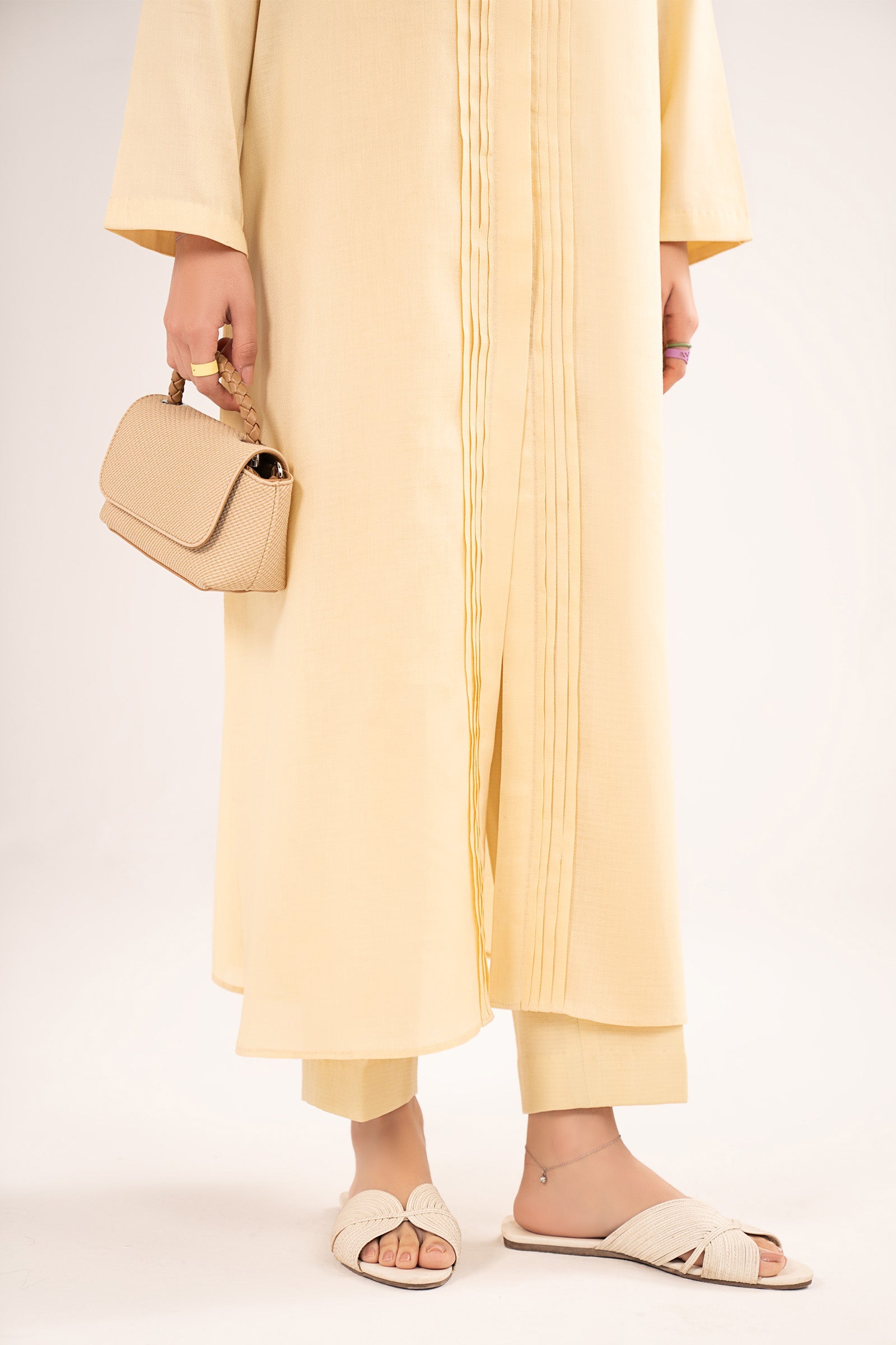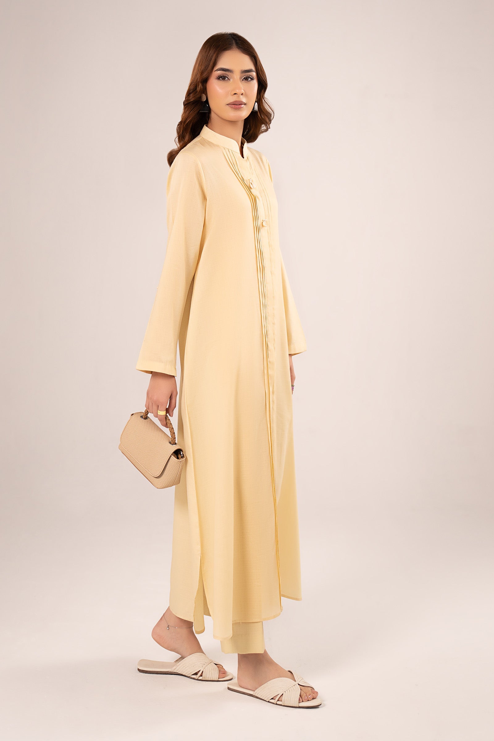 1 Piece - Shirt Straight Shirt Band Collar Neckline With Buttons & Pleated Placket Straight Sleeves Color: Lime Yellow Fabric: Dobby Cotton Model is wearing xs size Note: Dry Clean Only