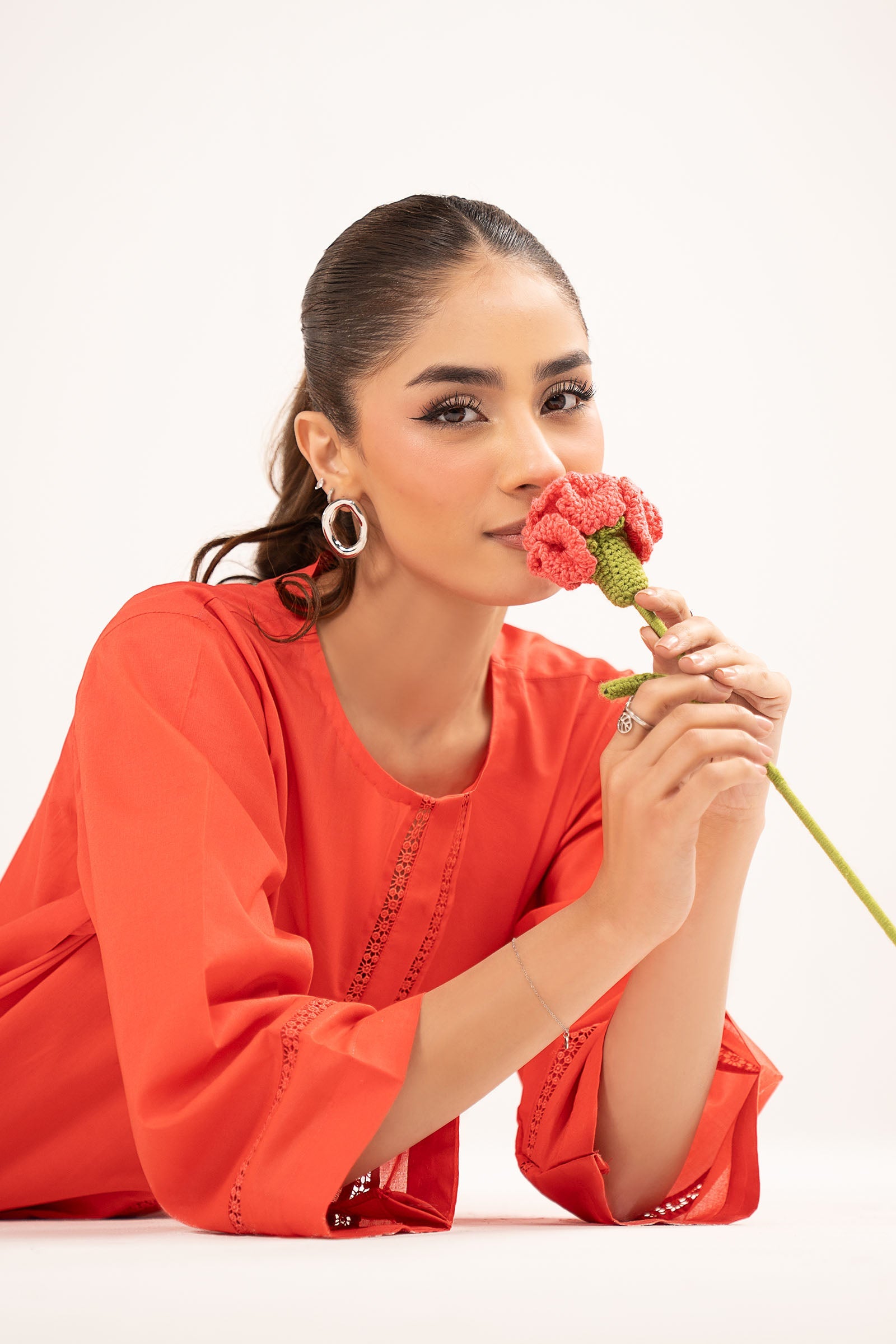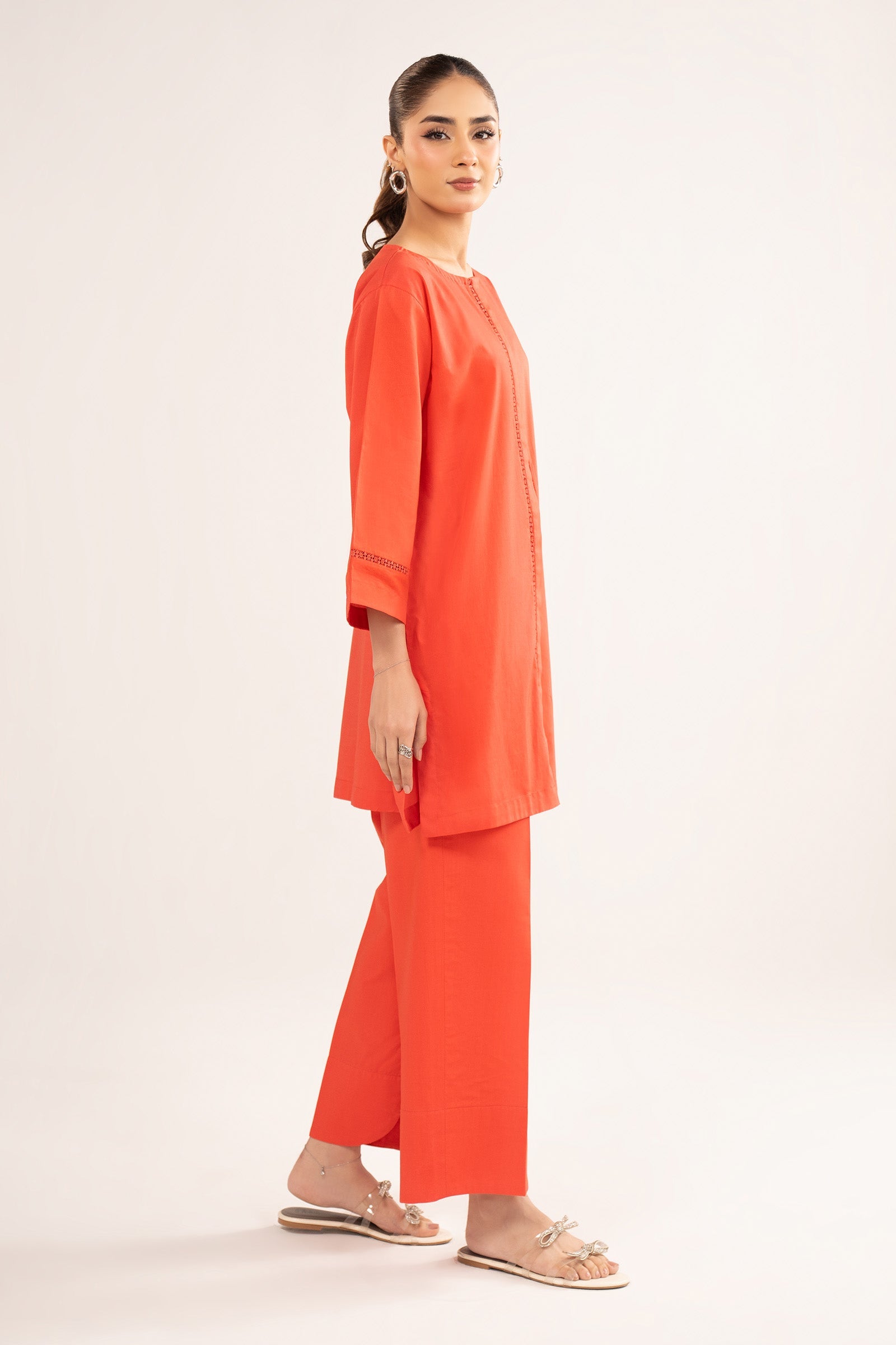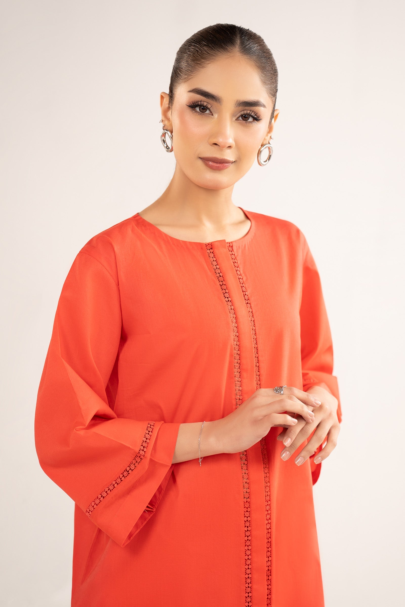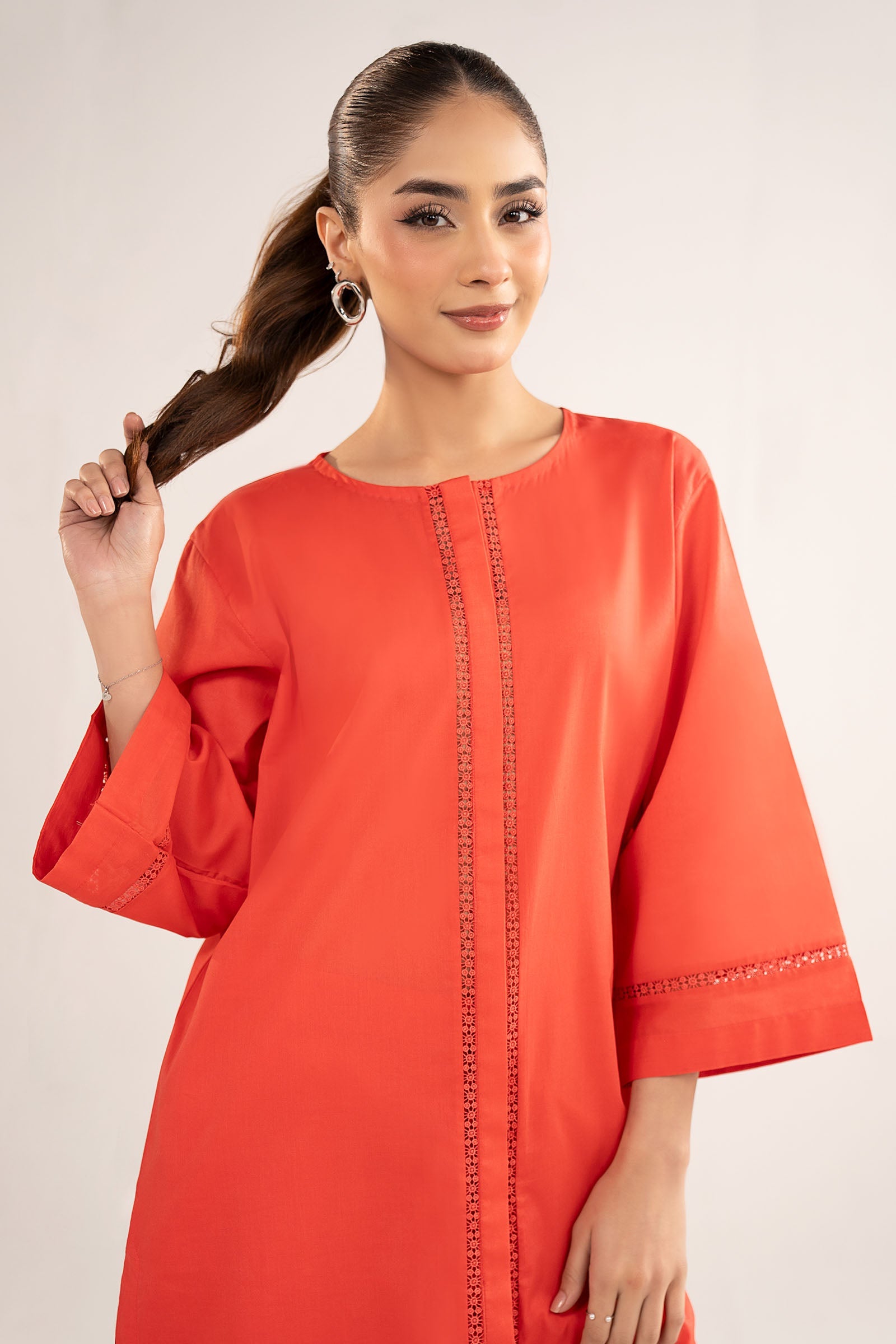 2 Piece - Shirt & TrouserShirtStraight ShirtScoop Neckline With Laced PlacketStraight Sleeves With Lace DetailingColor: CoralFabric: LawnTrouserCulotte TrouserElasticated WaistbandColor: CoralFabric: CambricModel is wearing xs sizeNote: Dry Clean Only
