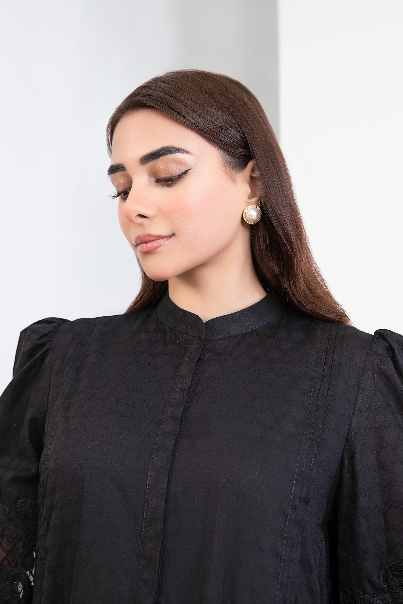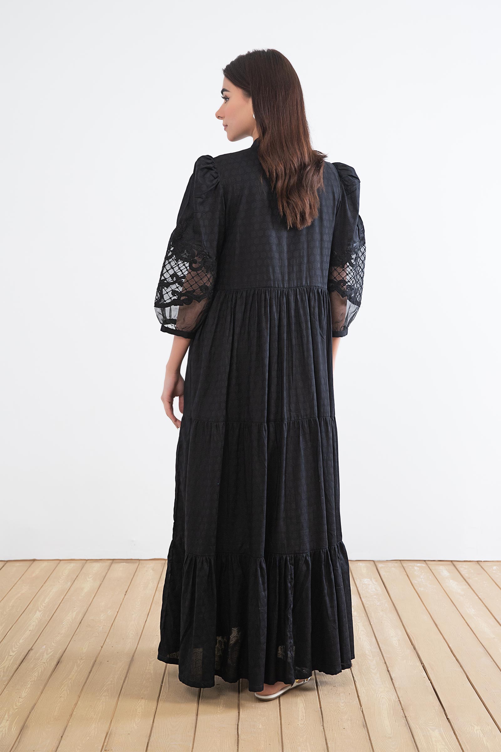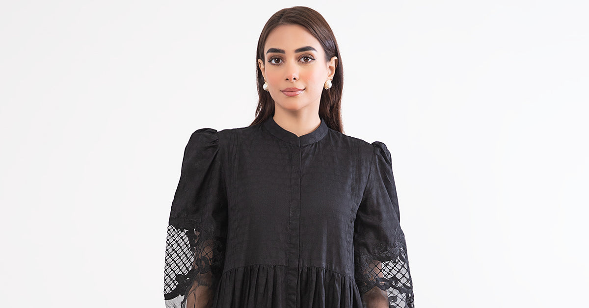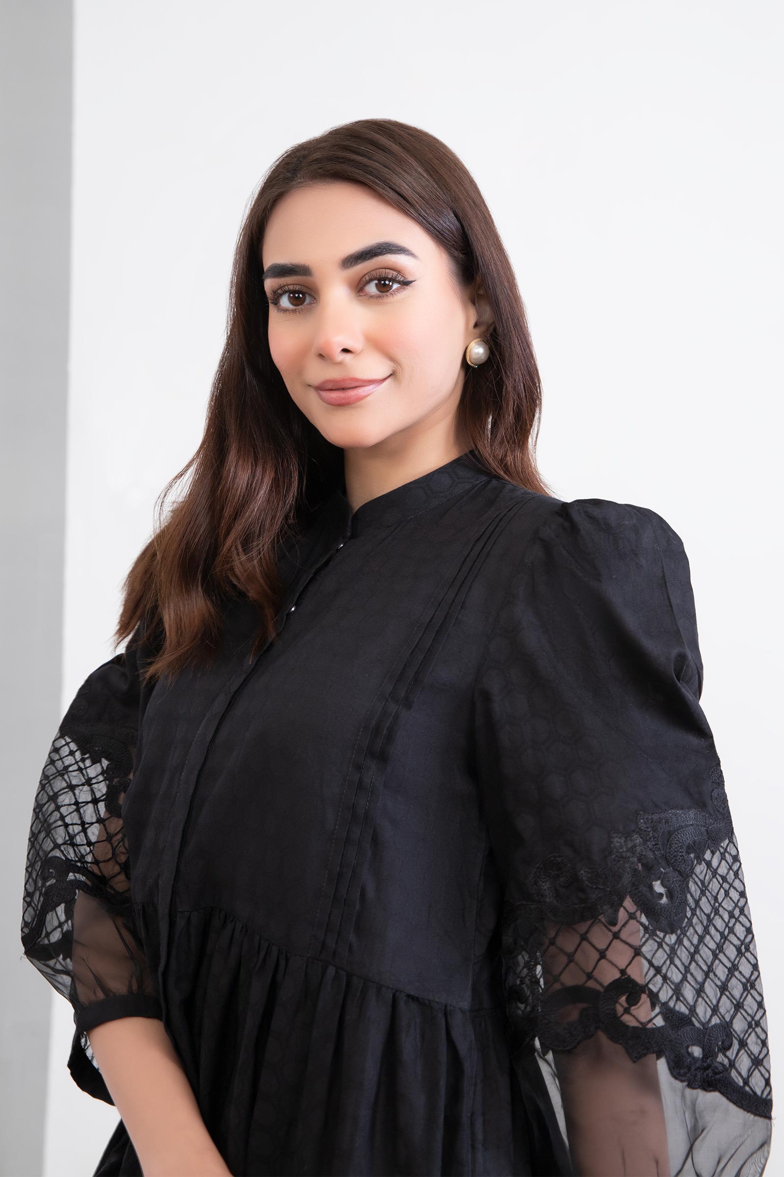 Elevate your style with our black-hued delicately pleated dyed lawn dress, featuring a band collar neckline and balloon sleeves heightened with floral embroidery and organza lace detailing.