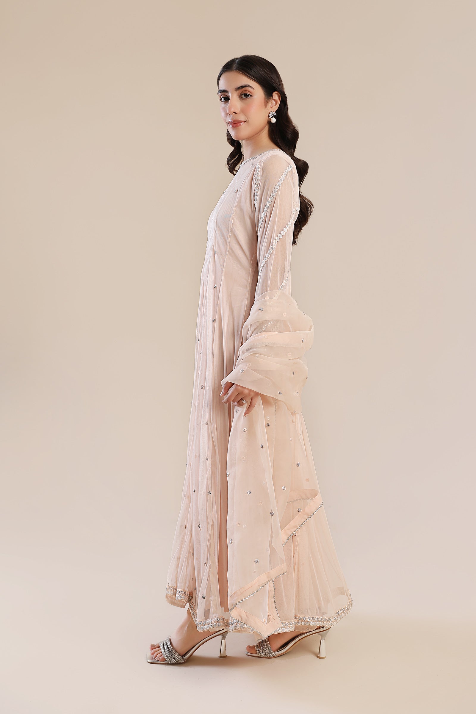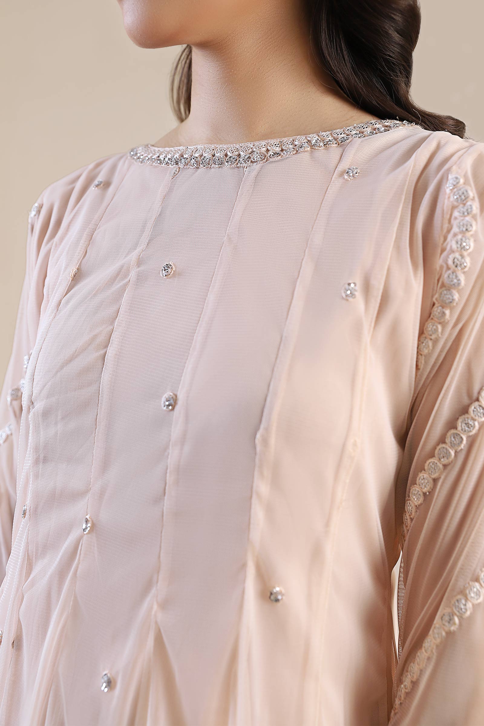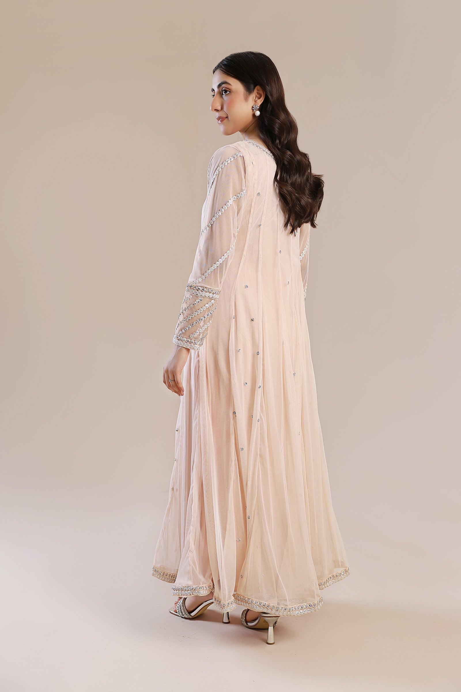 Frock Kalidar Spray Embroidered Frock Sequins Embroidered Boat Neckline Spray Embroidered Front With Panni Work Full Straight Sleeves With Embroided Panni Spray & Lace Detailing Fit: Regular Color: Peach Fabric: Poly Net Trousers Dyed Straight Fit Trousers Elasticated Waistband Fit: Relaxed Color: Peach Fabric: PK Raw Silk Dupatta Spray Dupatta Lace Detailing All Over The Borders Color: Peach Fabric: Poly Organza Model is wearing size XS Note: Dry Clean Only