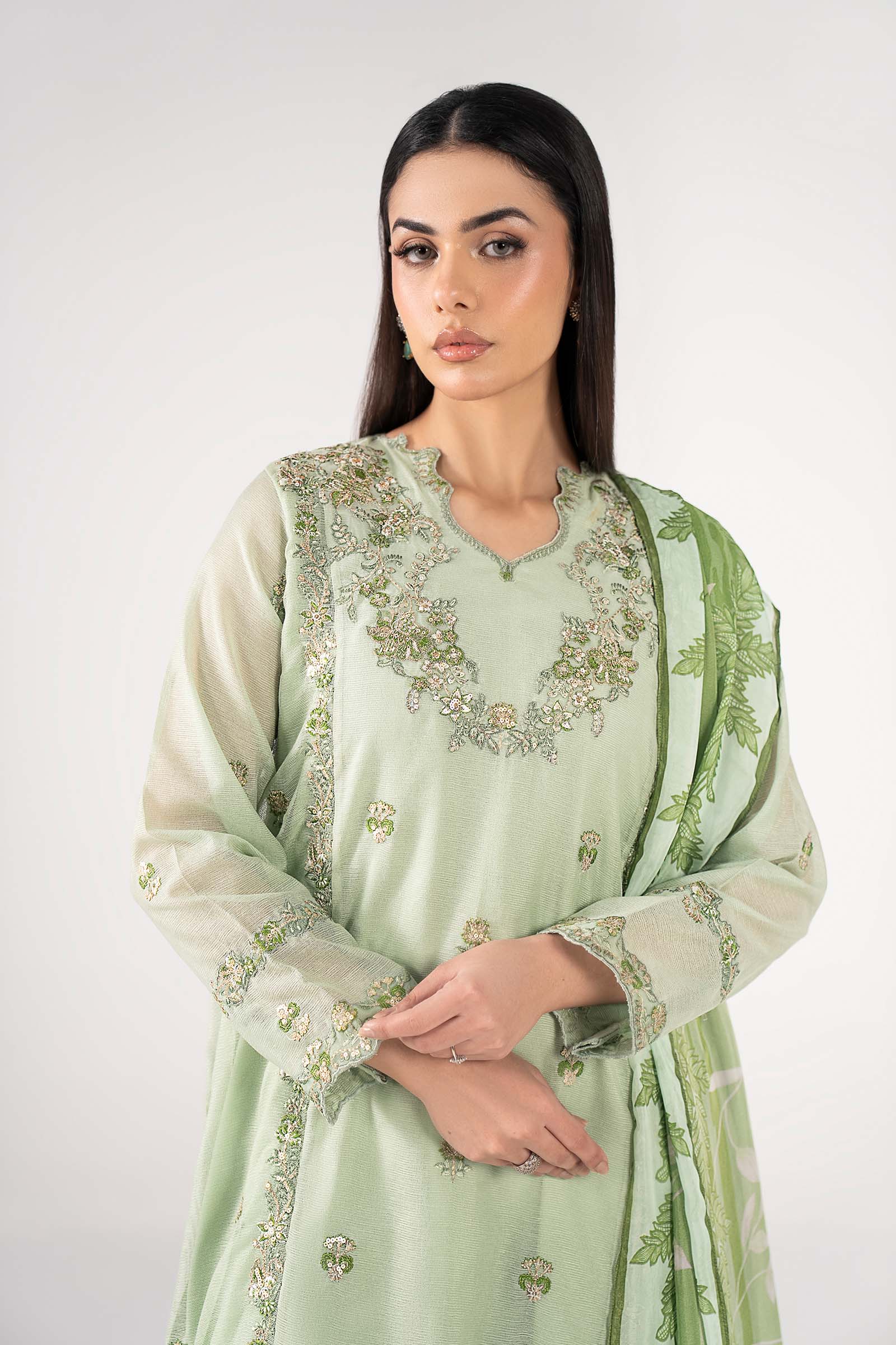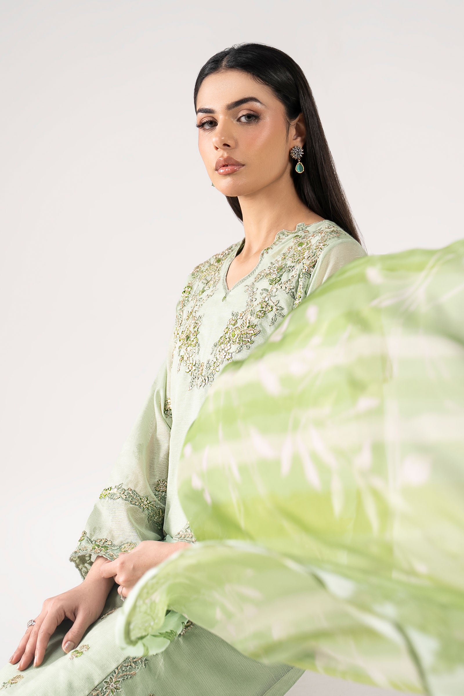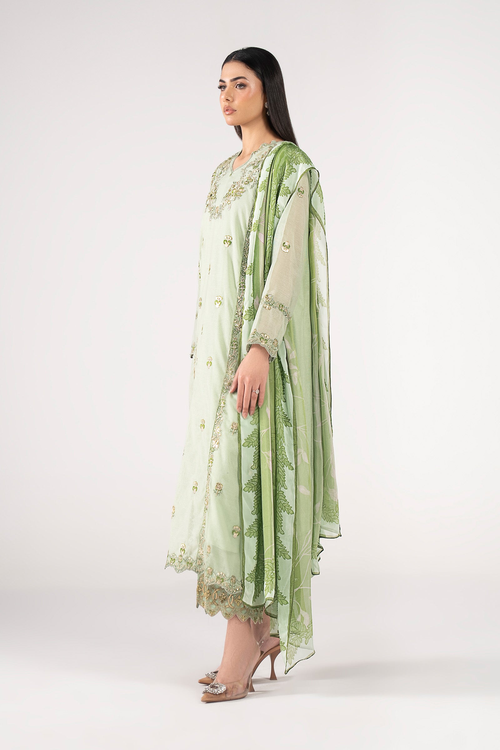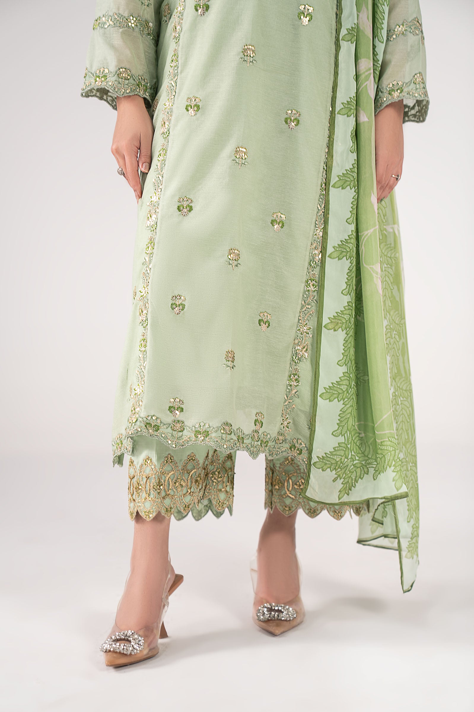 Shirt Embroidered Neckline Spray Embroidered Center Panel Embroidered Side Panels Embroidered Front Border Embroidered Straight Sleeves Color: Sea Green Fabric: Silk Cotton Net Undershirt Dyed SleevelessUndershirt Color: Sea Green Fabric: Viscose Raw Silk Trouser Dyed Straight-Leg Trouser Elasticated Waistband Embroidered Hem Color: Sea Green Fabric: Viscose Raw Silk Dupatta Digital Printed Dupatta Color: Sea Green Fabric: Medium Silk Model is wearing xs size Note: Dry Clean Only