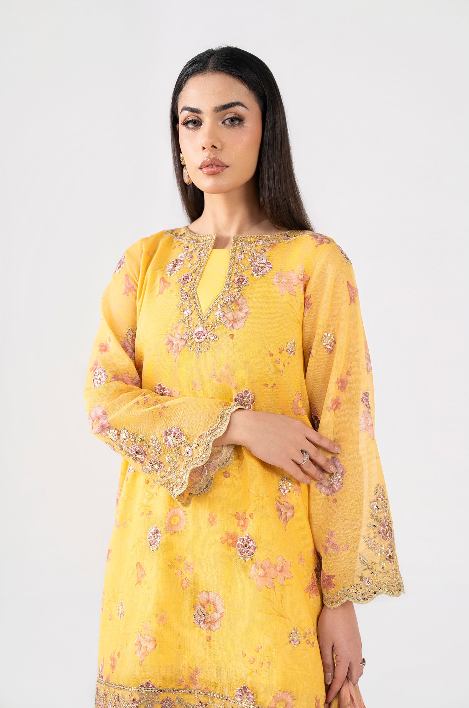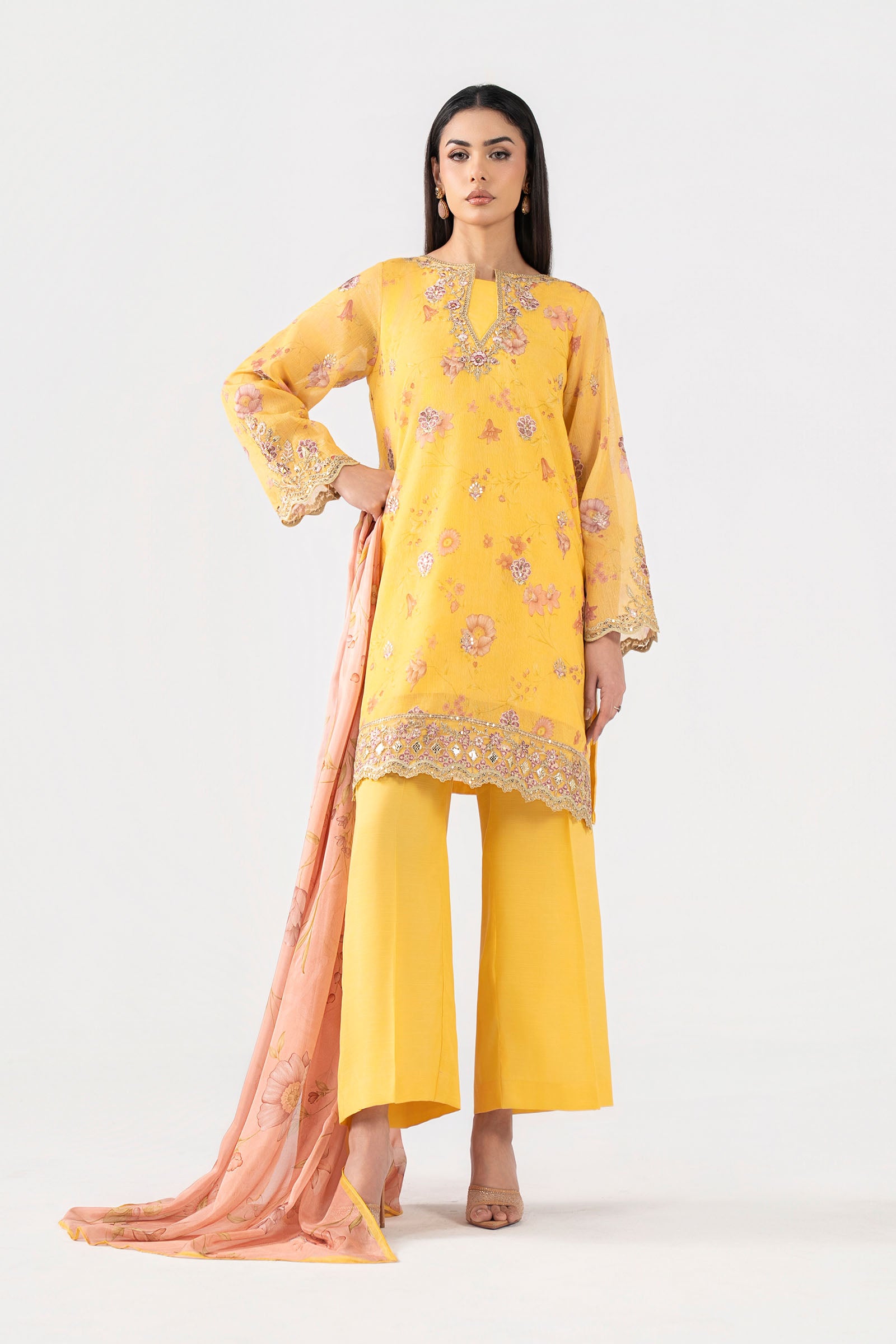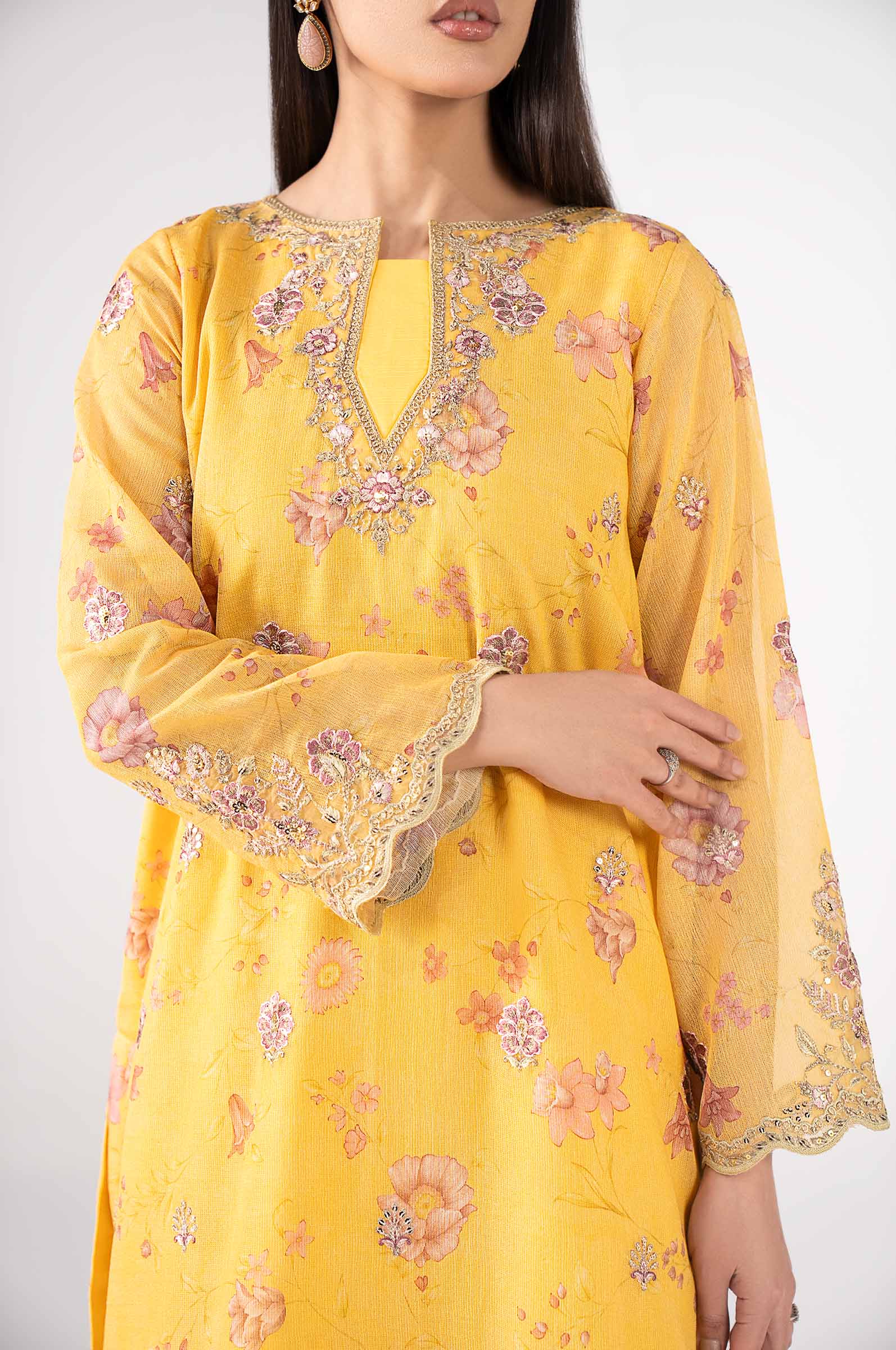 Shirt Digital Printed Shirt With Spray Embroidery Embroidered Neckline Embroidered Side Seams Embroidered Scalloped Border Digital Printed Sleeves With Embroidered Spray, Motif & Border Color: Yellow Fabric: Silk Cotton Net Undershirt Dyed Sleeveless Undershirt Color: Yellow Fabric: Viscose Raw Silk Trouser Dyed Wide-Leg Trouser Elasticated Waistband Color: Yellow Fabric: Viscose Raw Silk Dupatta Digital Printed Dupatta Color: Multi Fabric: Medium Silk Model is wearing xs size Note: Dry Clean Only