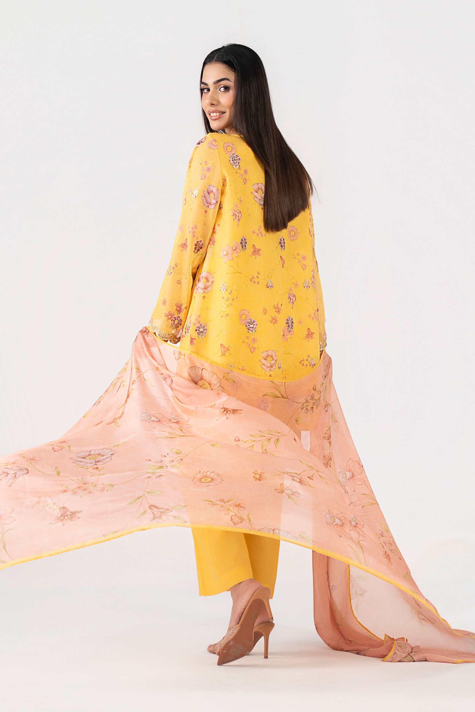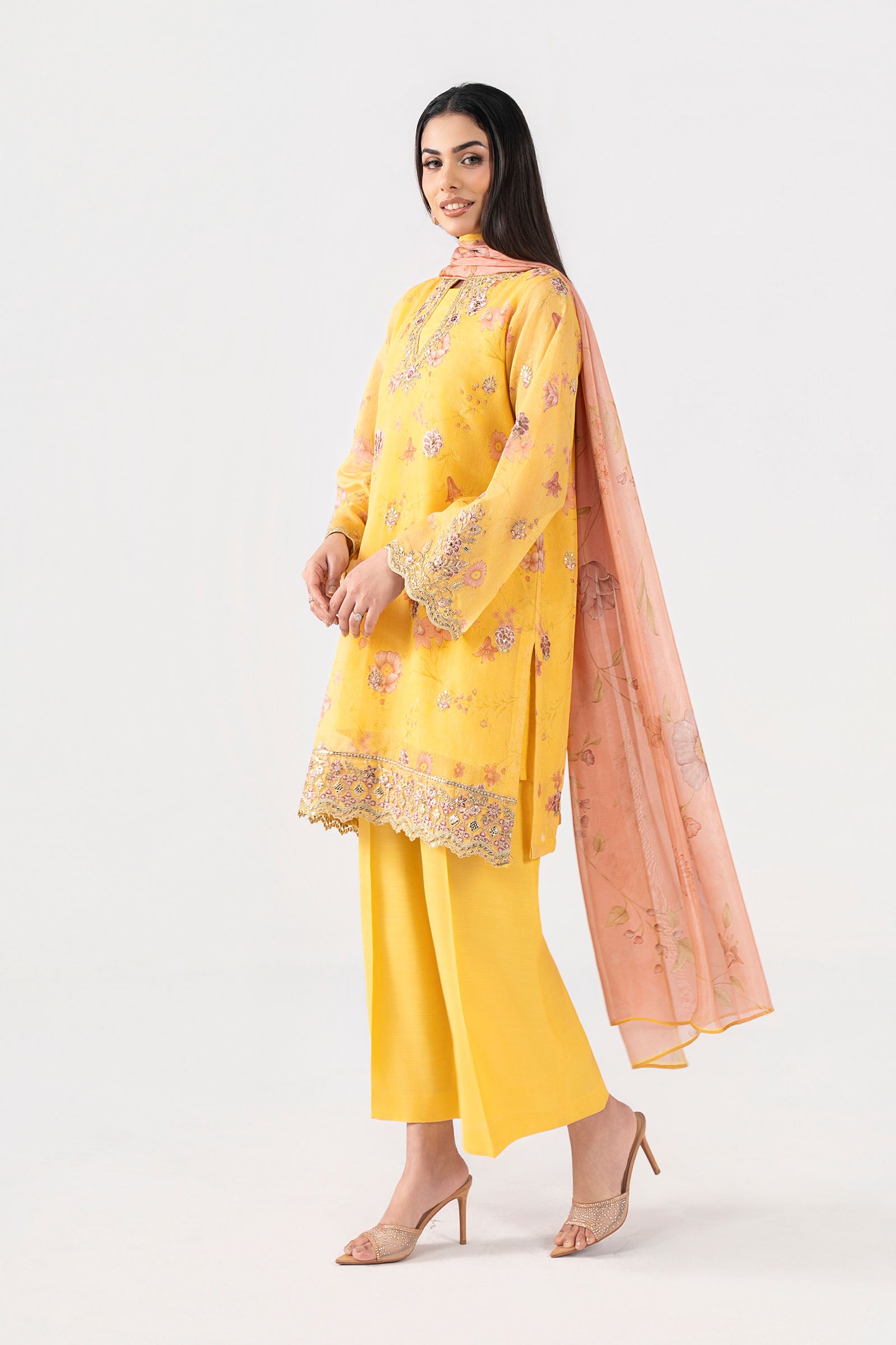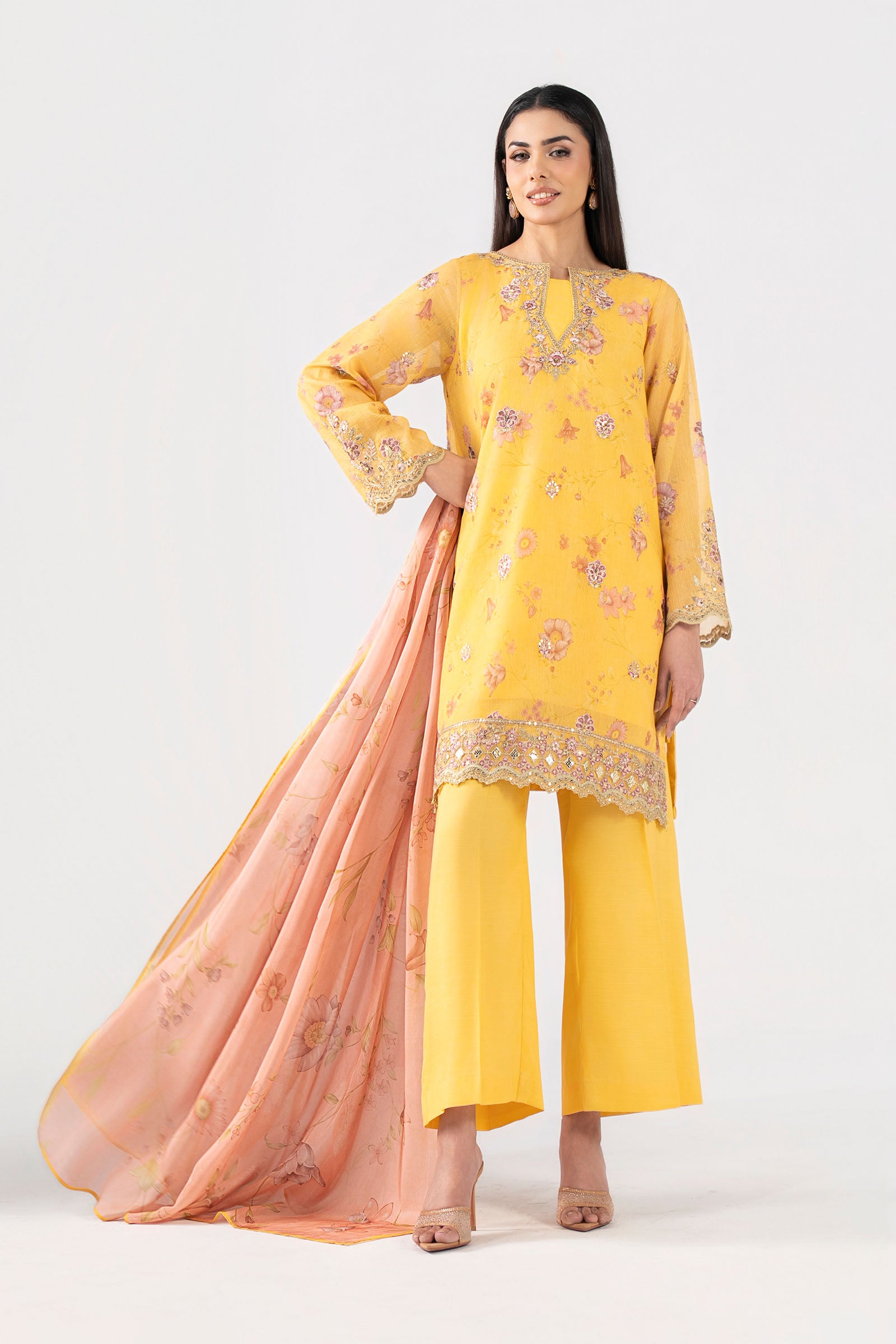 Shirt Digital Printed Shirt With Spray Embroidery Embroidered Neckline Embroidered Side Seams Embroidered Scalloped Border Digital Printed Sleeves With Embroidered Spray, Motif & Border Color: Yellow Fabric: Silk Cotton Net Undershirt Dyed Sleeveless Undershirt Color: Yellow Fabric: Viscose Raw Silk Trouser Dyed Wide-Leg Trouser Elasticated Waistband Color: Yellow Fabric: Viscose Raw Silk Dupatta Digital Printed Dupatta Color: Multi Fabric: Medium Silk Model is wearing xs size Note: Dry Clean Only