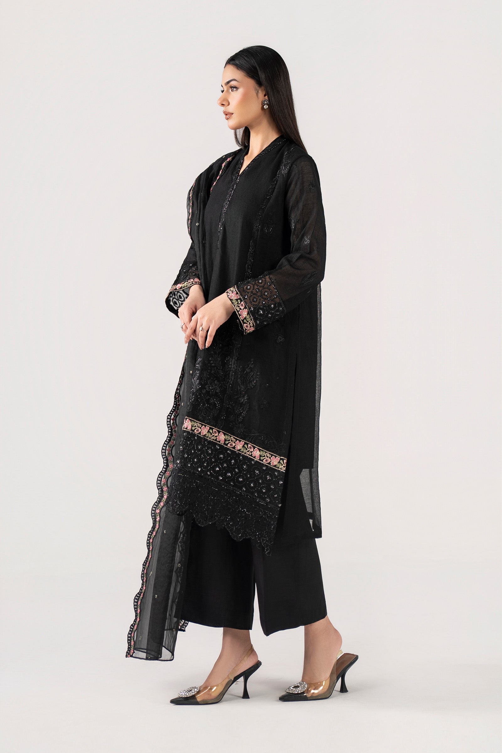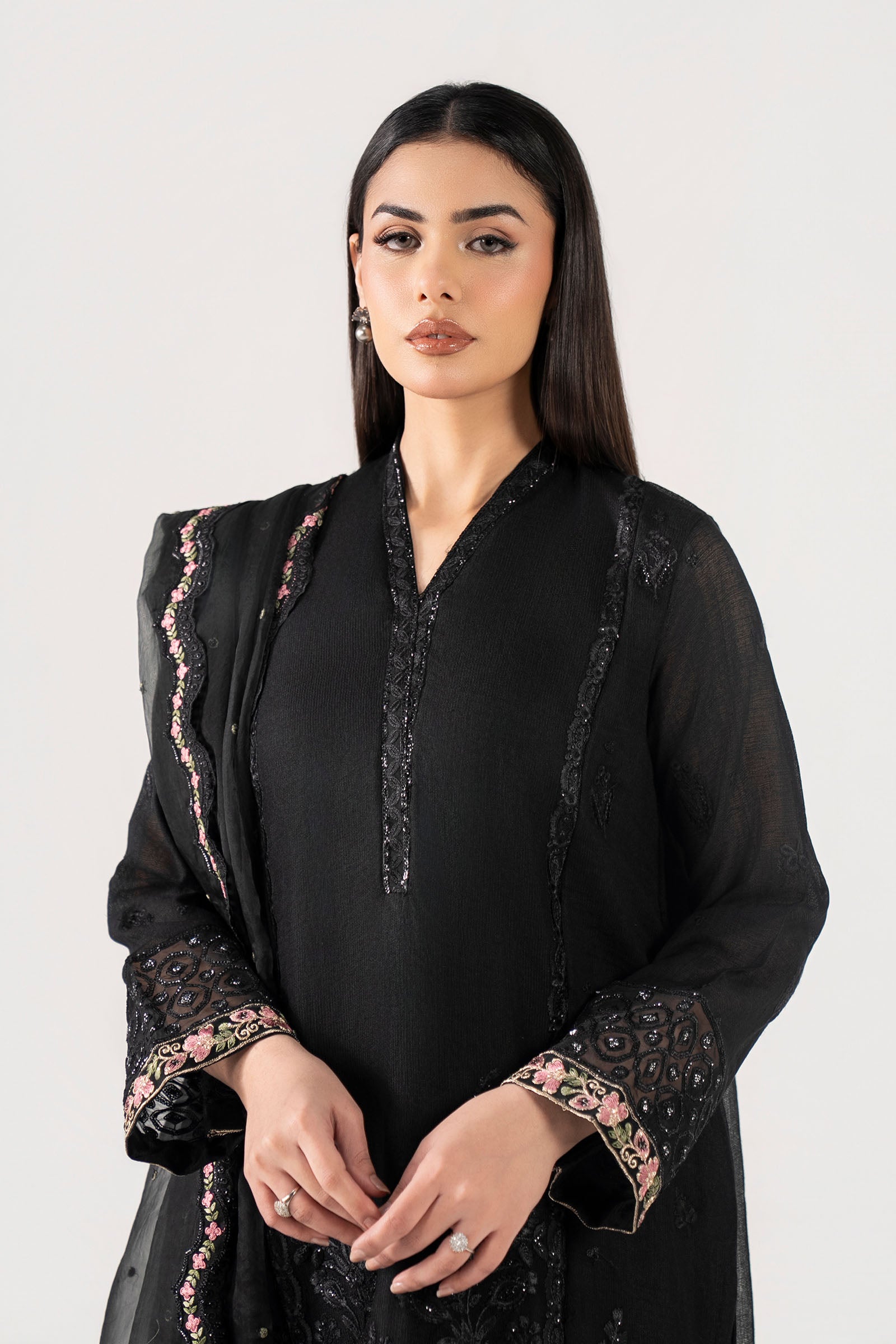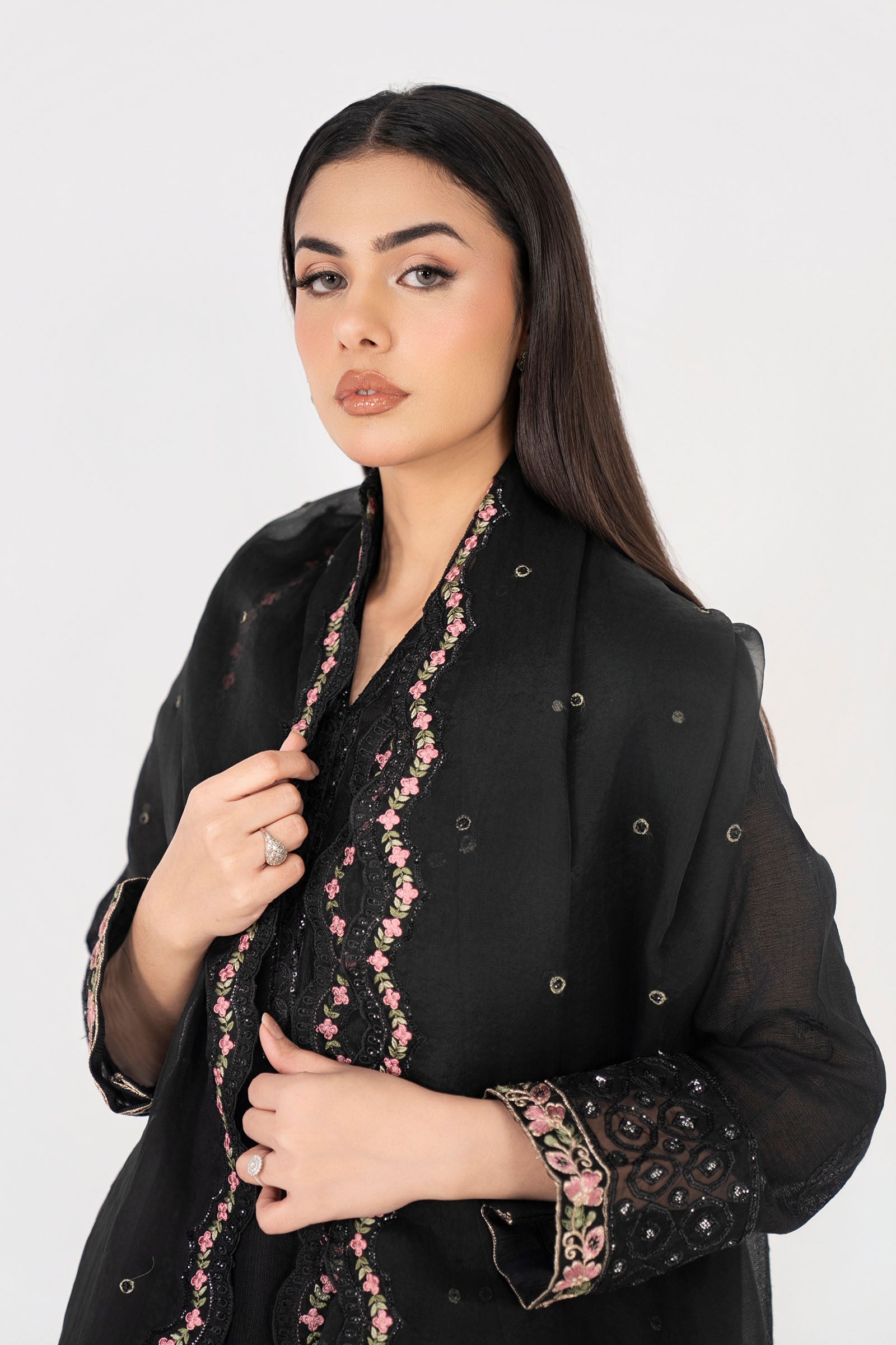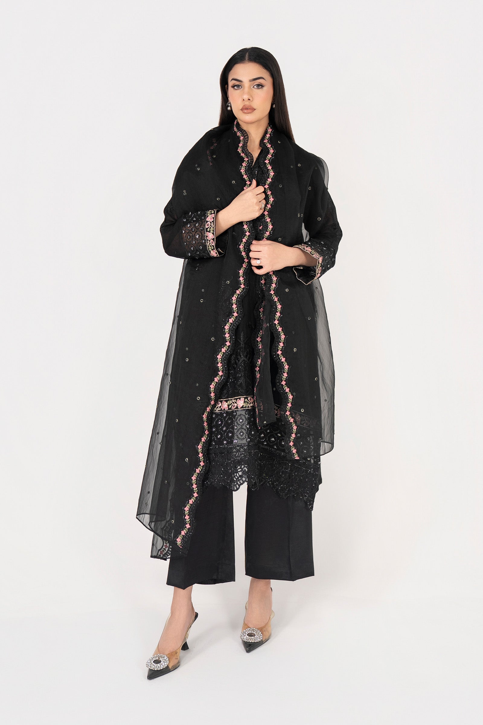 ShirtEmbroidered ShirtEmbroidered Overlap NecklineEmbroidered Scalloped BorderSpray Embroidered Sleeves With Embroidered BorderColor: BlackFabric: Silk Cotton NetUndershirtDyed Sleeveless Undershirt 2.5 MetersColor: BlackFabric: Viscose Raw SilkTrouserDyed Wide-Leg TrouserElasticated WaistbandColor: BlackFabric: Viscose Raw SilkDupattaSpray Embroidered DupattaTwo-Sided Embroidered Scalloped BorderColor: BlackFabric: OrganzaModel is wearing xs sizeNote: Dry Clean Only