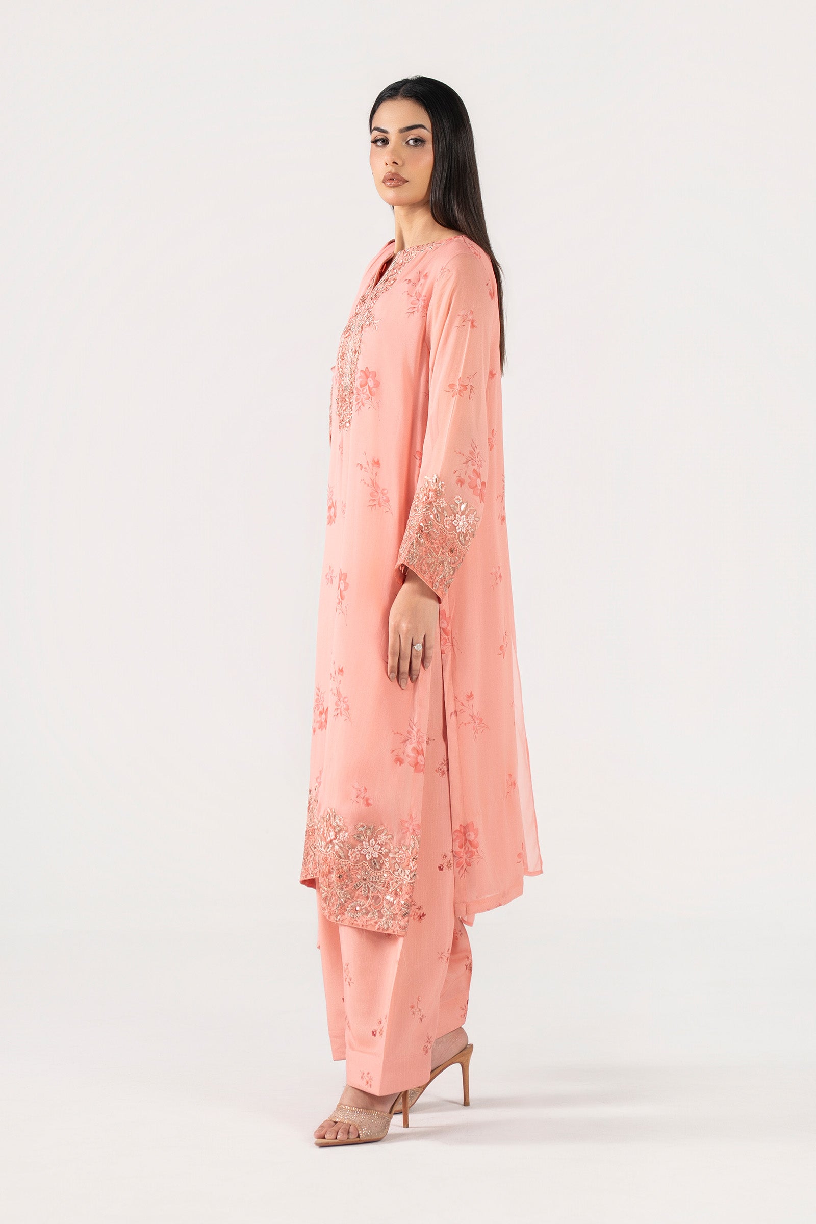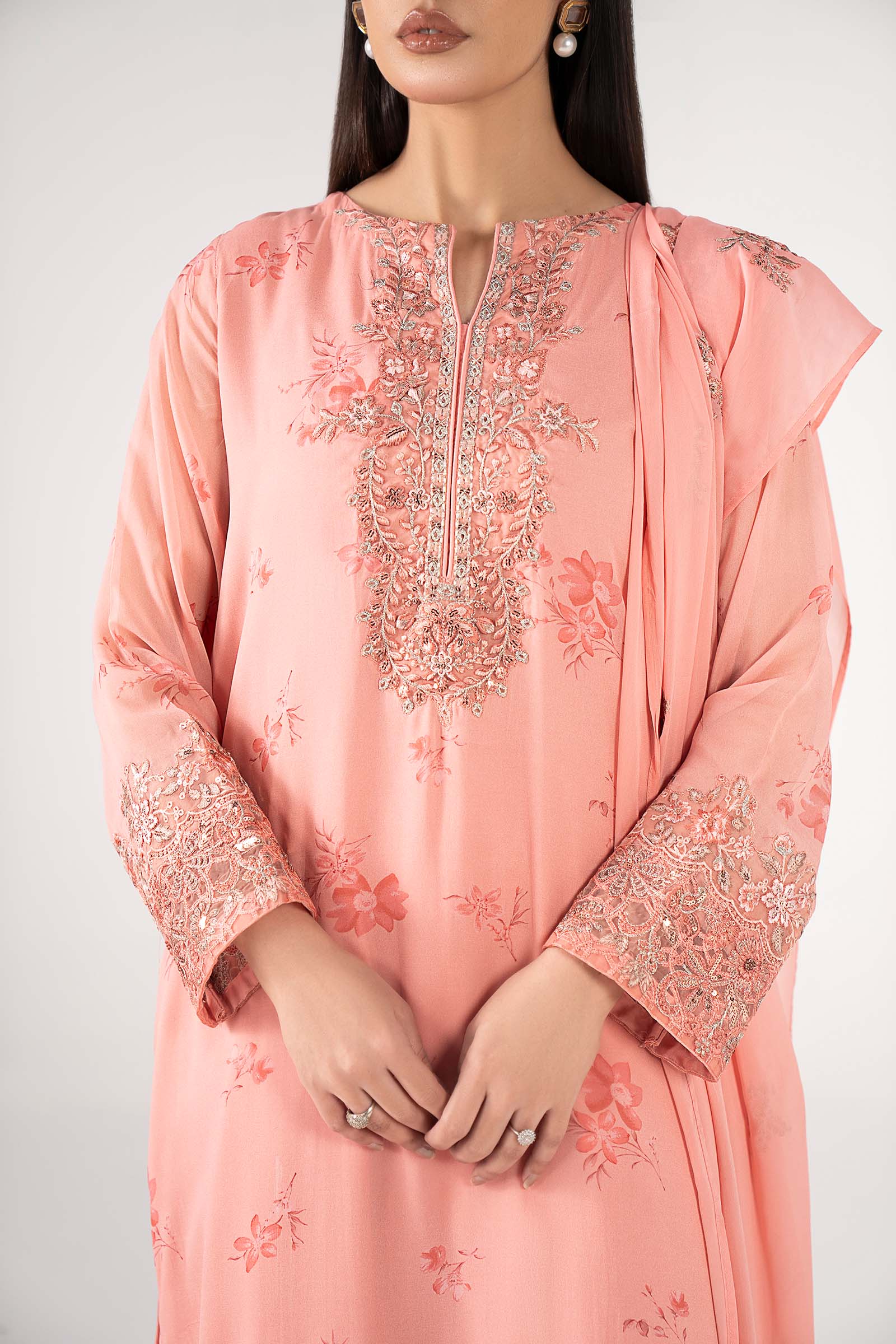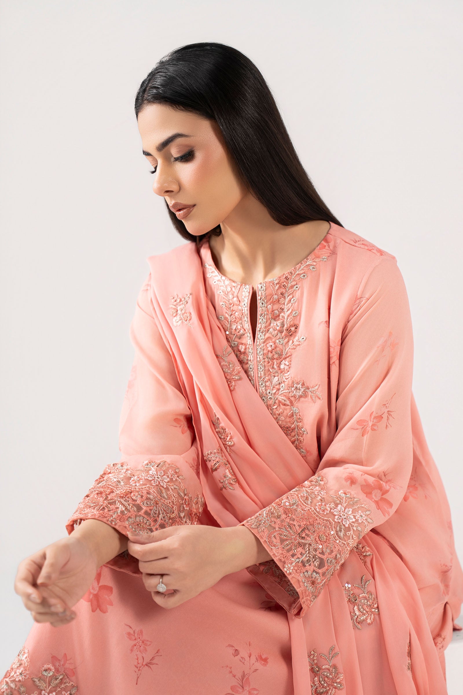 ShirtDigital Printed ShirtEmbroidered Round Neckline With SlitEmbroidered BorderDigital Printed Sleeves With Embroidered BorderColor: CoralFabric: ChiffonUndershirtDyed Sleeveless UndershirtColor: CoralFabric: Viscose Raw SilkShalwarDigital Printed ShalwarElasticated WaistbandColor: CoralFabric: Viscose Raw SilkDupattaSpray Embroidered DupattaColor: CoralFabric: ChiffonModel is wearing xs sizeNote: Dry Clean Only