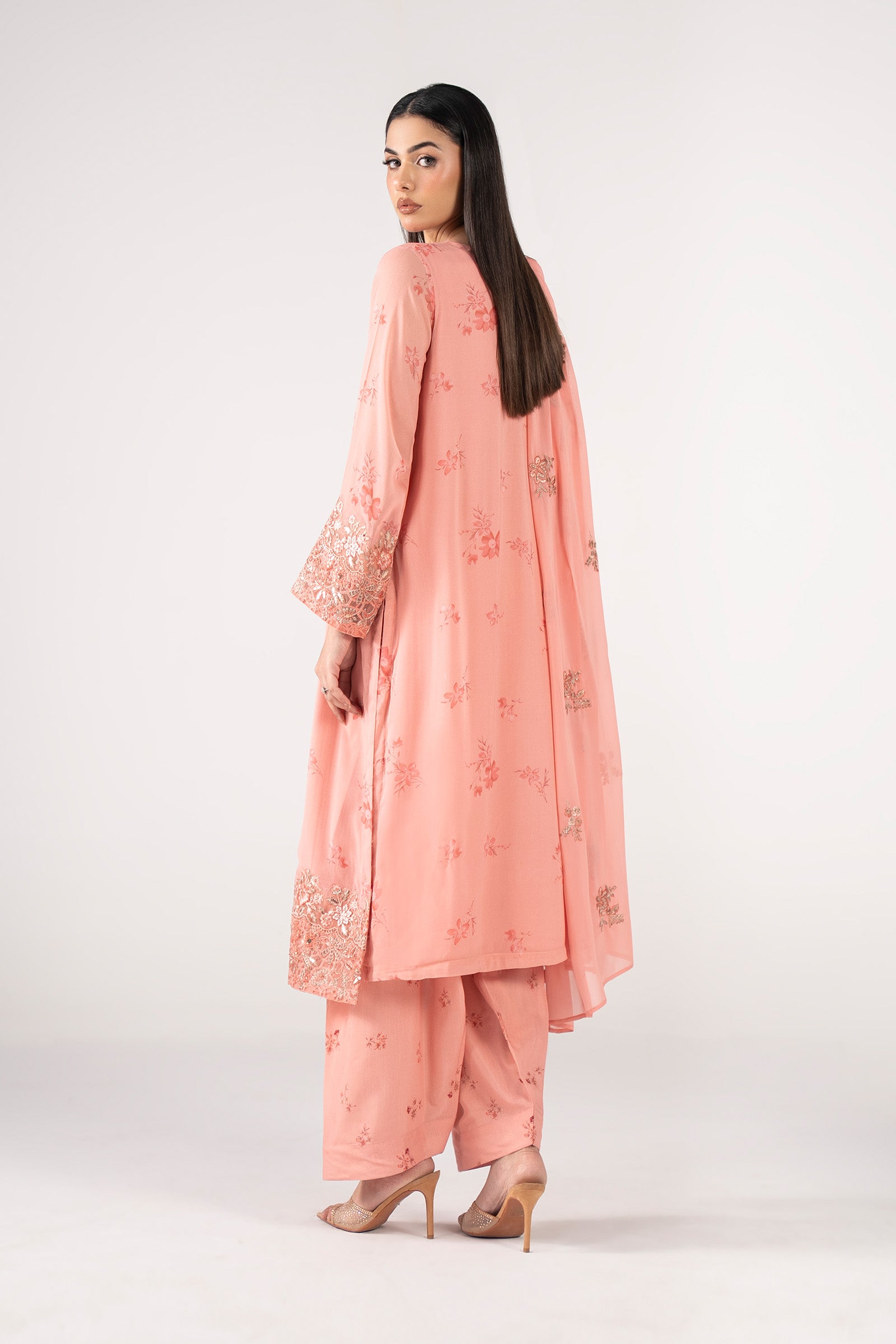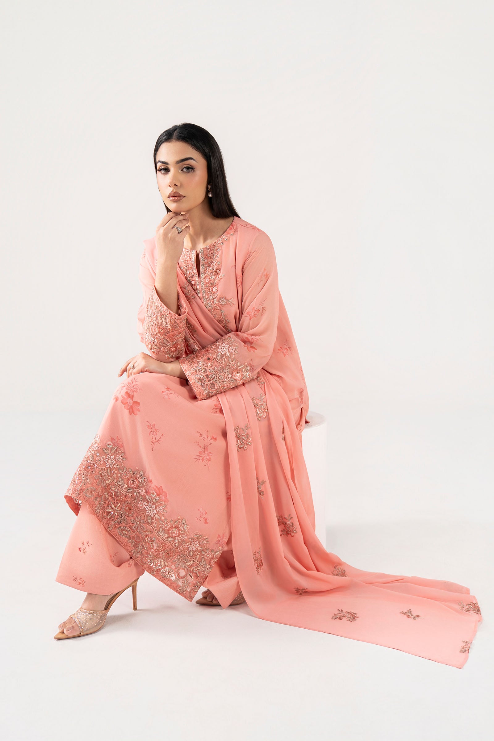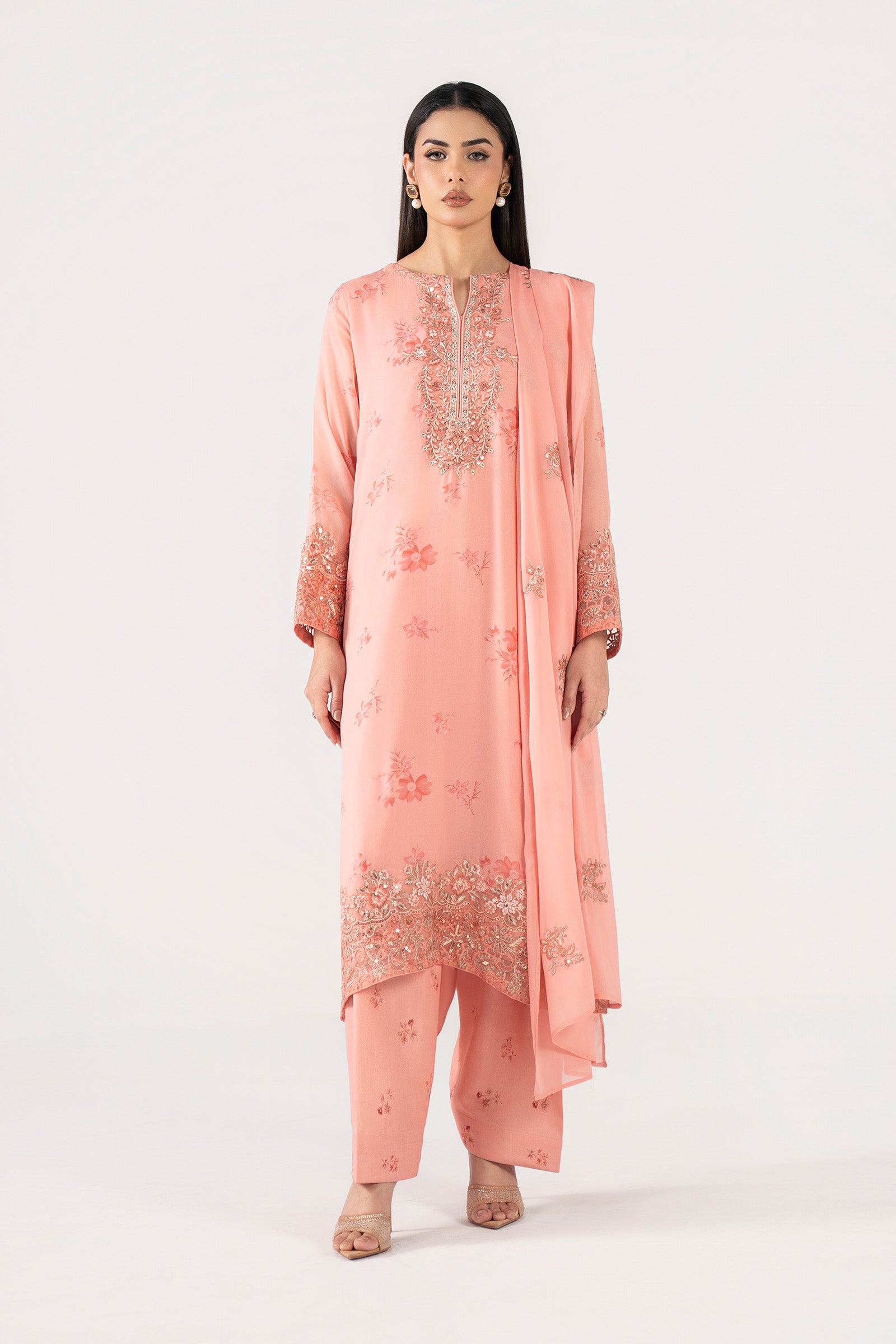 ShirtDigital Printed ShirtEmbroidered Round Neckline With SlitEmbroidered BorderDigital Printed Sleeves With Embroidered BorderColor: CoralFabric: ChiffonUndershirtDyed Sleeveless UndershirtColor: CoralFabric: Viscose Raw SilkShalwarDigital Printed ShalwarElasticated WaistbandColor: CoralFabric: Viscose Raw SilkDupattaSpray Embroidered DupattaColor: CoralFabric: ChiffonModel is wearing xs sizeNote: Dry Clean Only