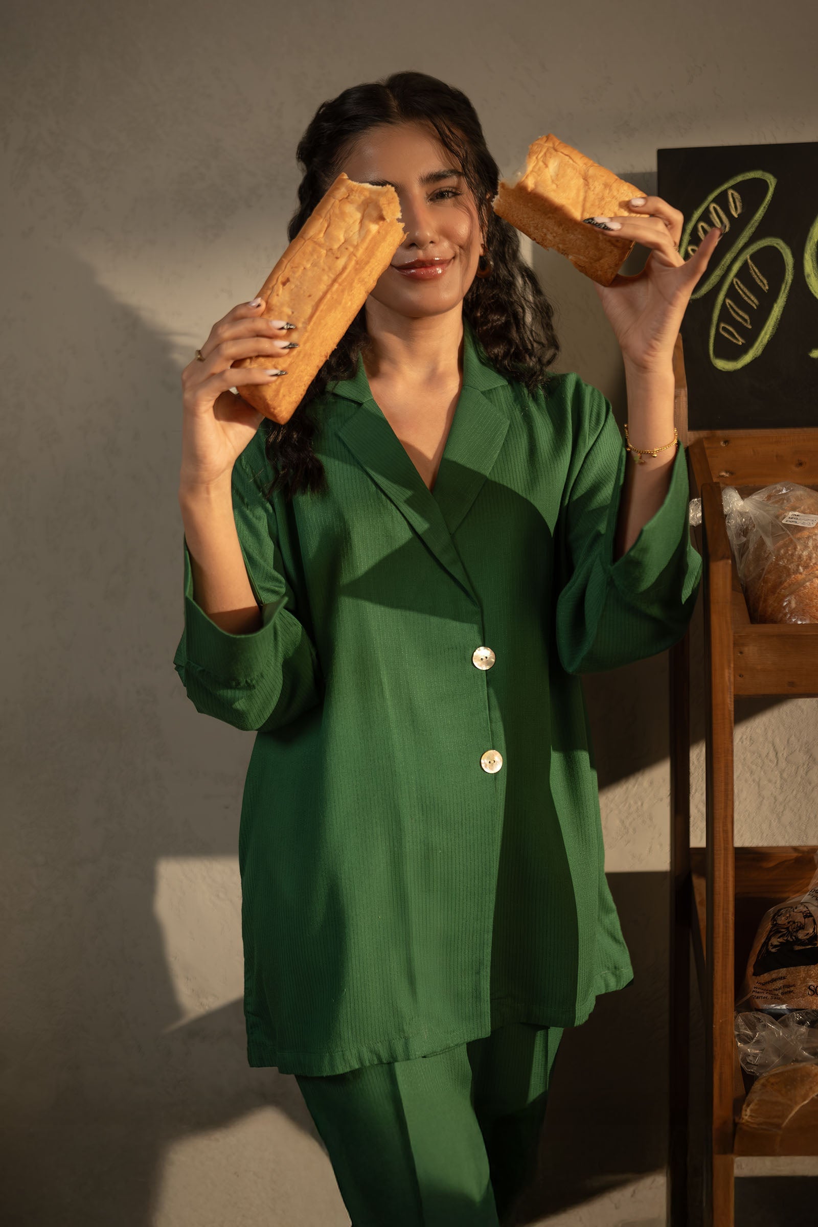 ShirtLoose-Fit Jacket Style TopNotch CollarStraight Cuffed SleevesColor: GreenFabric: RipstopFit: RegularTrousersStraight TrousersElasticated WaistbandColor: GreenFabric: RipstopFit: RegularModel is wearing xs sizeNote: Dry Clean Only