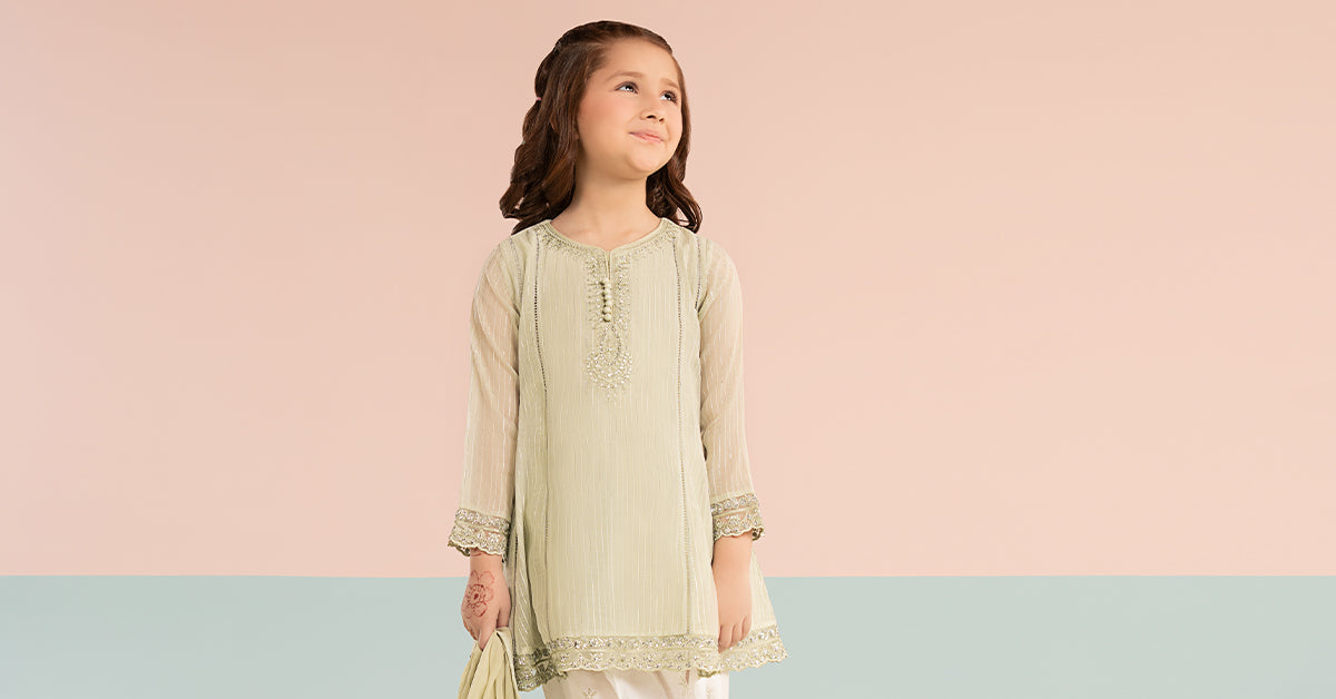 ShirtStriped Lurex FrockEmbroidered Neckline With Buttons DetailingLace Detailing On PanelsEmbroidered Side Seams & BorderStriped Lurex Sleeves With Embroidered BorderSleeveless Resham Undershirt (Attached)Color: GreenFabric: Striped Lurex Yarn Dyed ShalwarScreen Printed ShalwarElasticated WaistbandEmbroidered Border Color: GreenFabric: CambricDupattaDyed DupattaFour-Side Striped Lurex Yarn Dyed BorderColor: GreenFabric: ChiffonWork Details: Sequin & Thread EmbroideryModel is wearing 6-8 sizeNote: Dry Clean Only