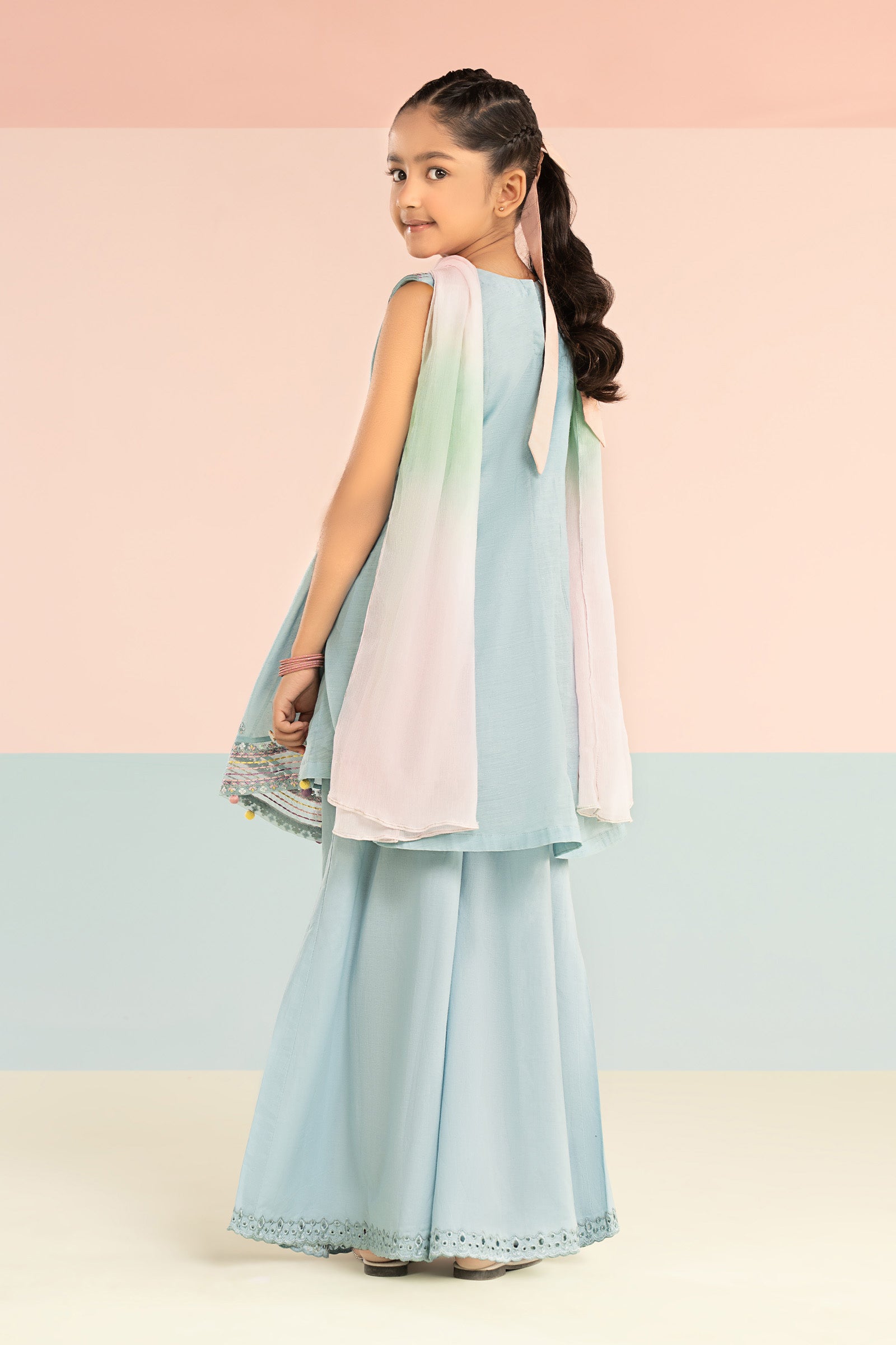 AngrakhaSleeveless Spray-Embroidered AgrakhaEmbroidered Neckline With Tassel DetailingEmbroidered Border With Stitches & Pearl DropsEmbroidered ArmholeSleeveless Resham Undershirt (Attached)Color: BlueFabric: Paper CottonTrouserSolid Dhaka TrouserElasticated WaistbandEmbroidered Border Color: BlueFabric: CambricDupattaPrinted DupattaFour-Side Lace BorderColor: MultiFabric: ChiffonWork Details: Sequin & Thread EmbroideryModel is wearing 6-8 sizeDisclaimer: Separate sleeves included.Note: Dry Clean Only