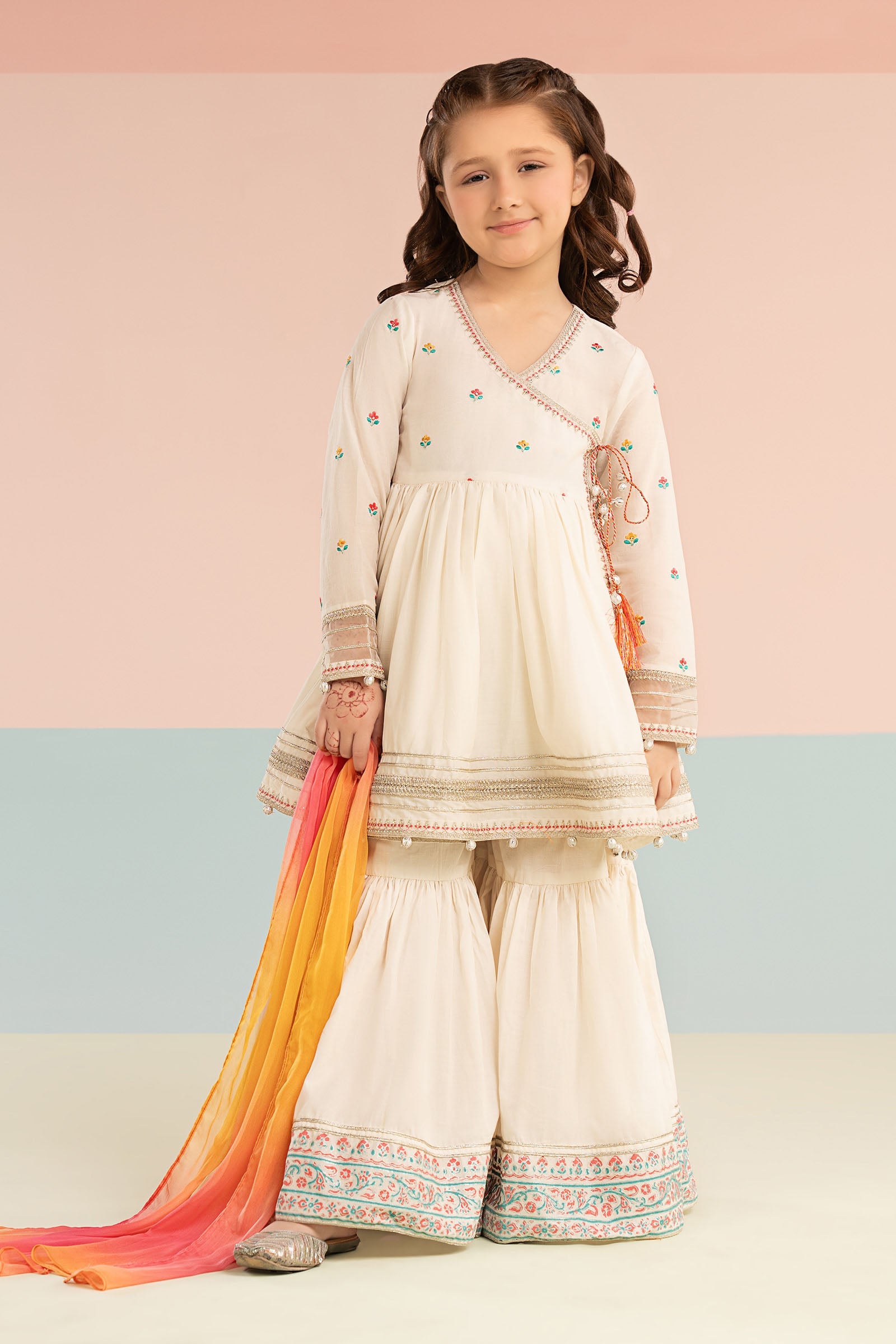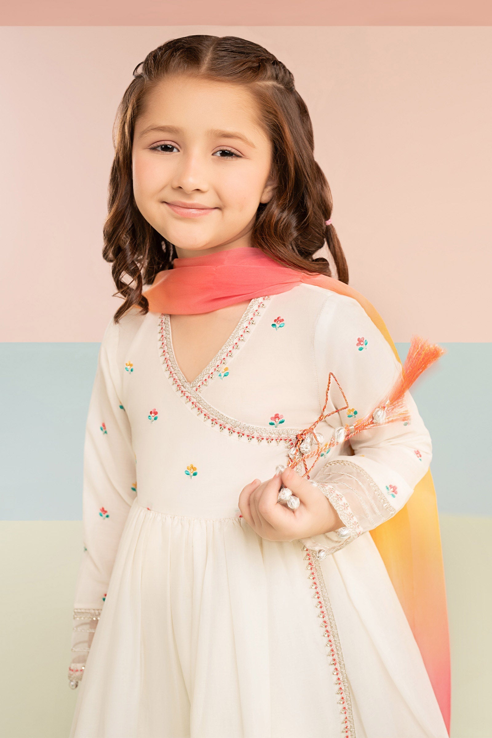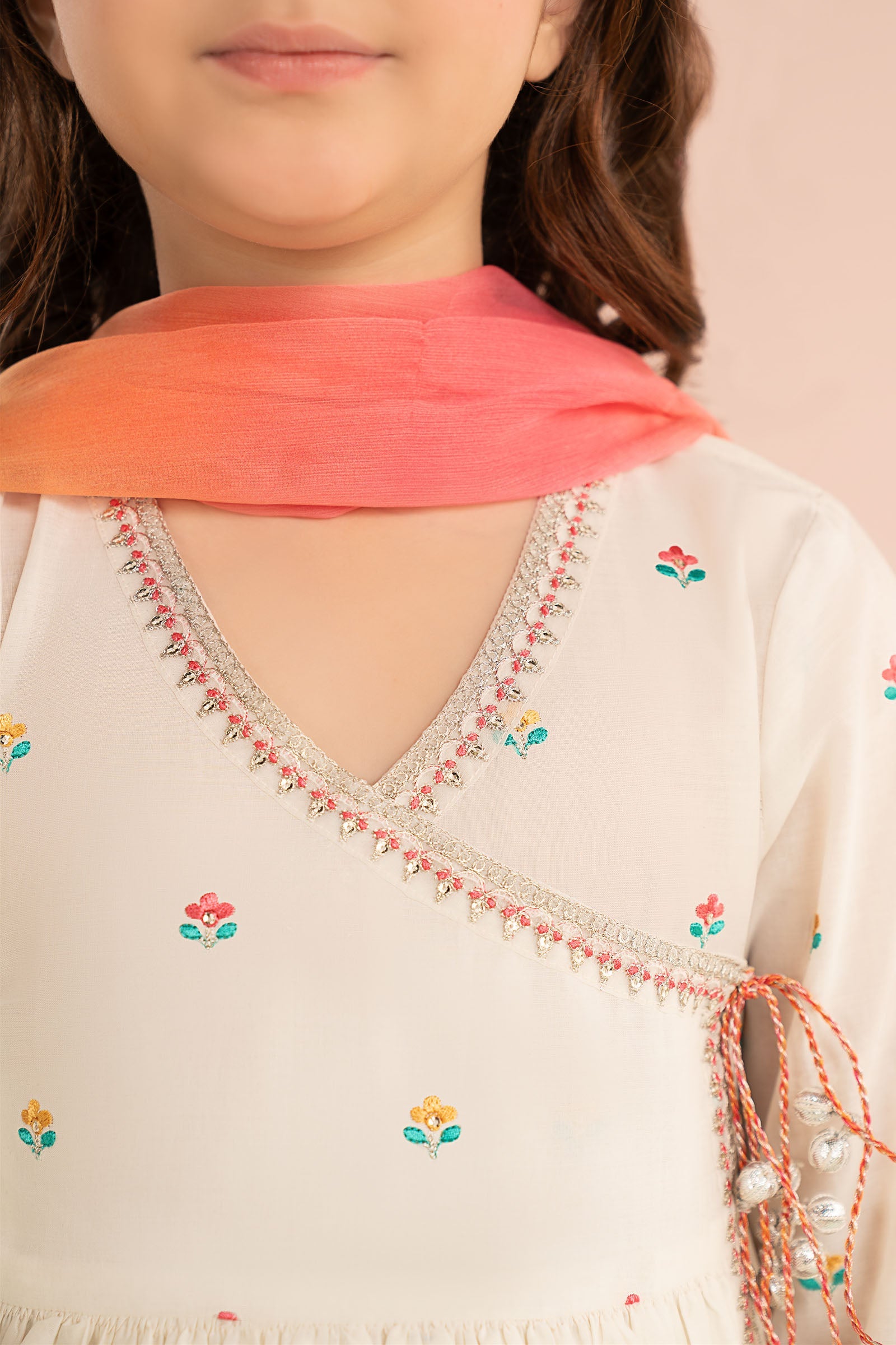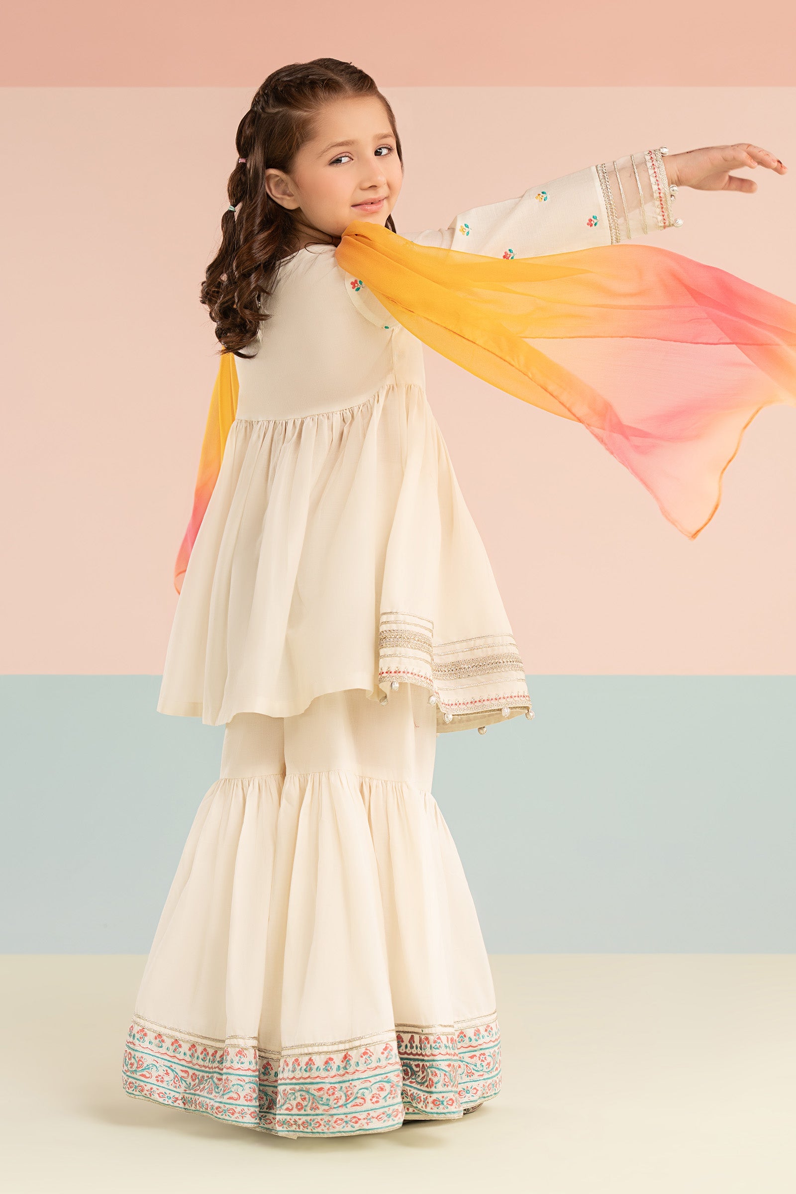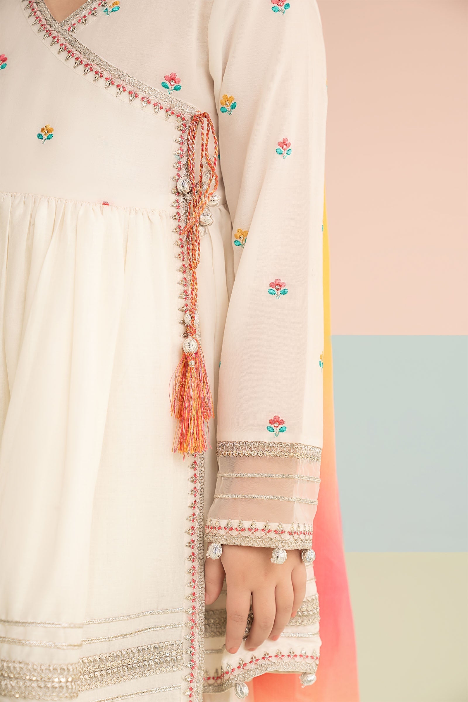 AngrakhaEmbroidered Neckline With Pintuck & Tassel DetailingSpray Embroidered BodiceEmbroidered Border With Gotta Lace DetailingEmbroidered Sleeves With Organza & Gotta Lace BorderGotta Balls Drop On Sleeves & BorderColor: Off-WhiteFabric: LawnTrouserSolid GhararaElasticated WaistbandBlock-Printed Border With Gotta Lace DetailingColor: Off-WhiteFabric: CambricDupattaPrinted DupattaColor: MultiFabric: ChiffonWork Details: Sequin, Tilla & Thread EmbroideryModel is wearing 6-8 sizeNote: Dry Clean Only